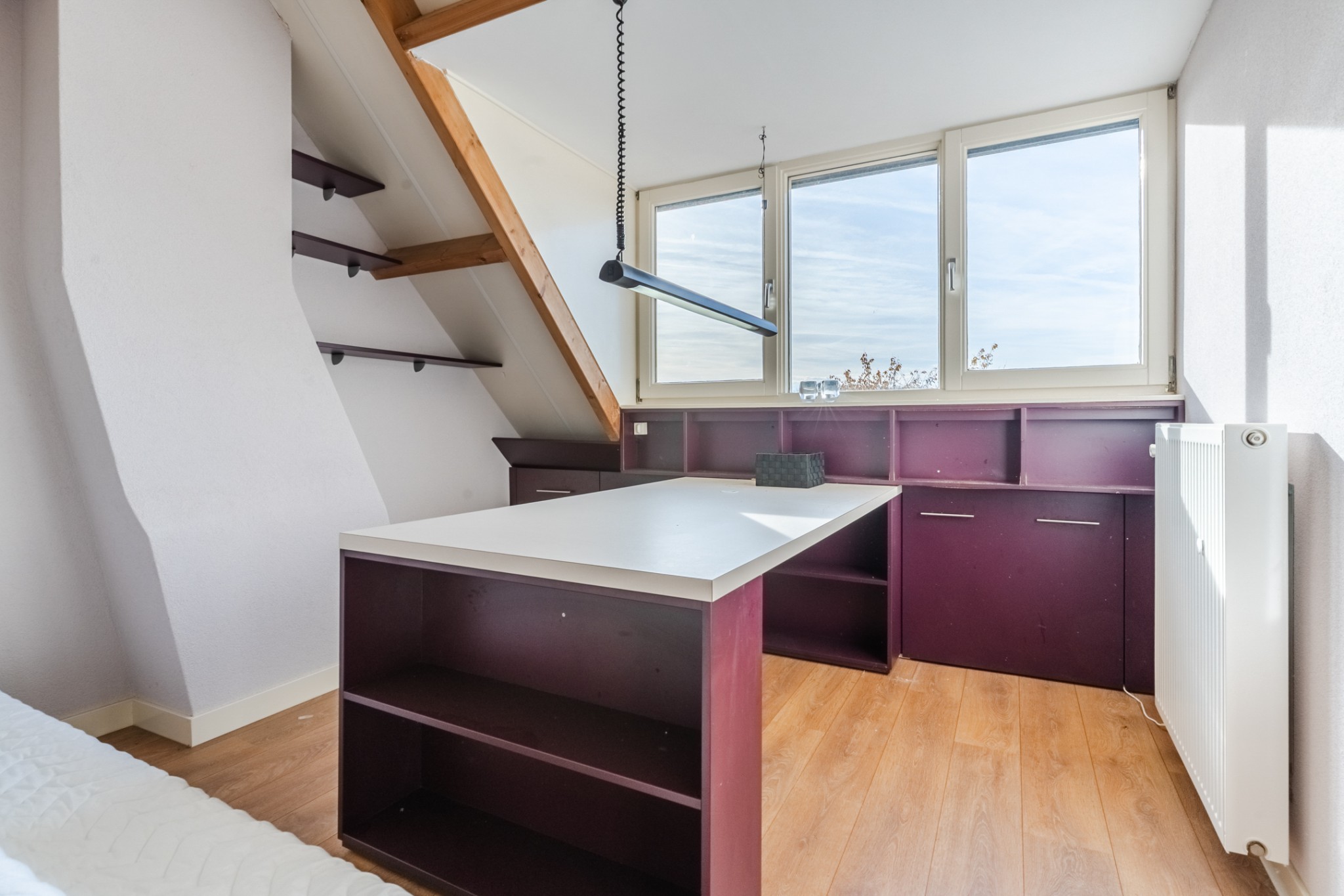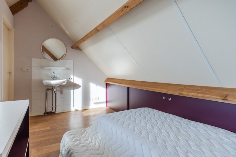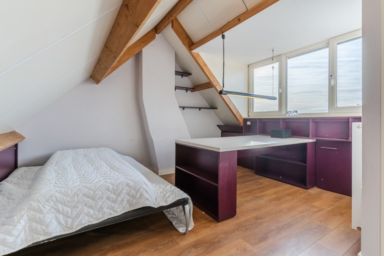 Zeer ruime slaapkamer, ± 13 m², met laminaatvloer, dakkapel, vaste wastafel, veel praktische bergruimte en een op maat gemaakt bureau.