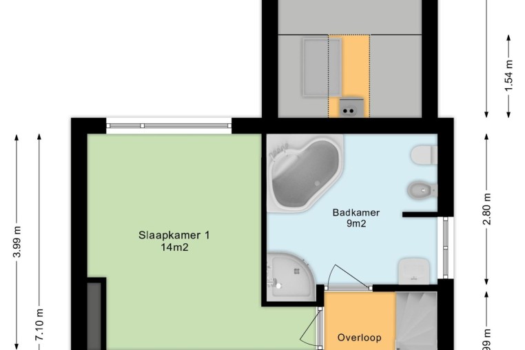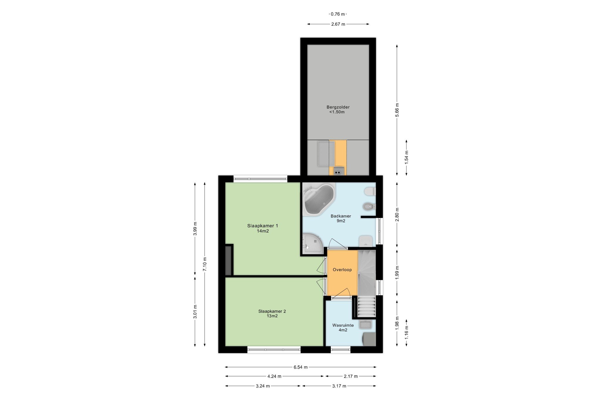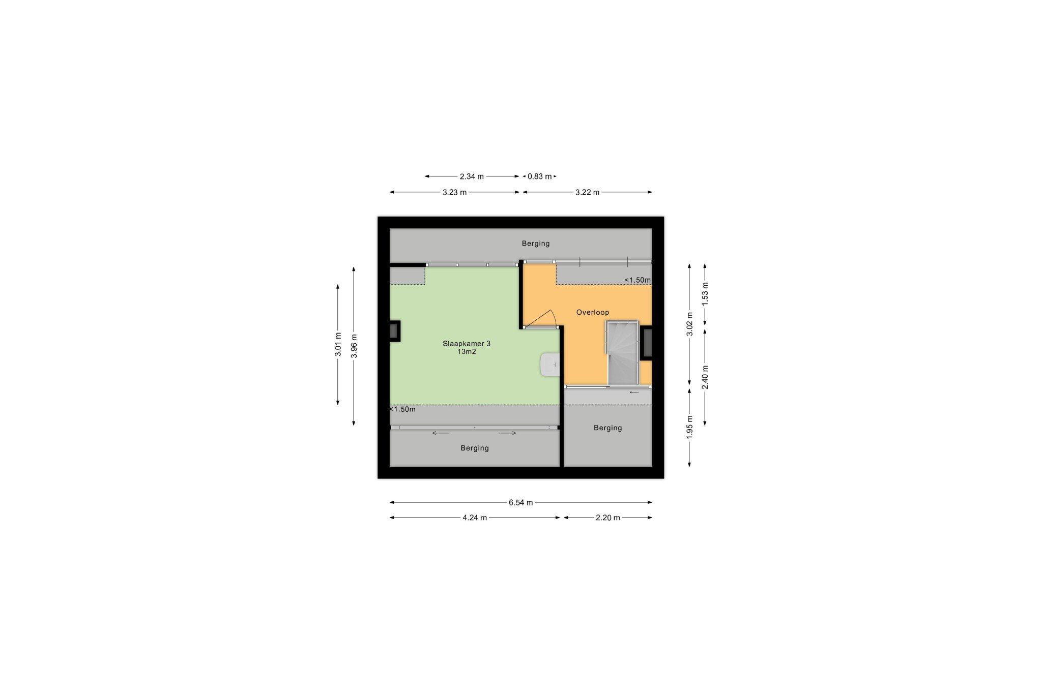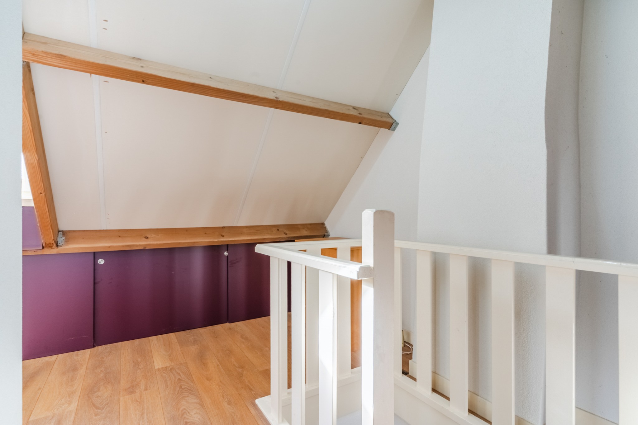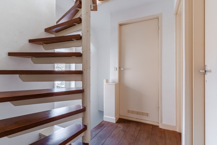 Ruime overloop met houten vloer en vaste trap naar 2e etage.