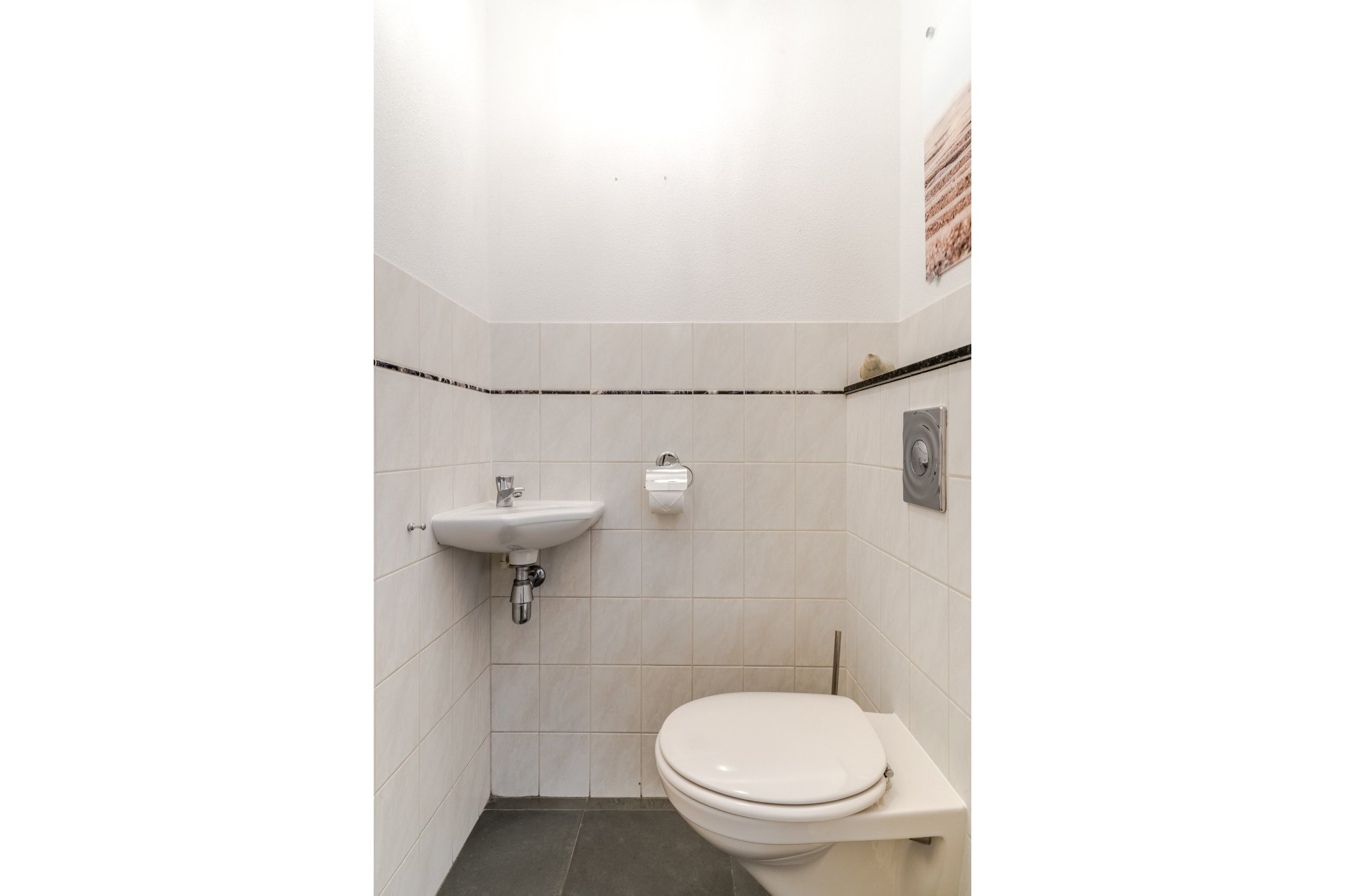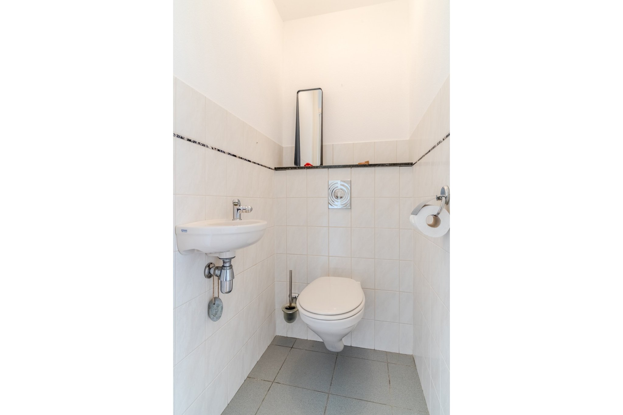 Deels betegelde toiletruimte met wandcloset en hoekfonteintje.