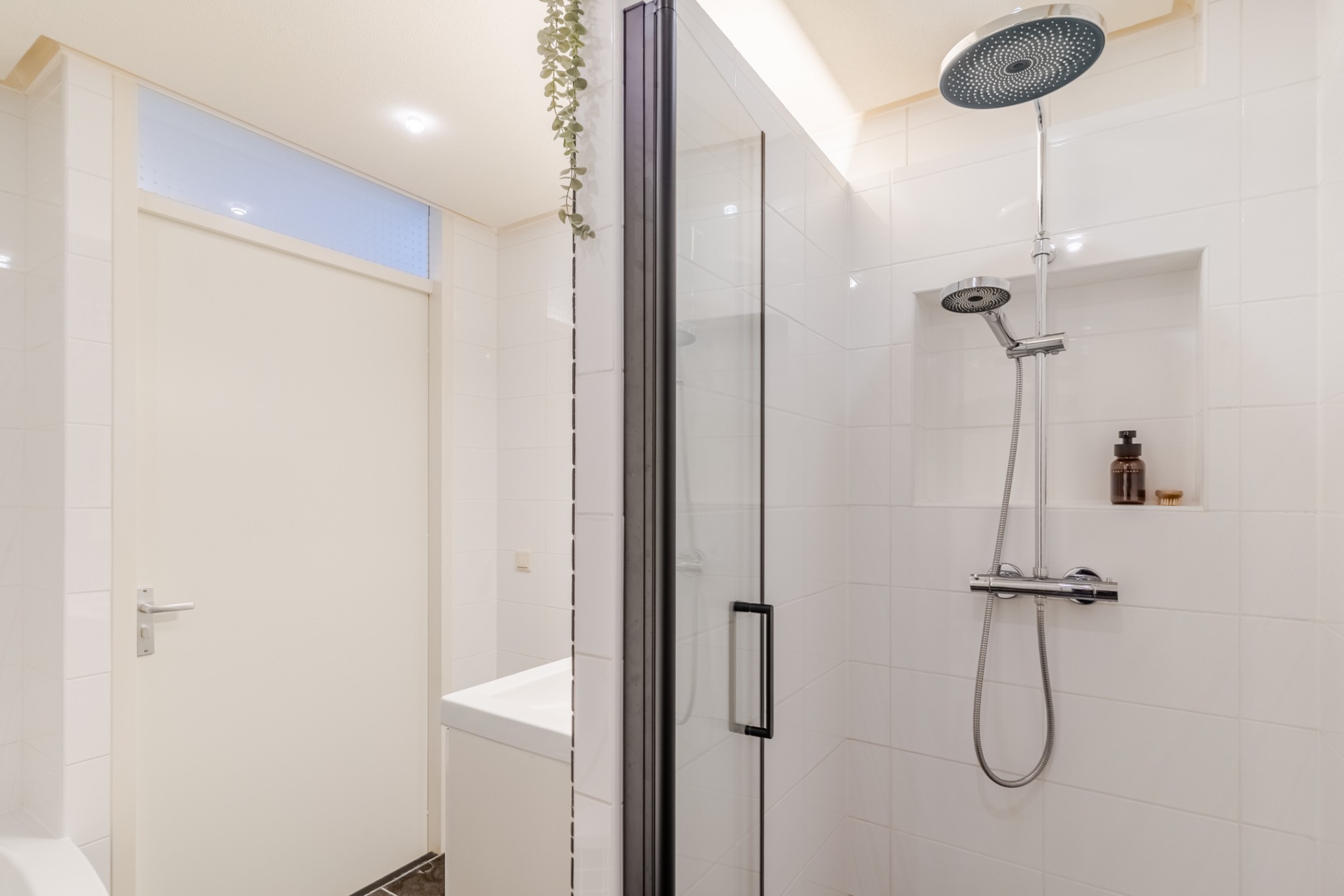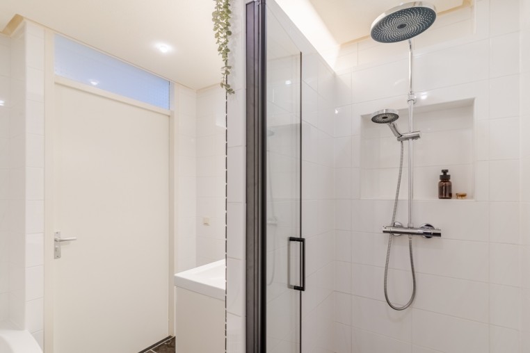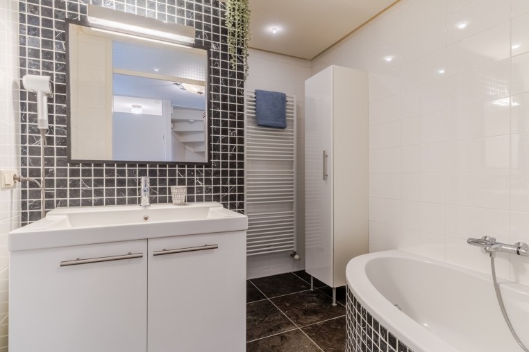 Geheel betegelde badkamer, ± 6 m², met inbouwspots, badmeubel met wastafel, wandkast, hoekbad, inloopdouche en vloerverwarming.