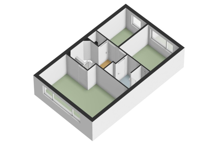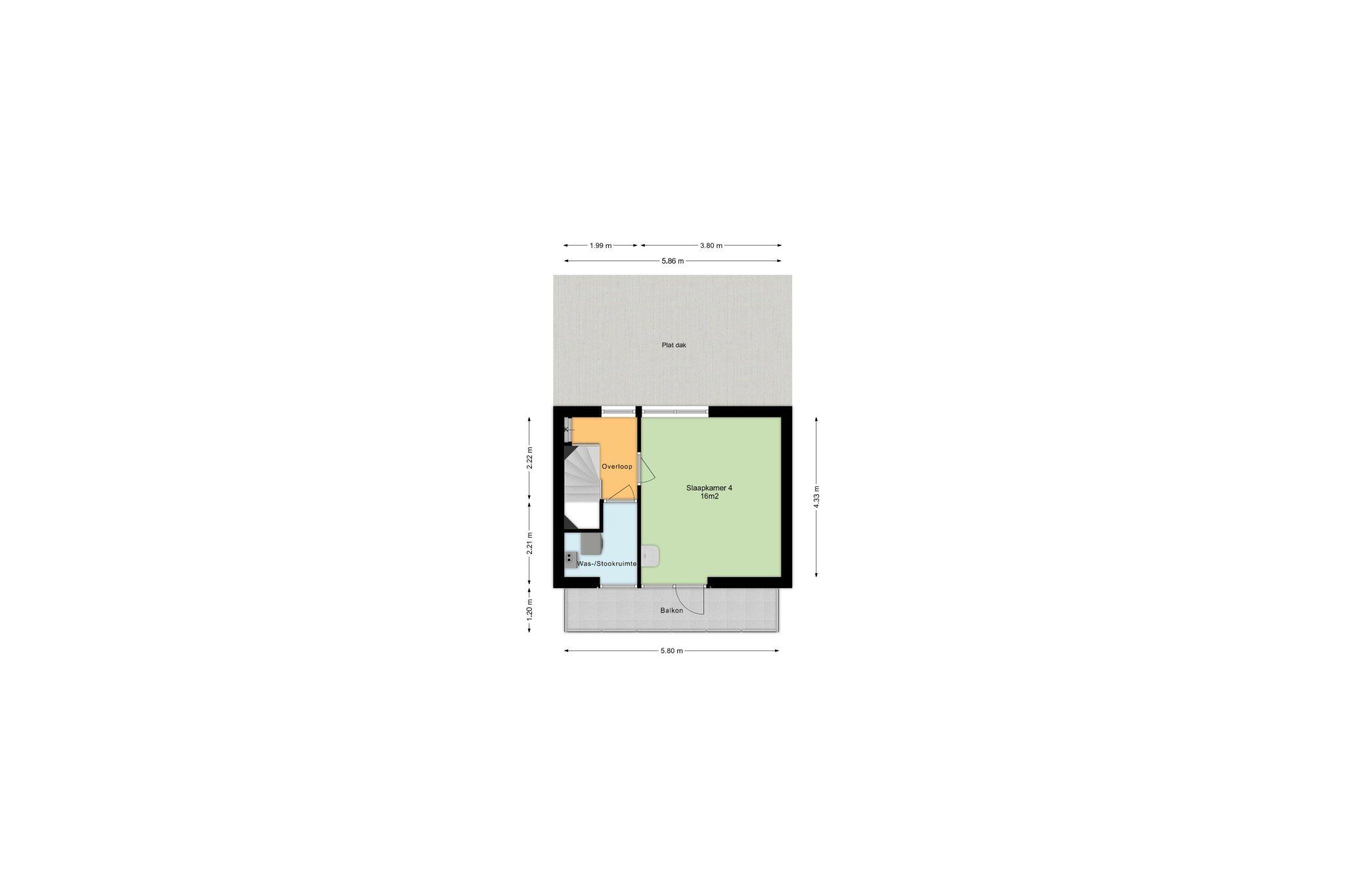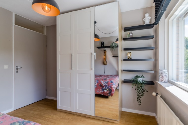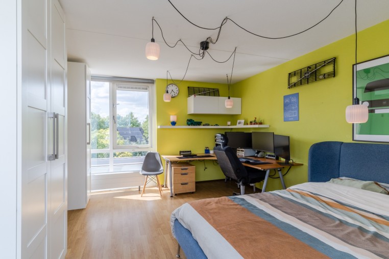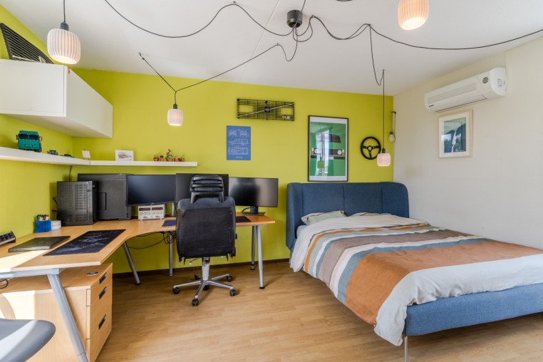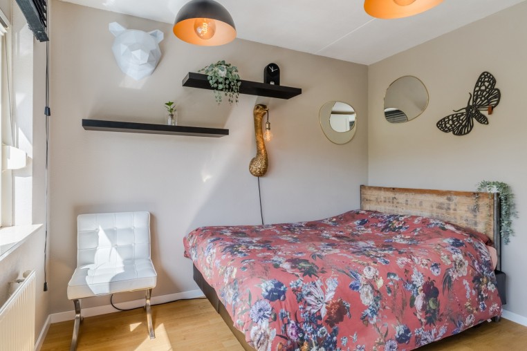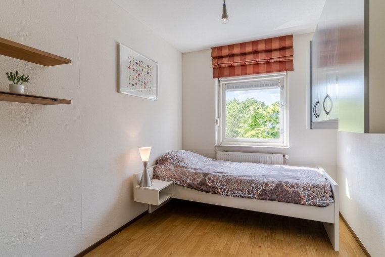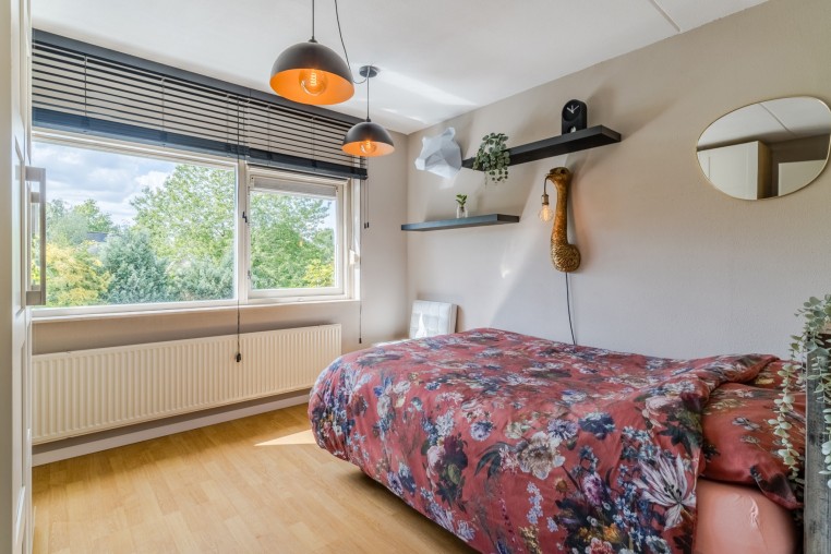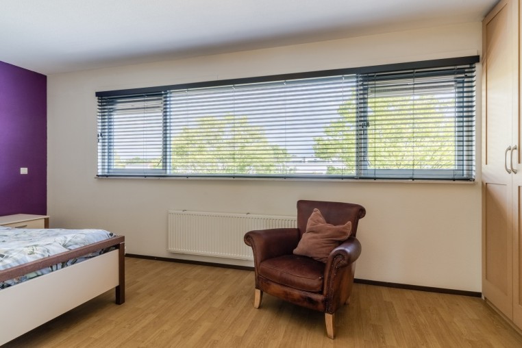 Slaapkamer, ± 7 m², met laminaatvloer en handmatig bedienbare screen.