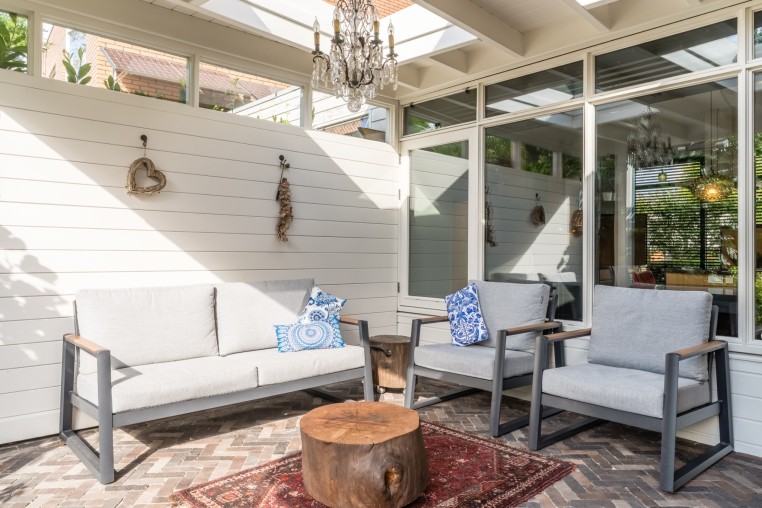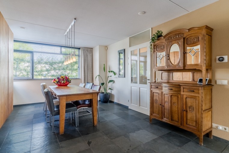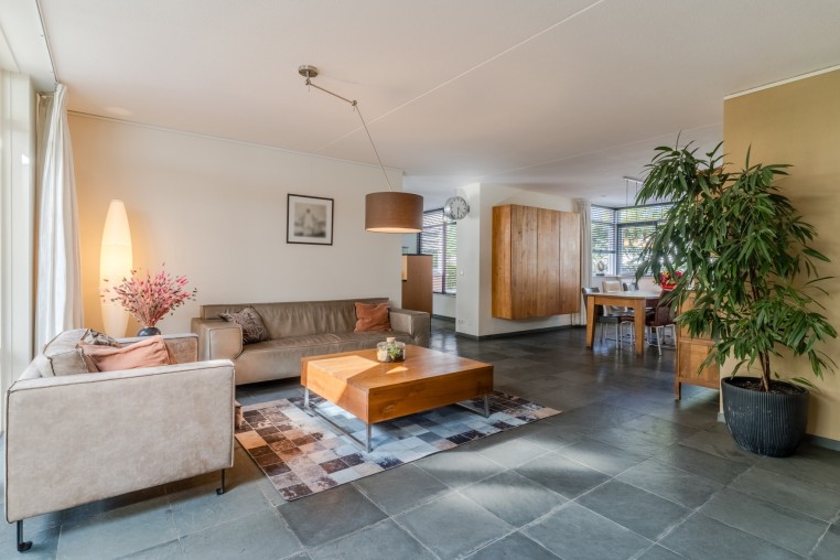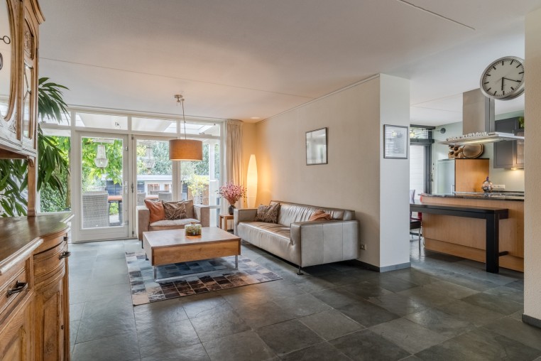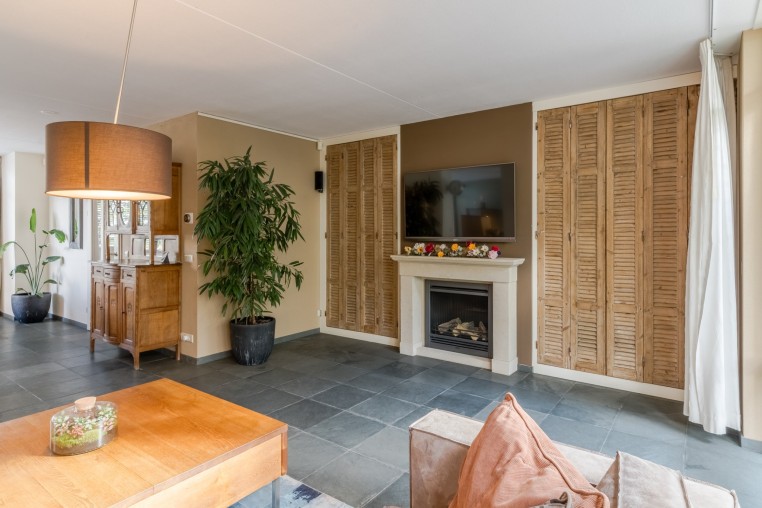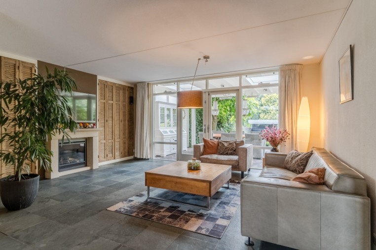 Royale living, ± 43 m², voorzien van natuurstenen vloer met vloerverwarming, gezellige gashaard en dubbele openslaande deuren naar de tuin met fraaie overkapping. Optimaal genieten van alle jaargetijden.