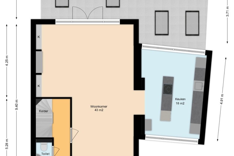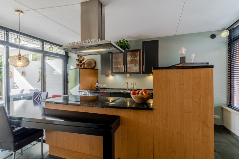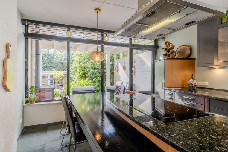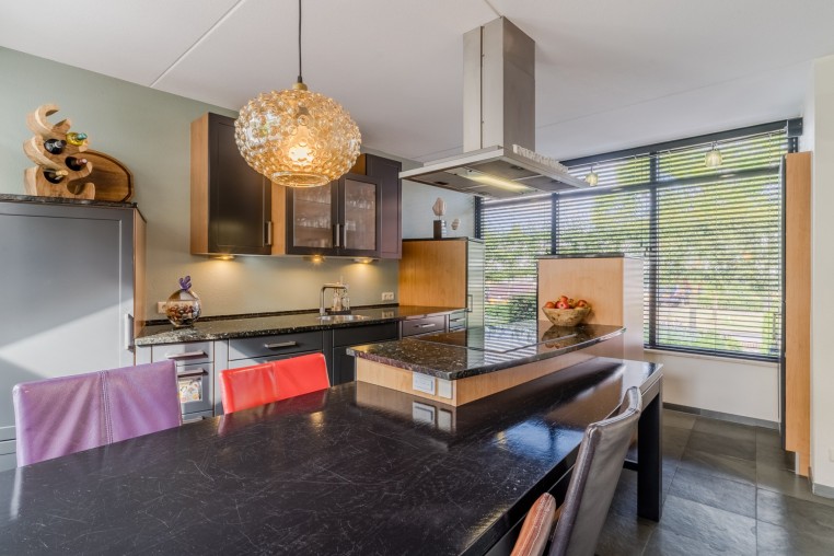 Semi-open keuken, ± 18 m², met moderne inrichting, kookeiland, volop kastruimte, granieten aanrechtblad en inbouwapparatuur, t.w.: inductiekookplaat, afzuigkap, stoomoven, koelkast, vaatwasser en Quooker.