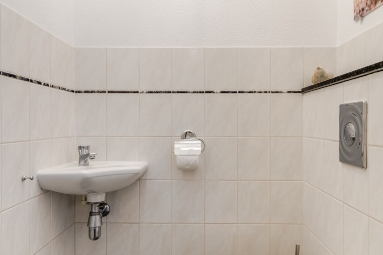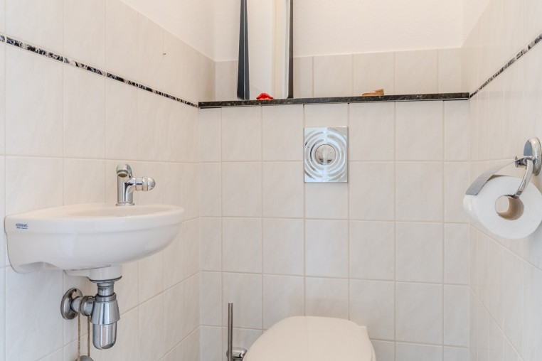 Separate, deels betegelde toiletruimte met wandcloset en fonteintje.
