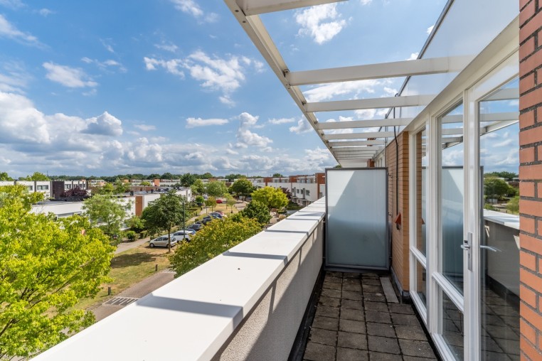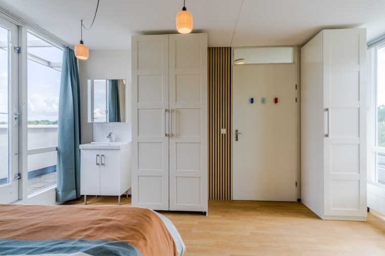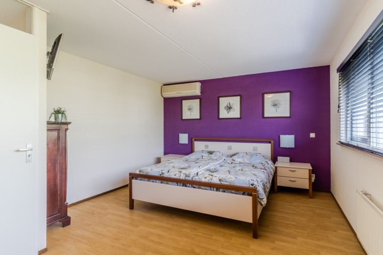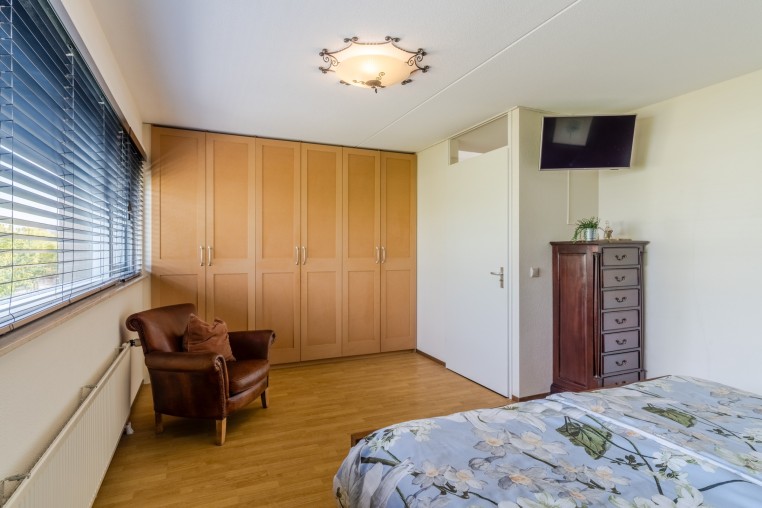 Riante slaapkamer, ± 20 m², met laminaatvloer, inbouwkast, airconditioning en tv-aansluiting.