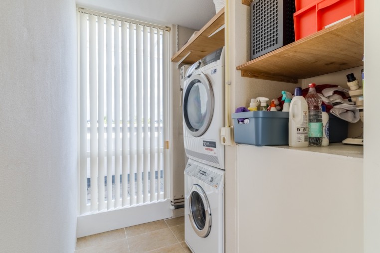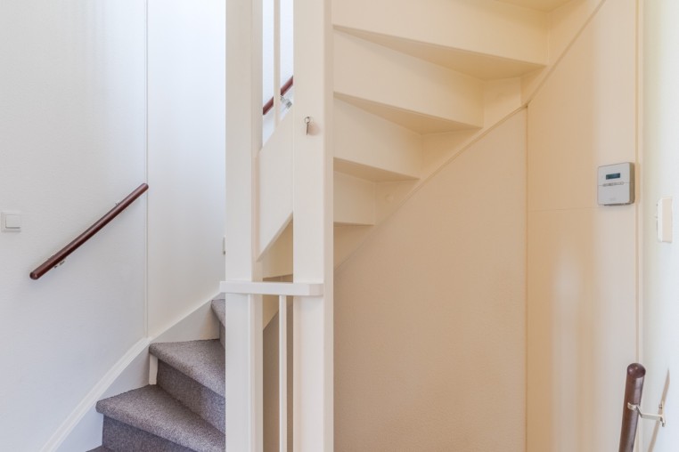 Ruime overloop met tegelvloer. Was-/stookruimte met aansluitingen wasapparatuur en combiketel (Nefit Topline ± 2008/2018).