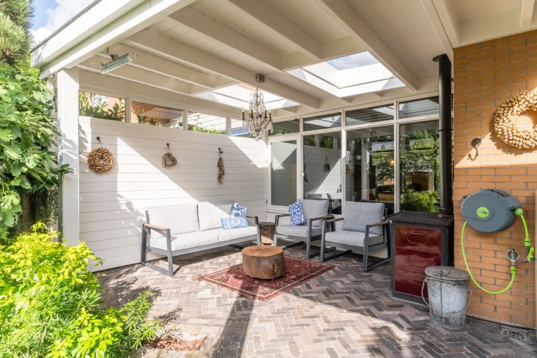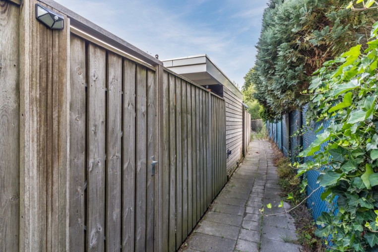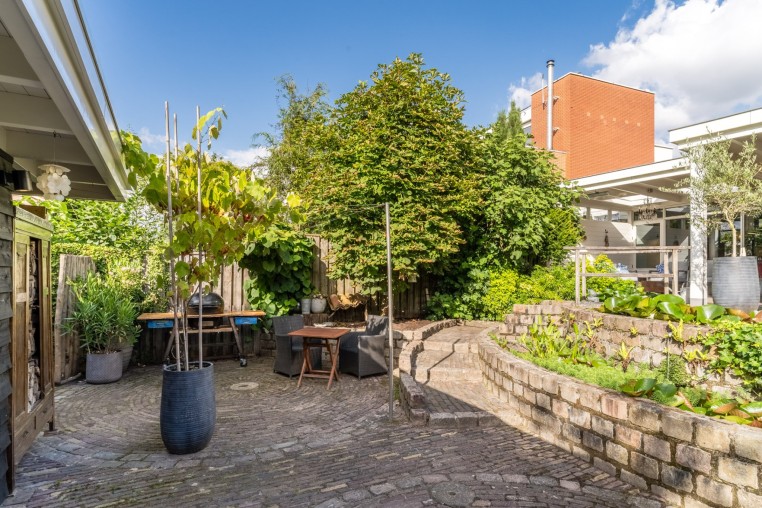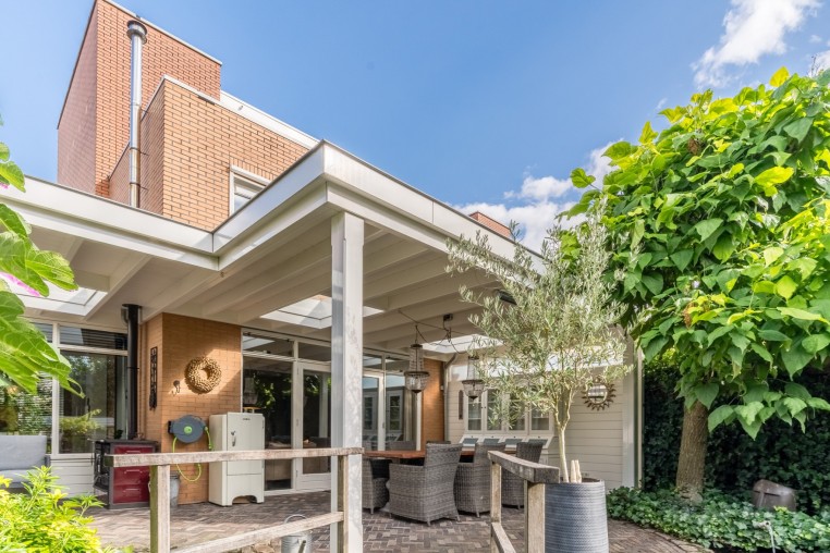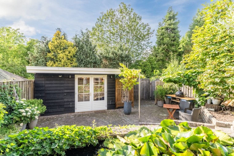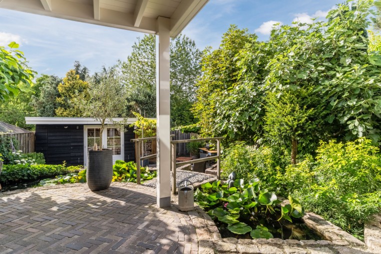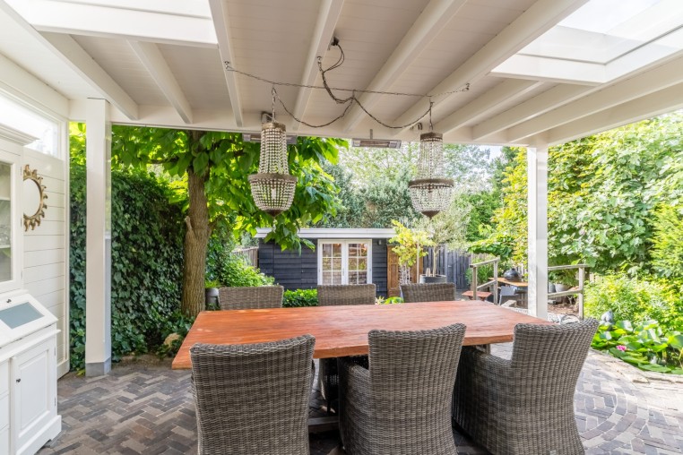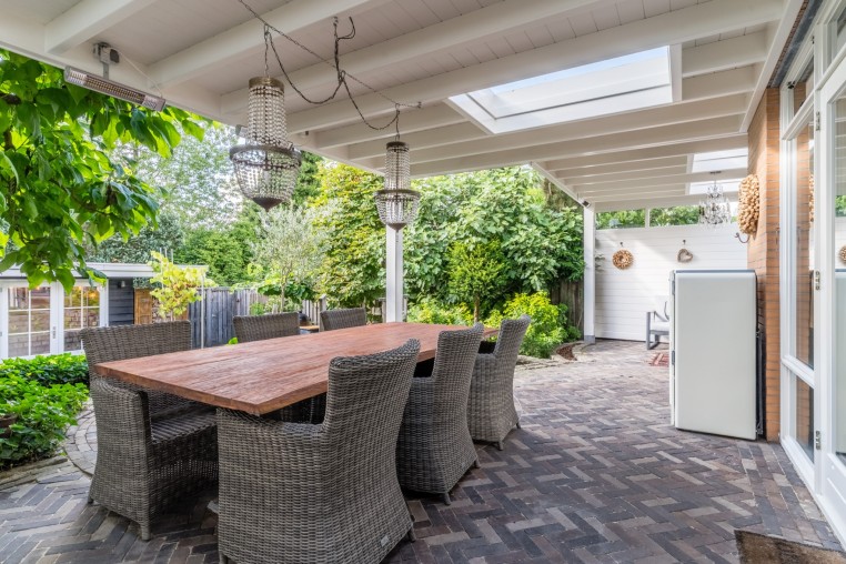 Fraai aangelegde achtertuin met verandaterras met royale overkapping, multifunctionele ruimte, berging en poort naar achterom. Een tuin waarvan je in alle jaargetijden optimaal kunt genieten, mede door de overkapping. De overkapping is voorzien van houtkachel/oven, elektra, verwarming en 4 lichtstraten.