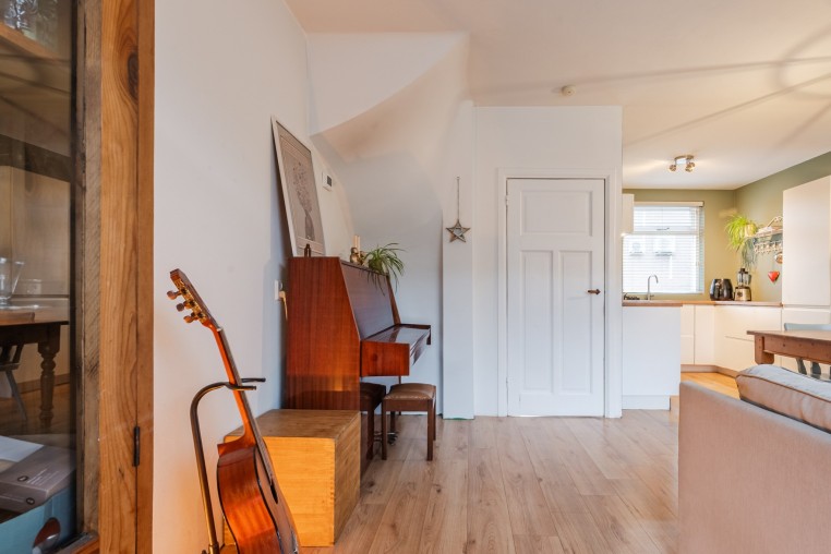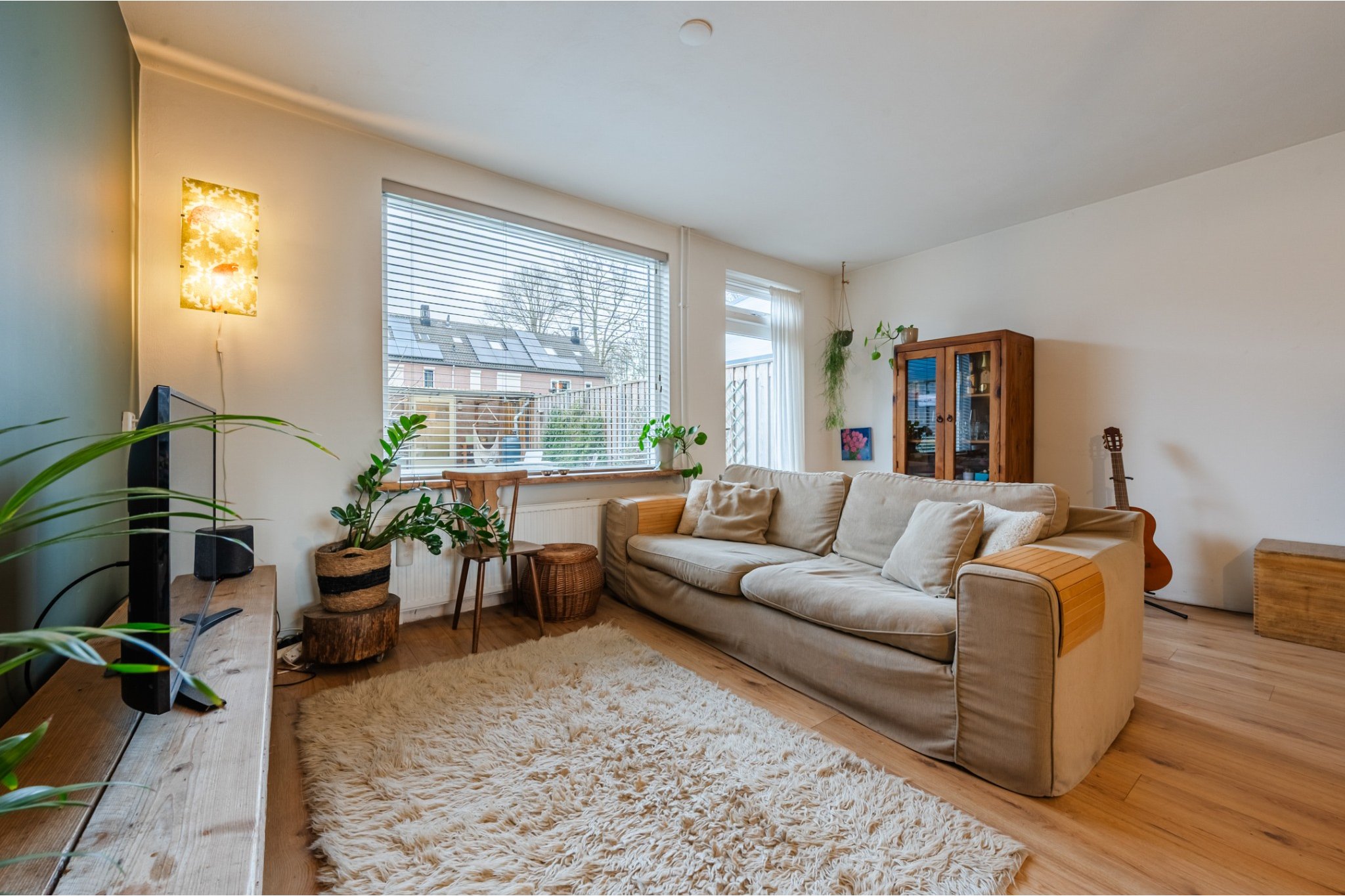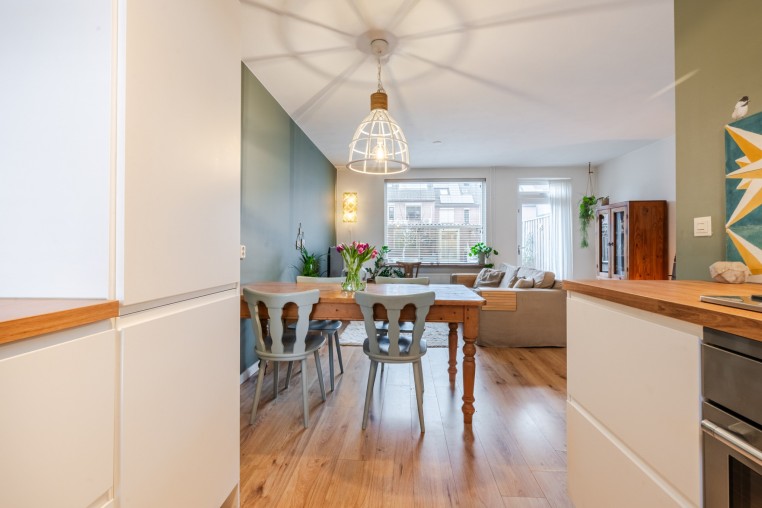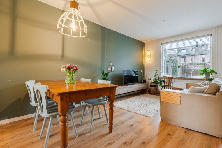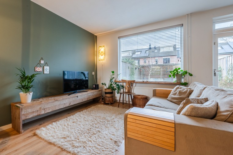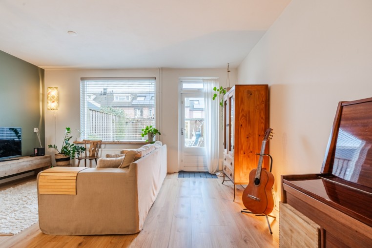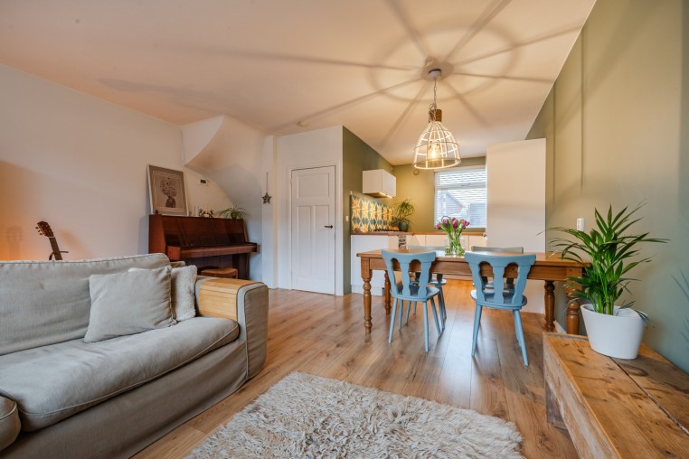 Sfeervolle woonkamer, ± 31 m² (incl. keuken), met laminaatvloer en deur naar de fijne achtertuin.