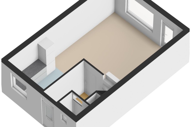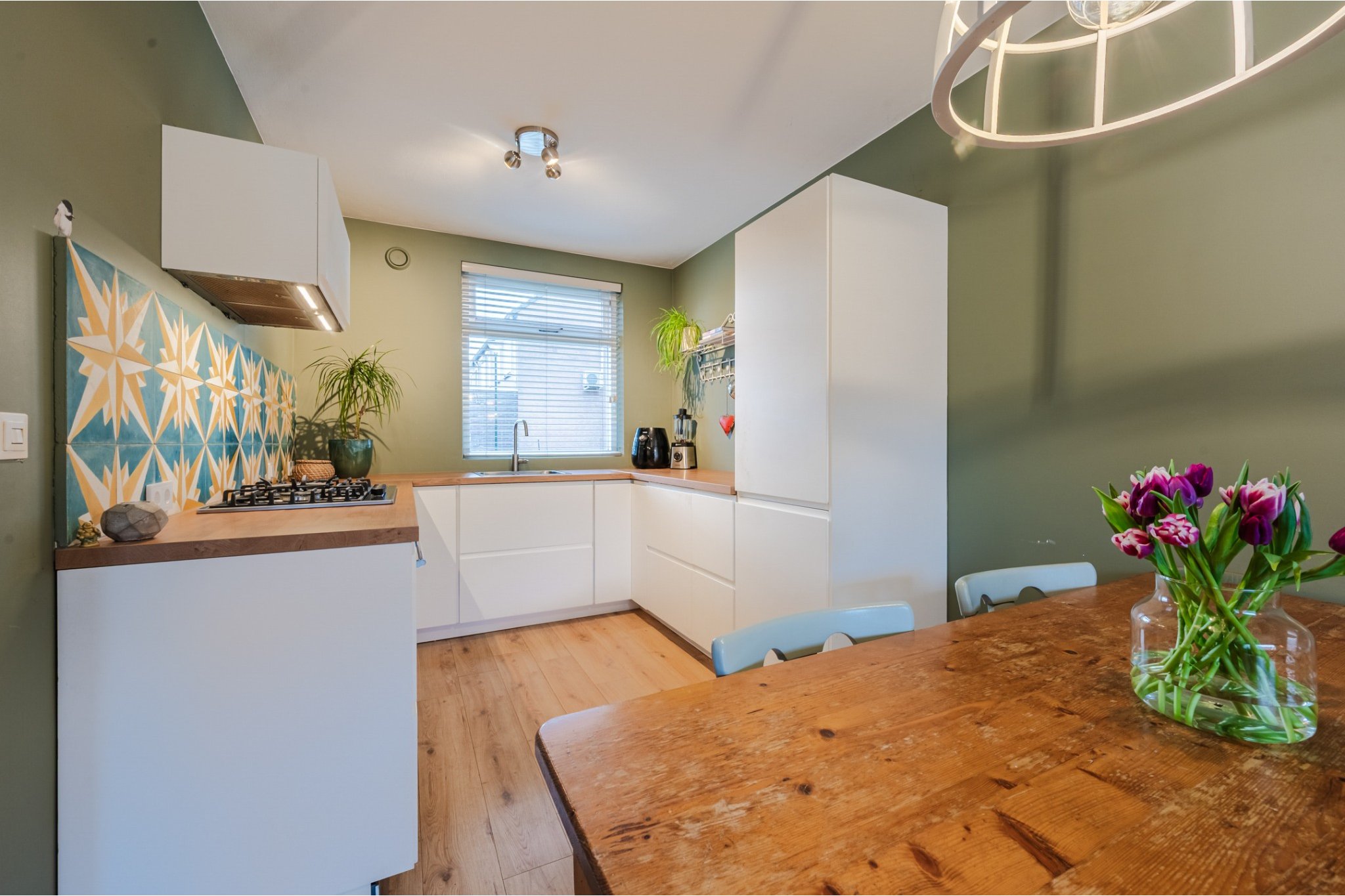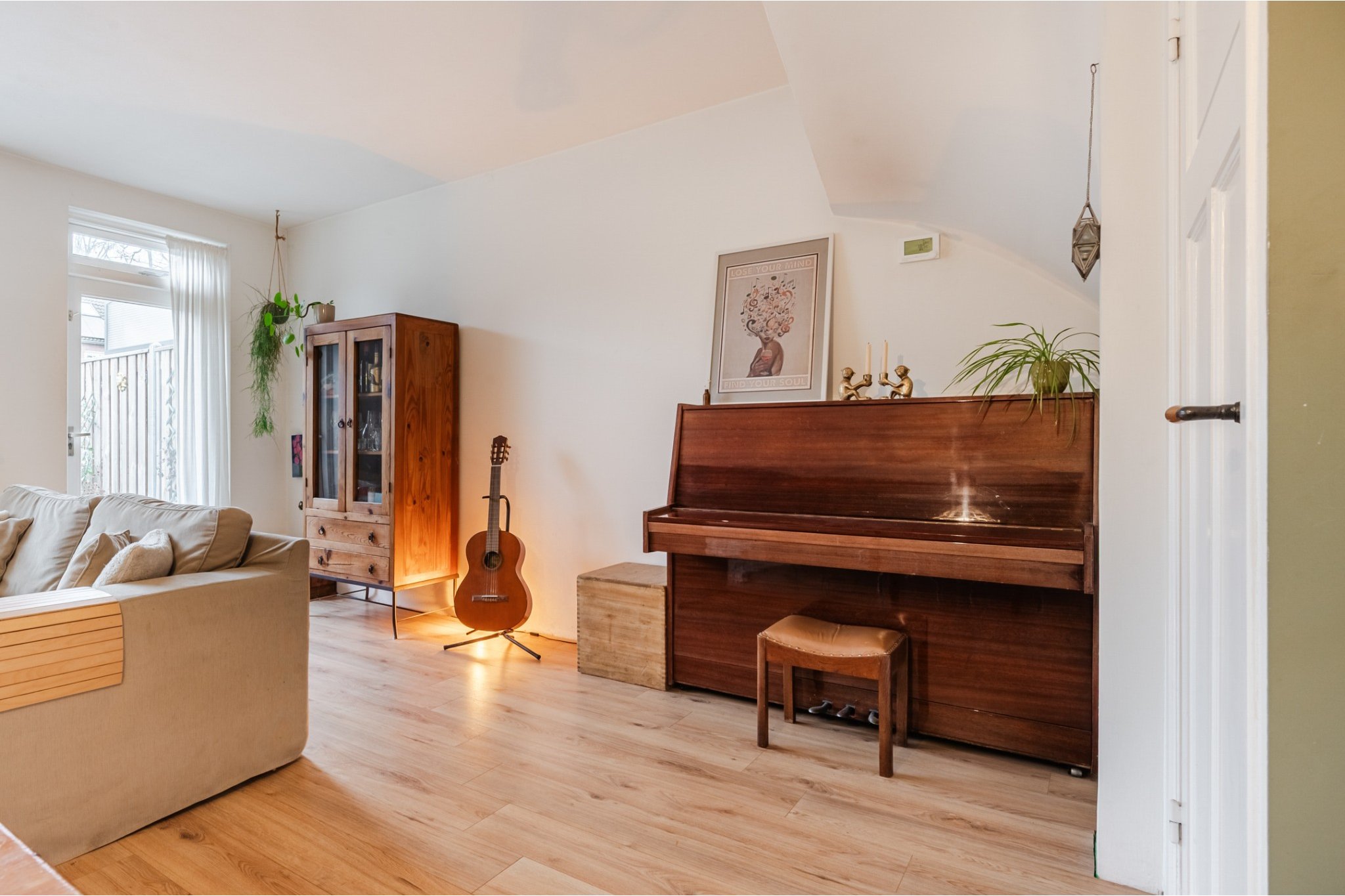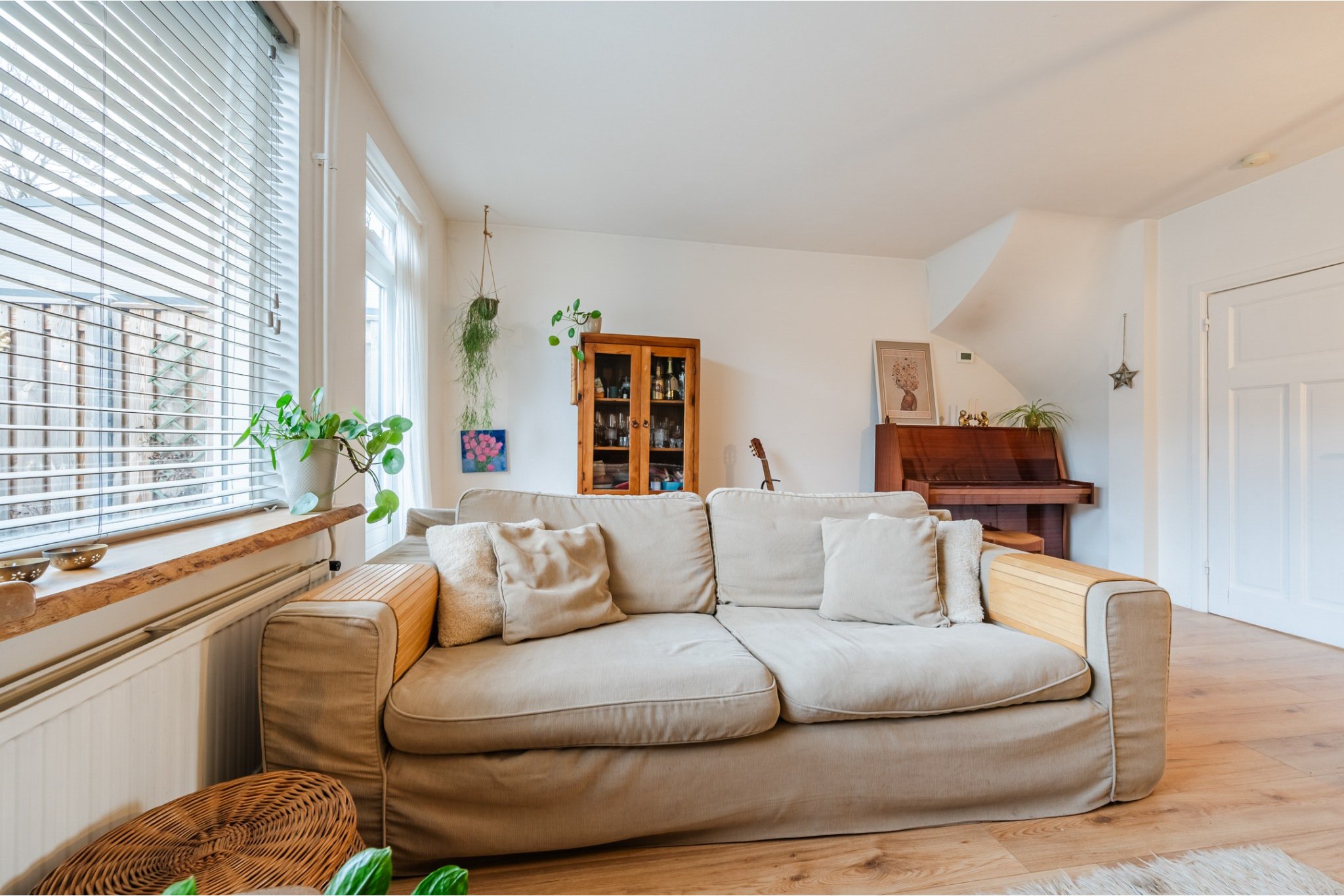 Sfeervolle woonkamer, ± 31 m² (incl. keuken), met laminaatvloer en deur naar de fijne achtertuin.