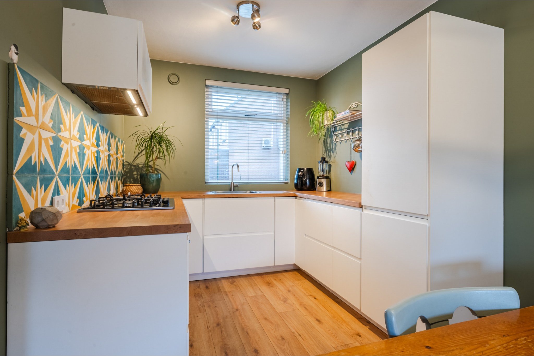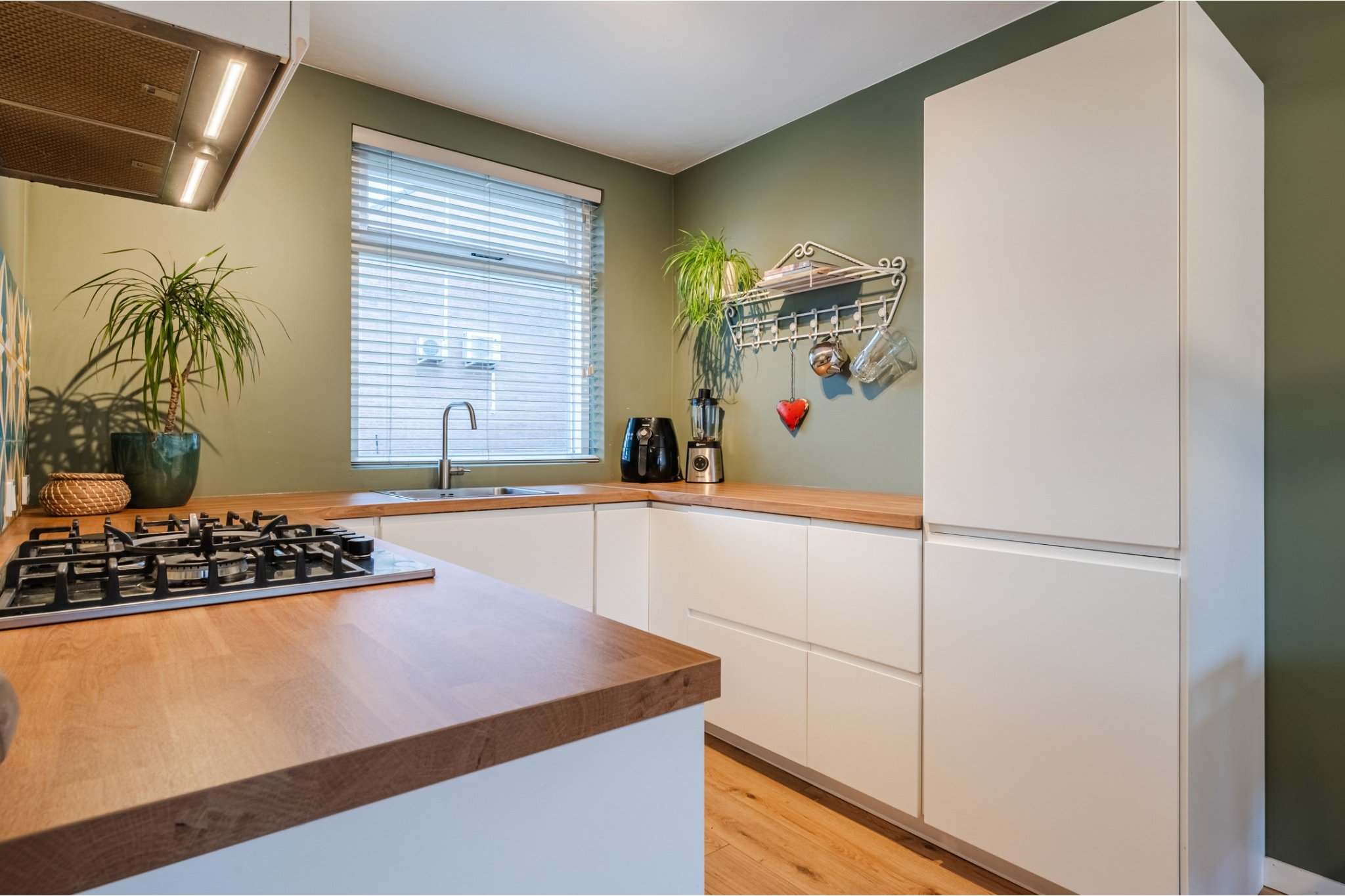 Moderne, luxe open keuken in U-vorm met laminaatvloer, volop kastruimte en inbouwapparatuur, t.w.: 5-pits gaskookplaat, afzuigkap, combi-oven, koel-/vriescombinatie en vaatwasser.