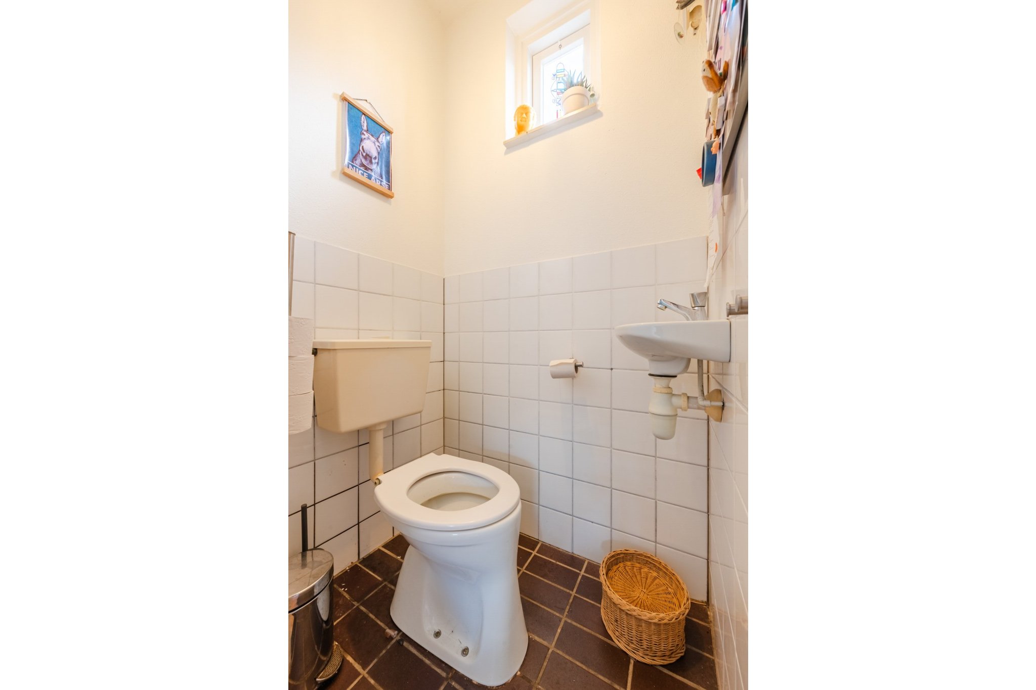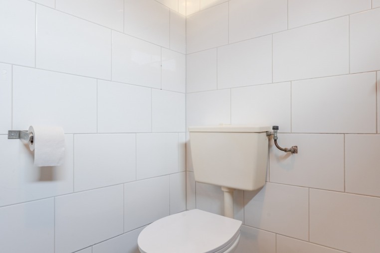 Deels betegelde toiletruimte met wandcloset en fonteintje.