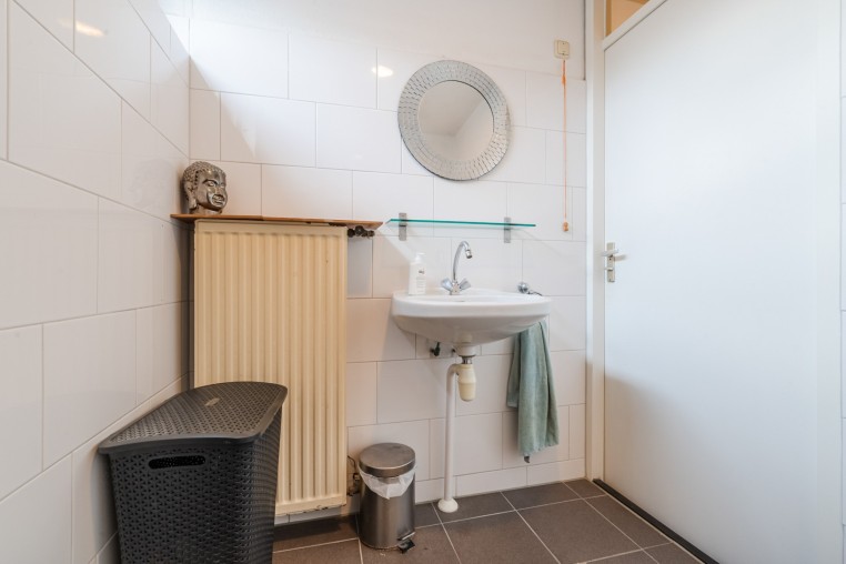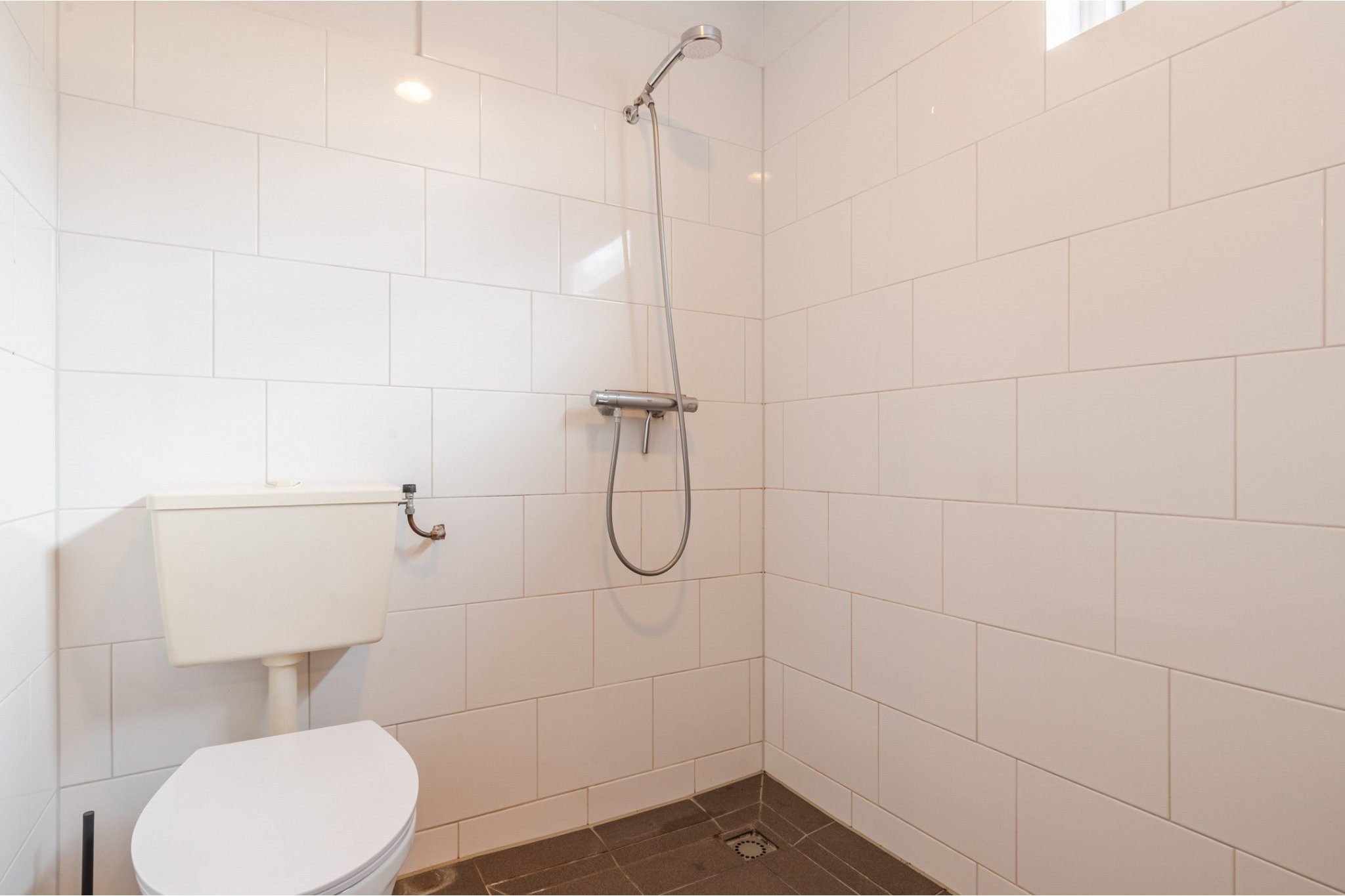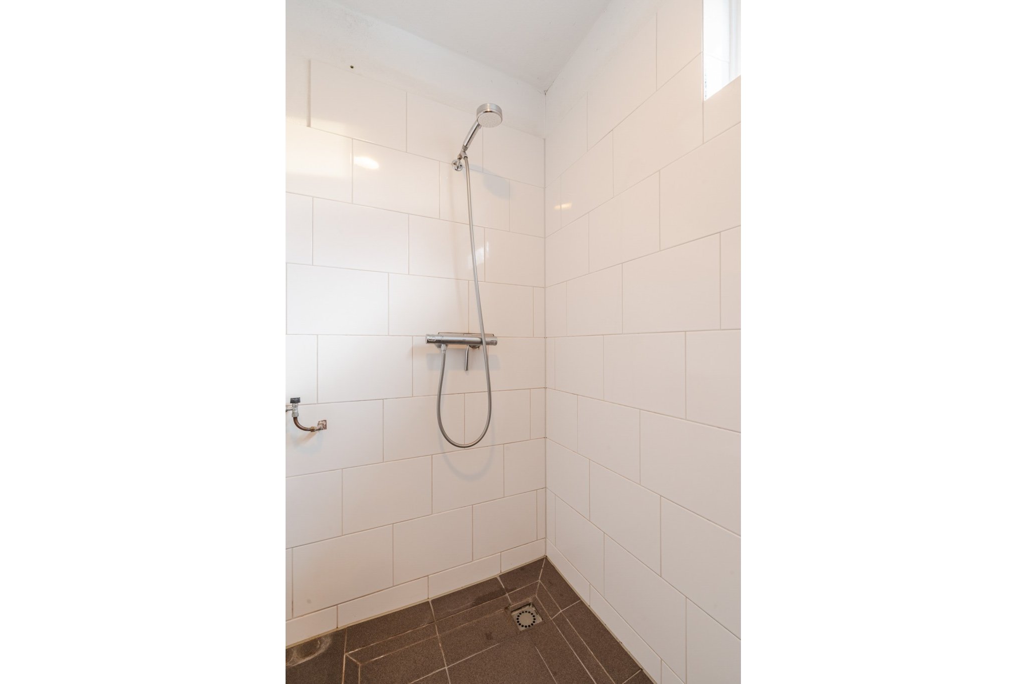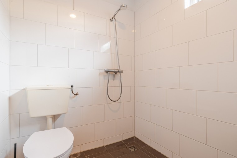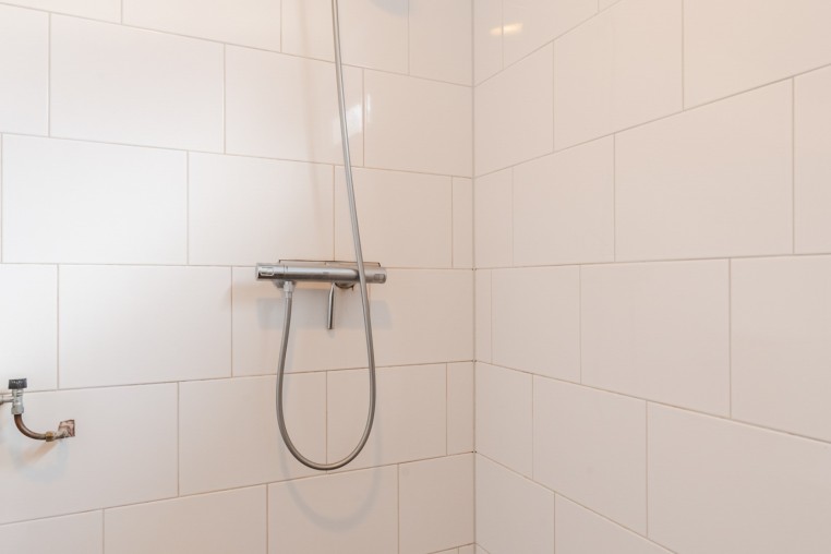 Nette, tot plafond betegelde badkamer, ± 3 m², voorzien van douche, 2e toilet en vaste wastafel.