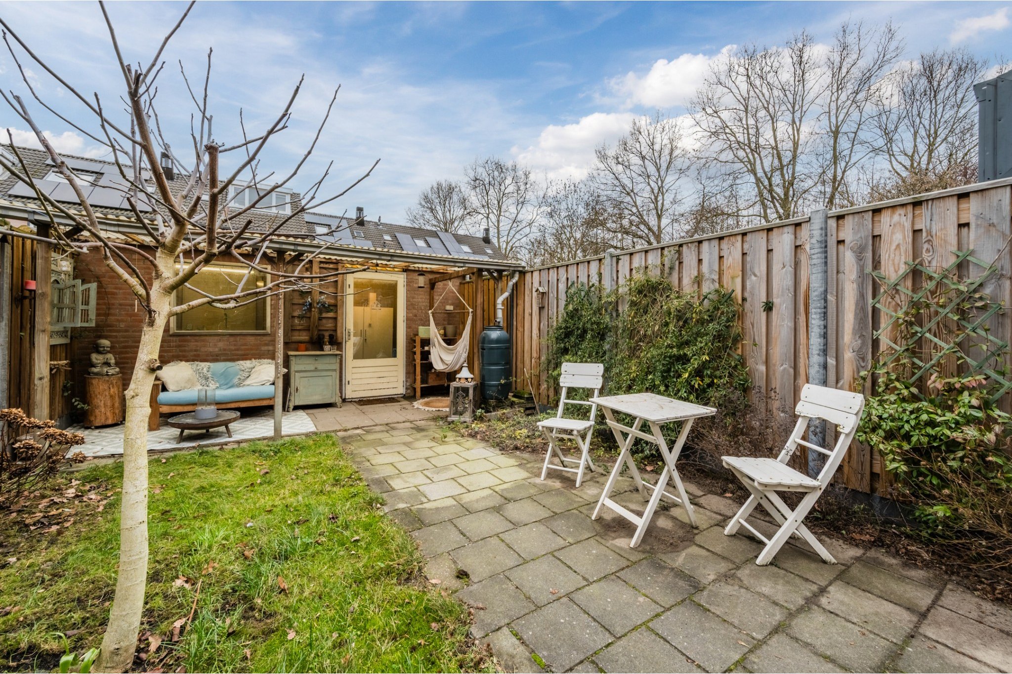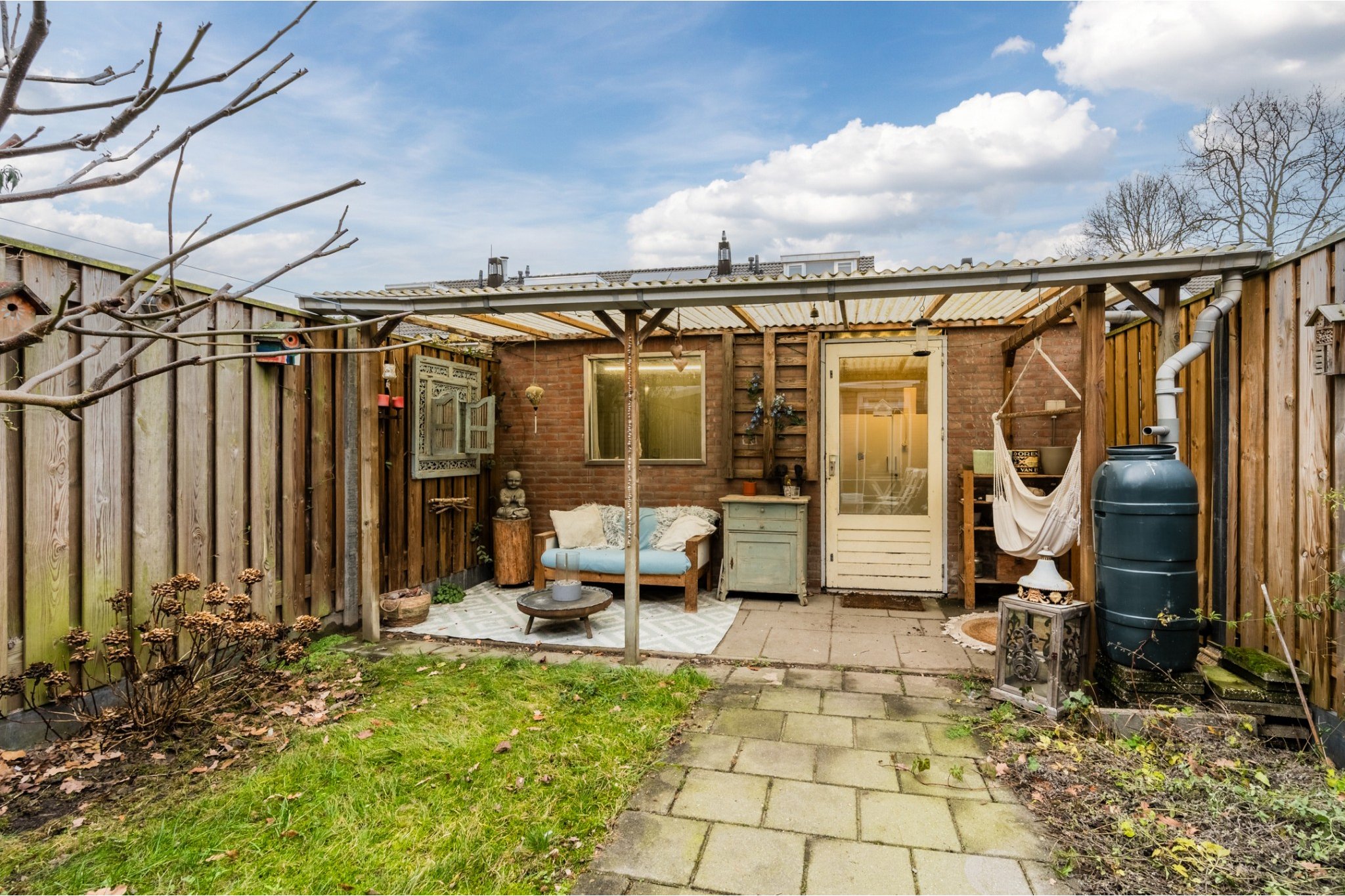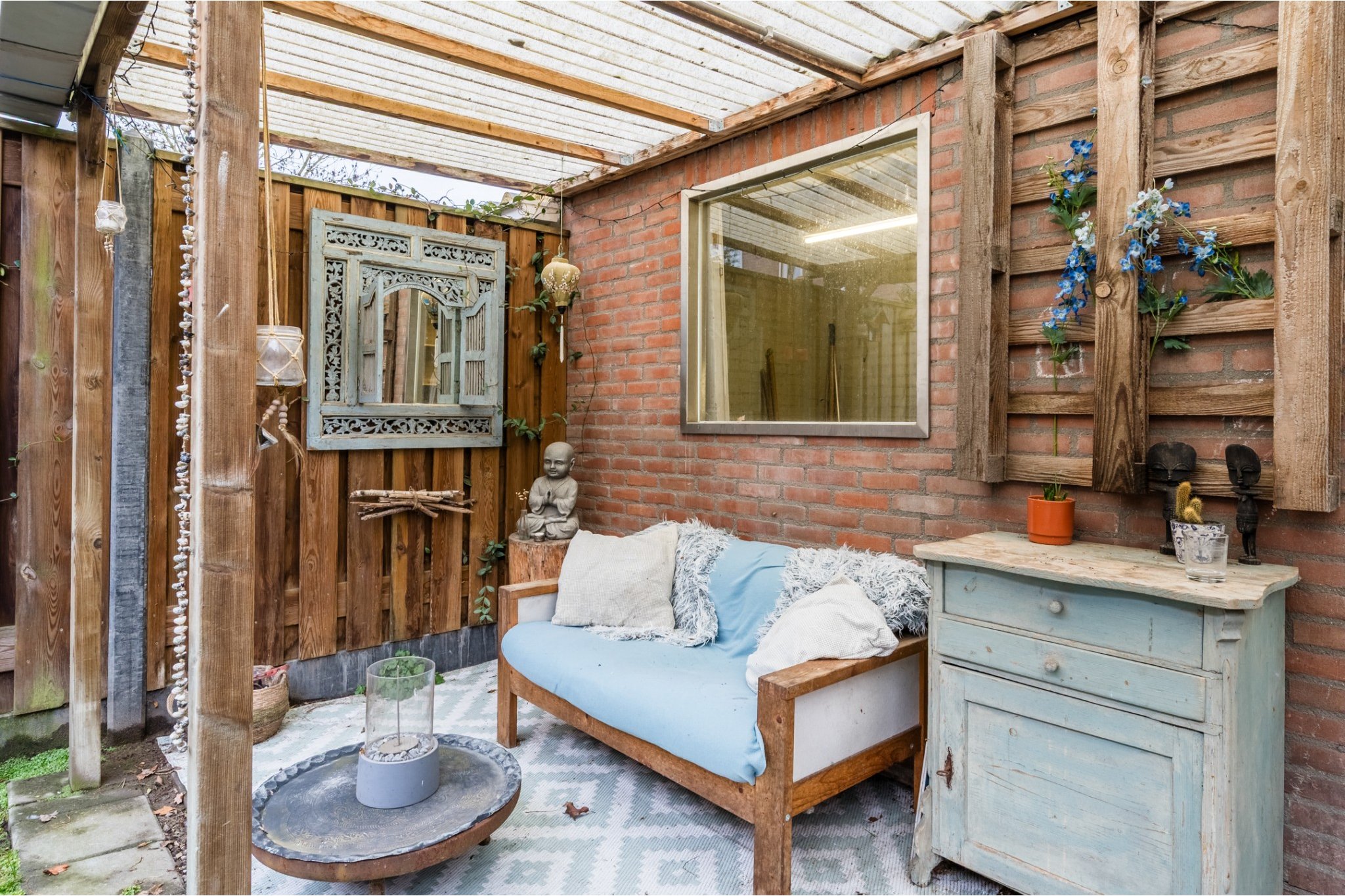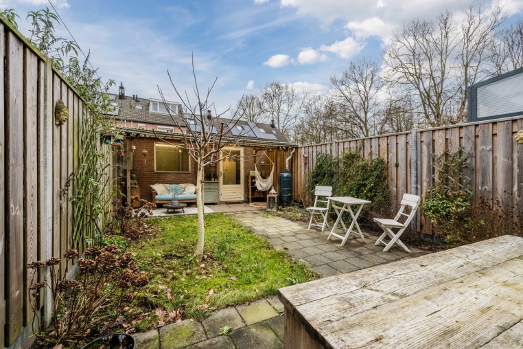 Verzorgde achtertuin met terras, gazon, volwassen beplanting, berging met overkapping (optimaal genieten van alle jaargetijden) en achterom.