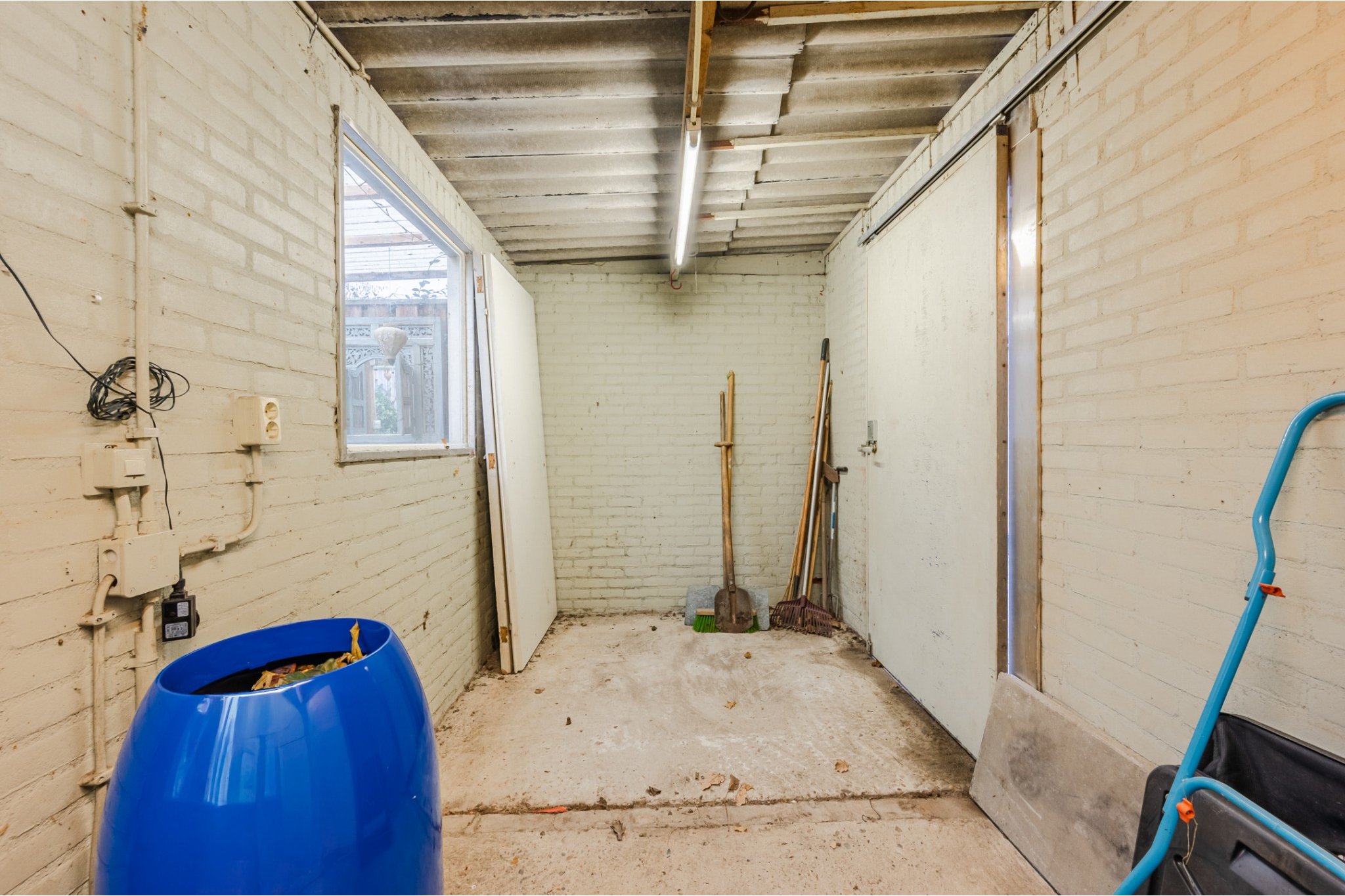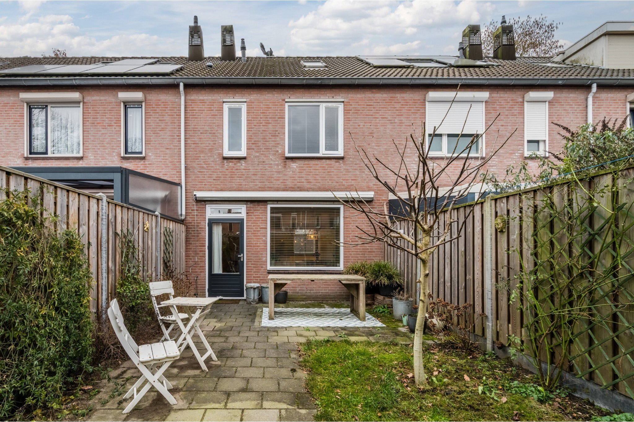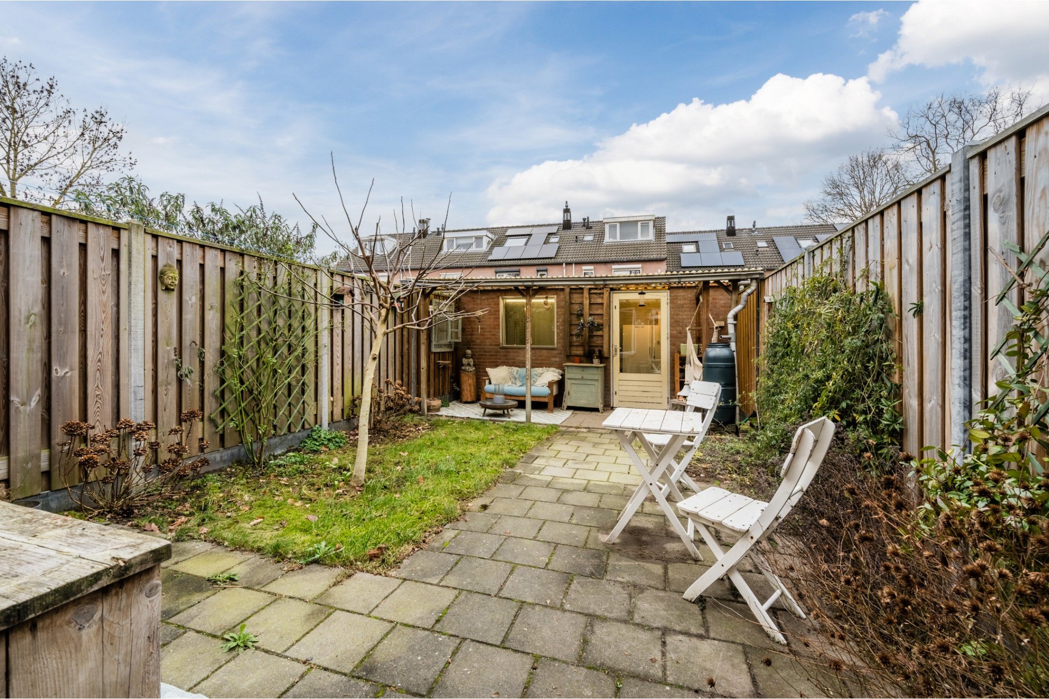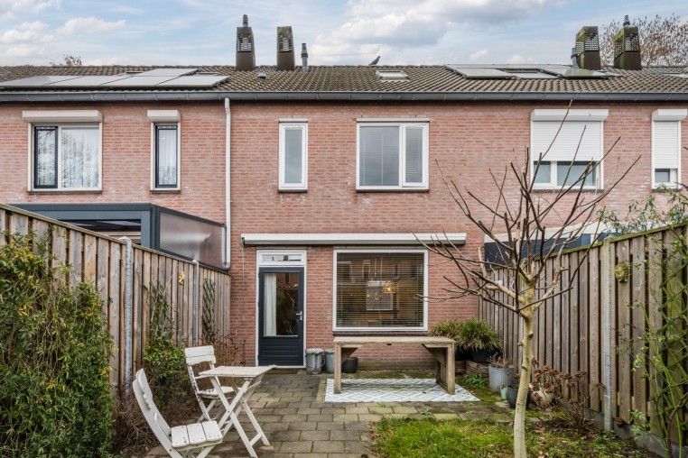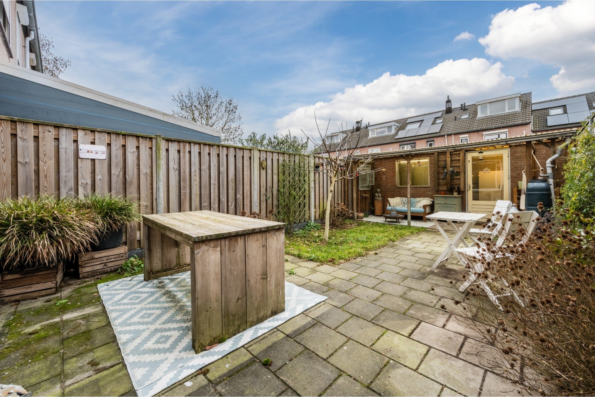 Verzorgde achtertuin met terras, gazon, volwassen beplanting, berging met overkapping (optimaal genieten van alle jaargetijden) en achterom.