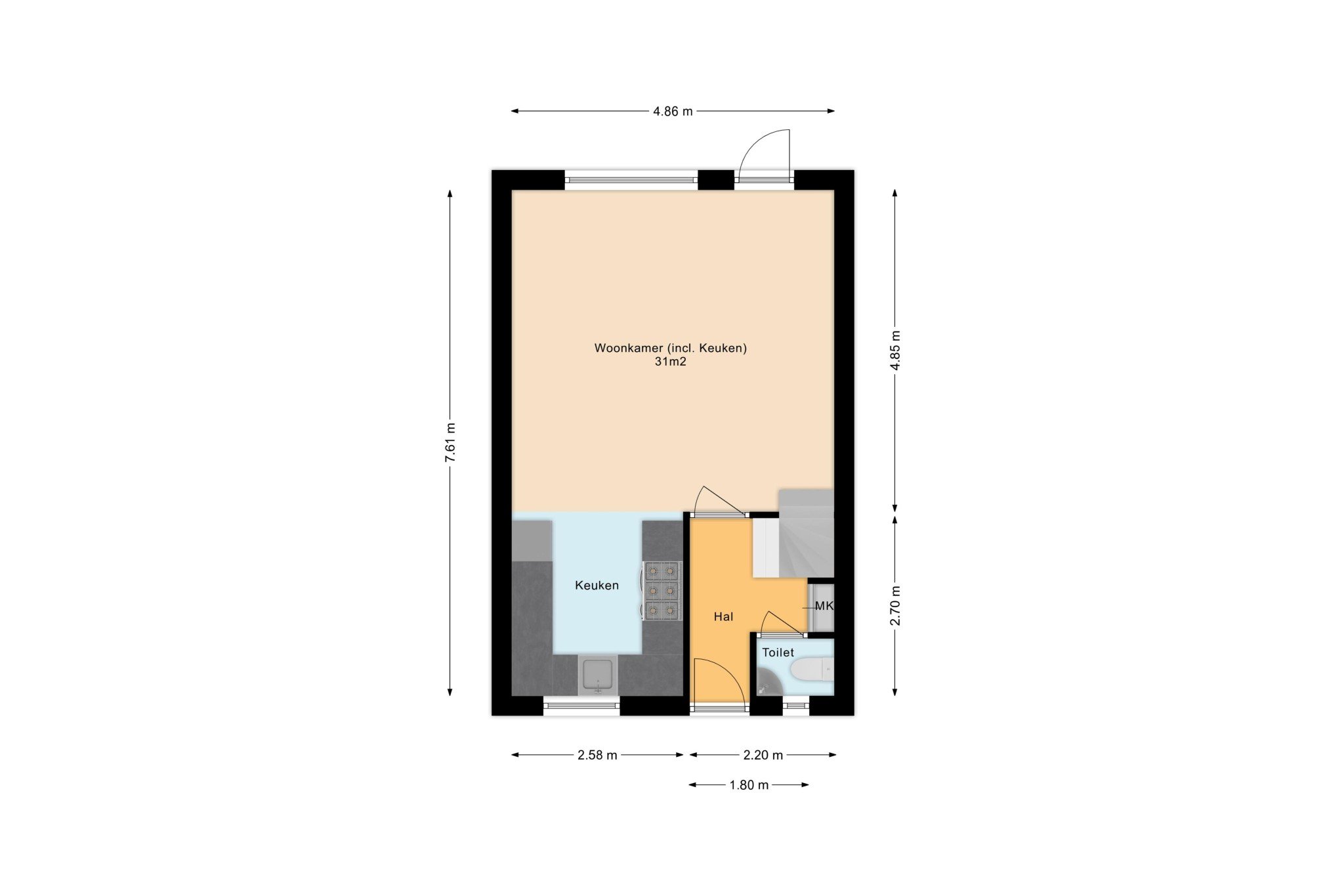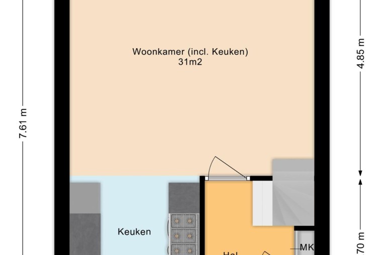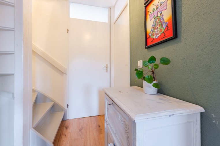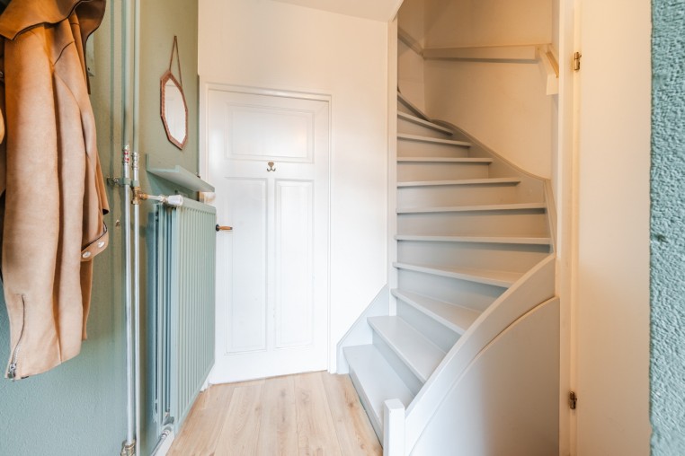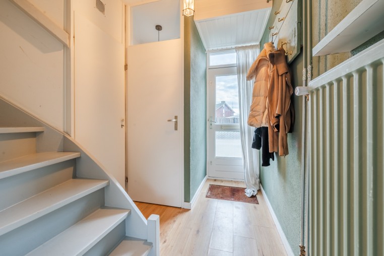 Hal met laminaatvloer, meterkast en trapopgang naar 1e verdieping.