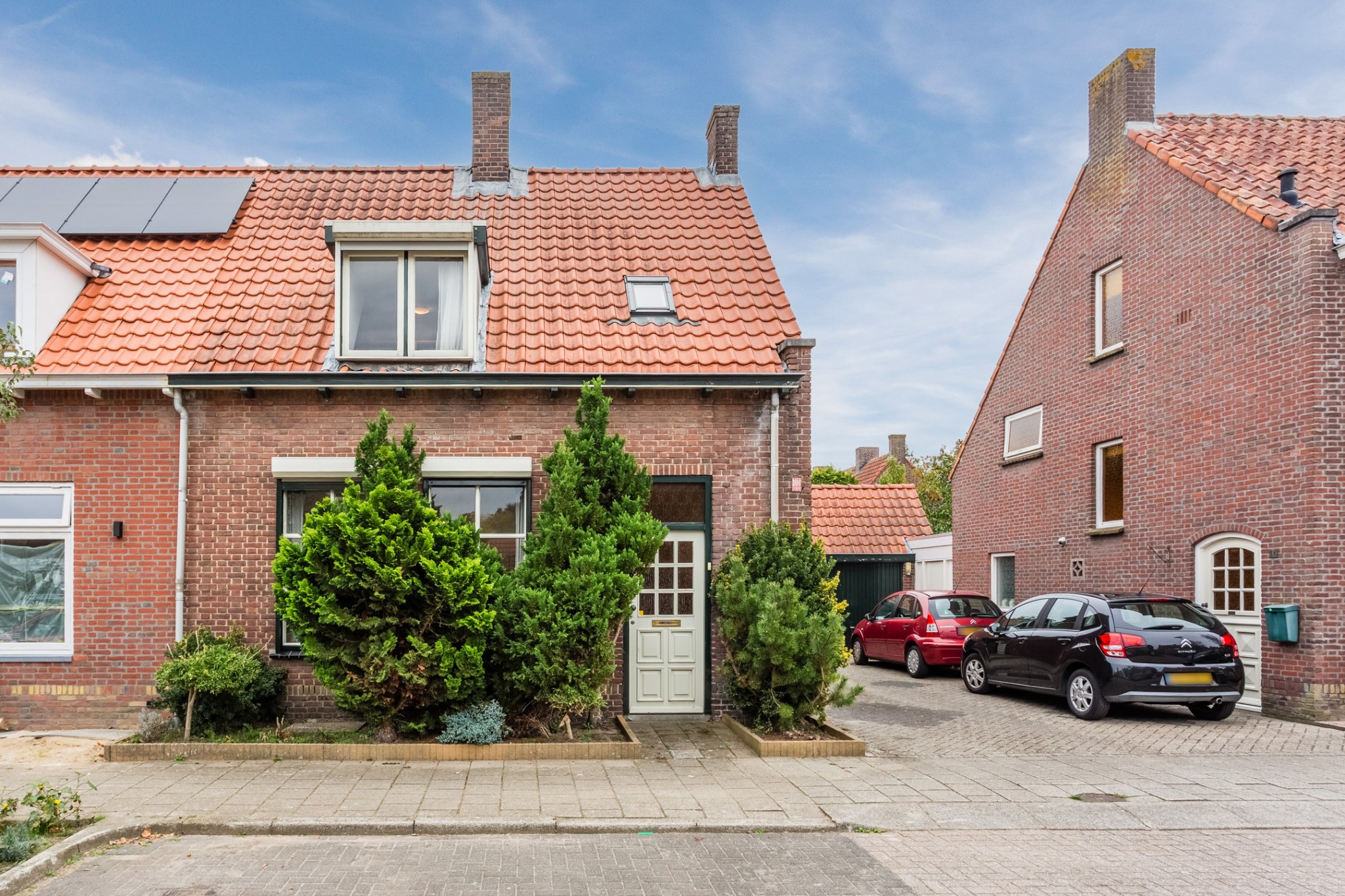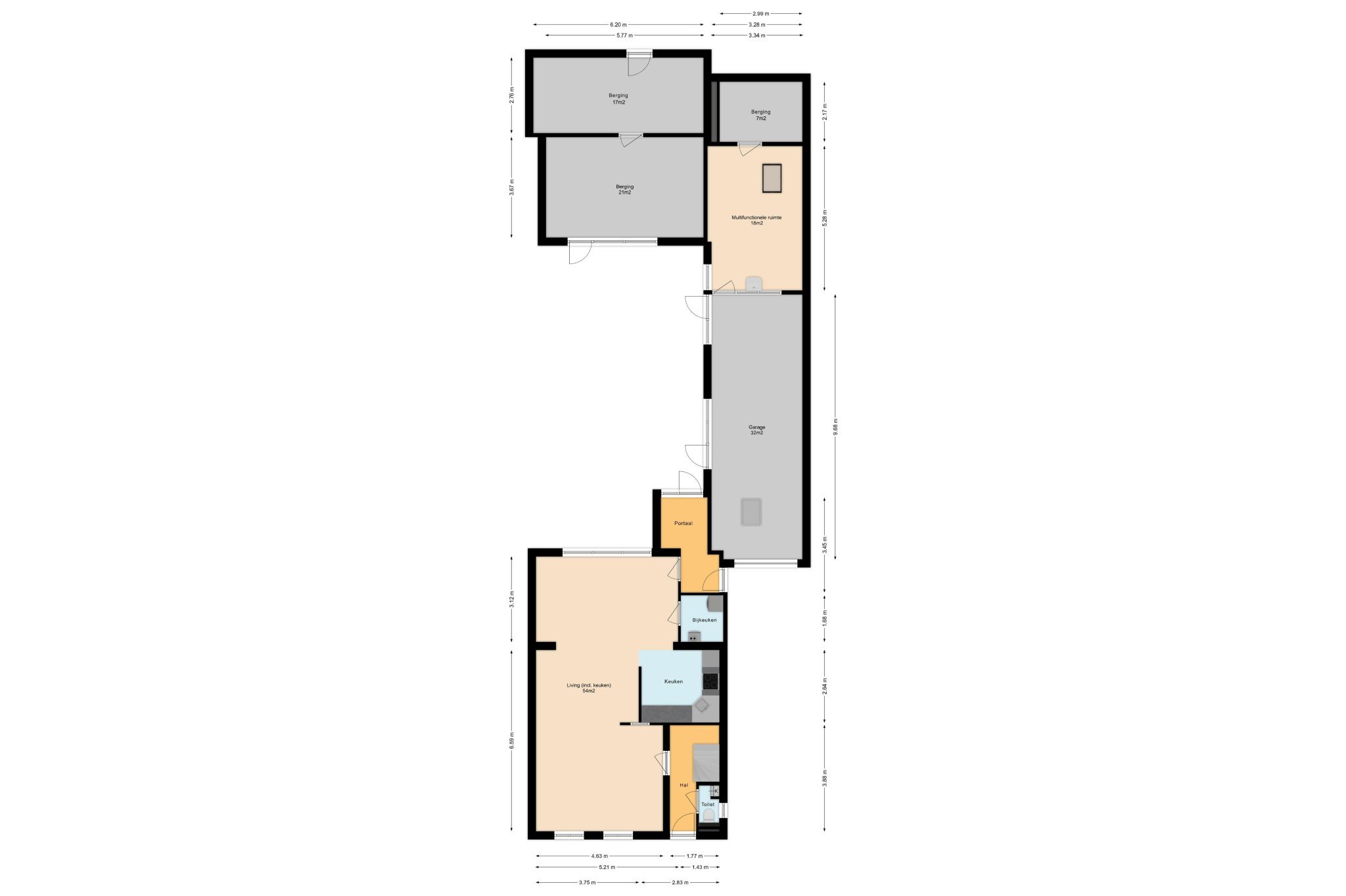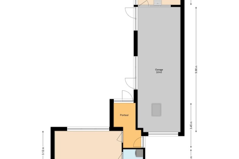 Voortuin met oprit naar ruime garage (± 32 m²) met doorgang naar portaal met toegang tot multifunctionele ruimte, ± 18 m², voorzien van tegelvloer en lichtkoepel.