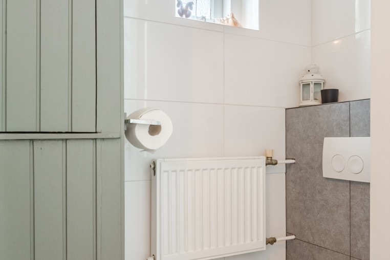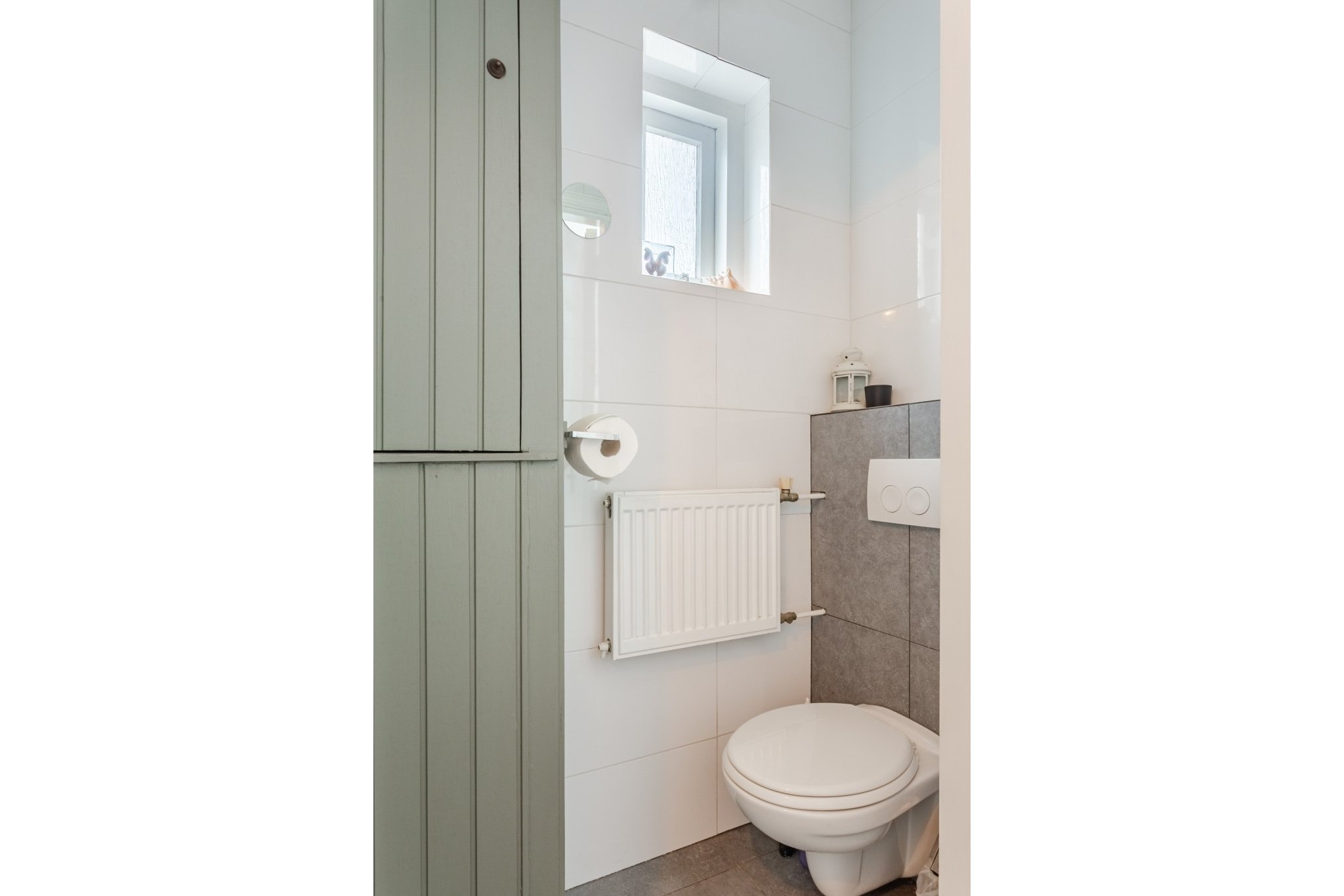 Nette, tot plafond betegelde toiletruimte met wandcloset.