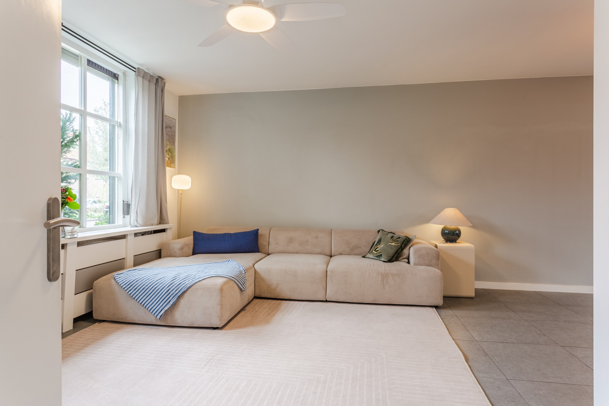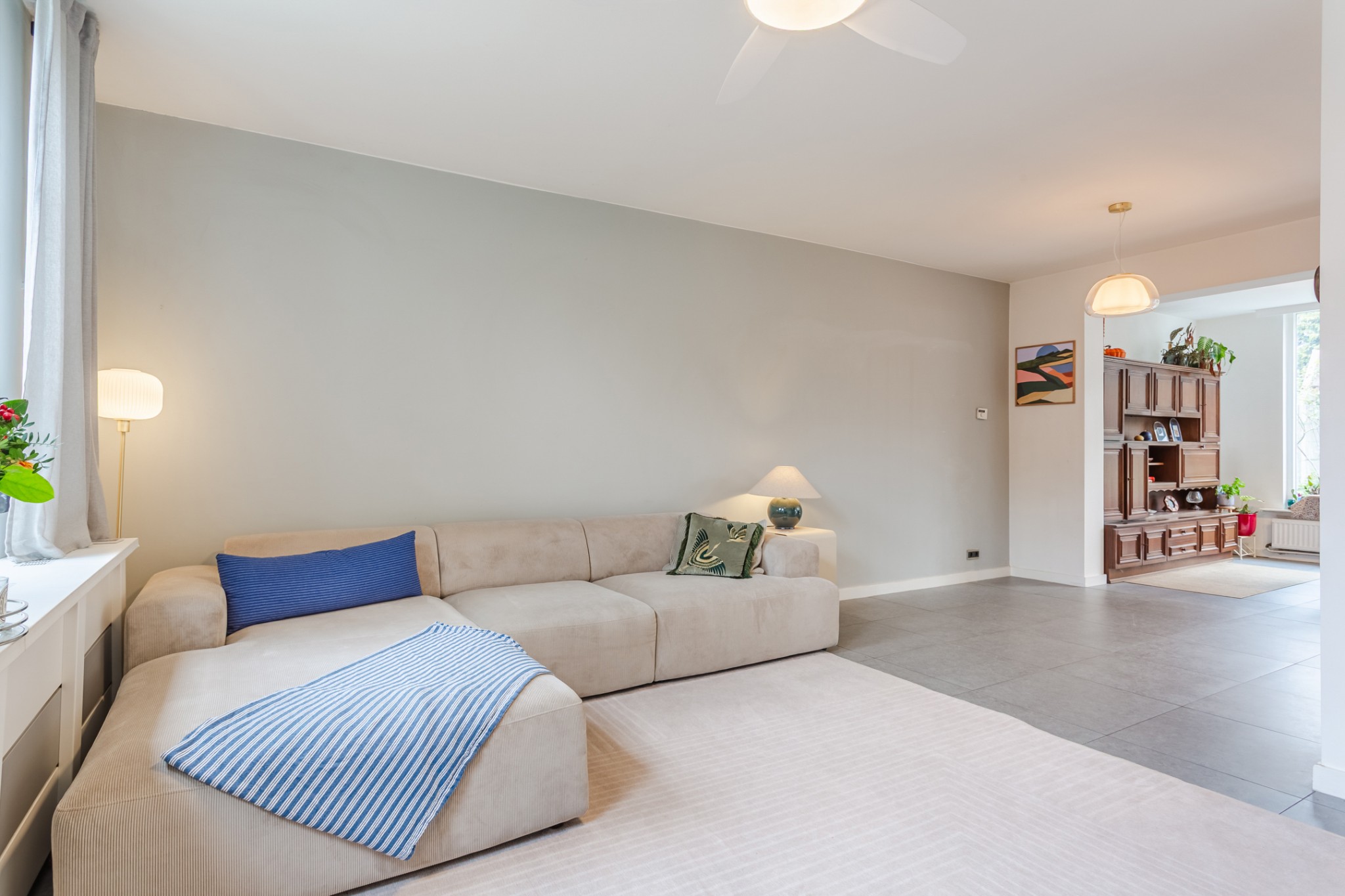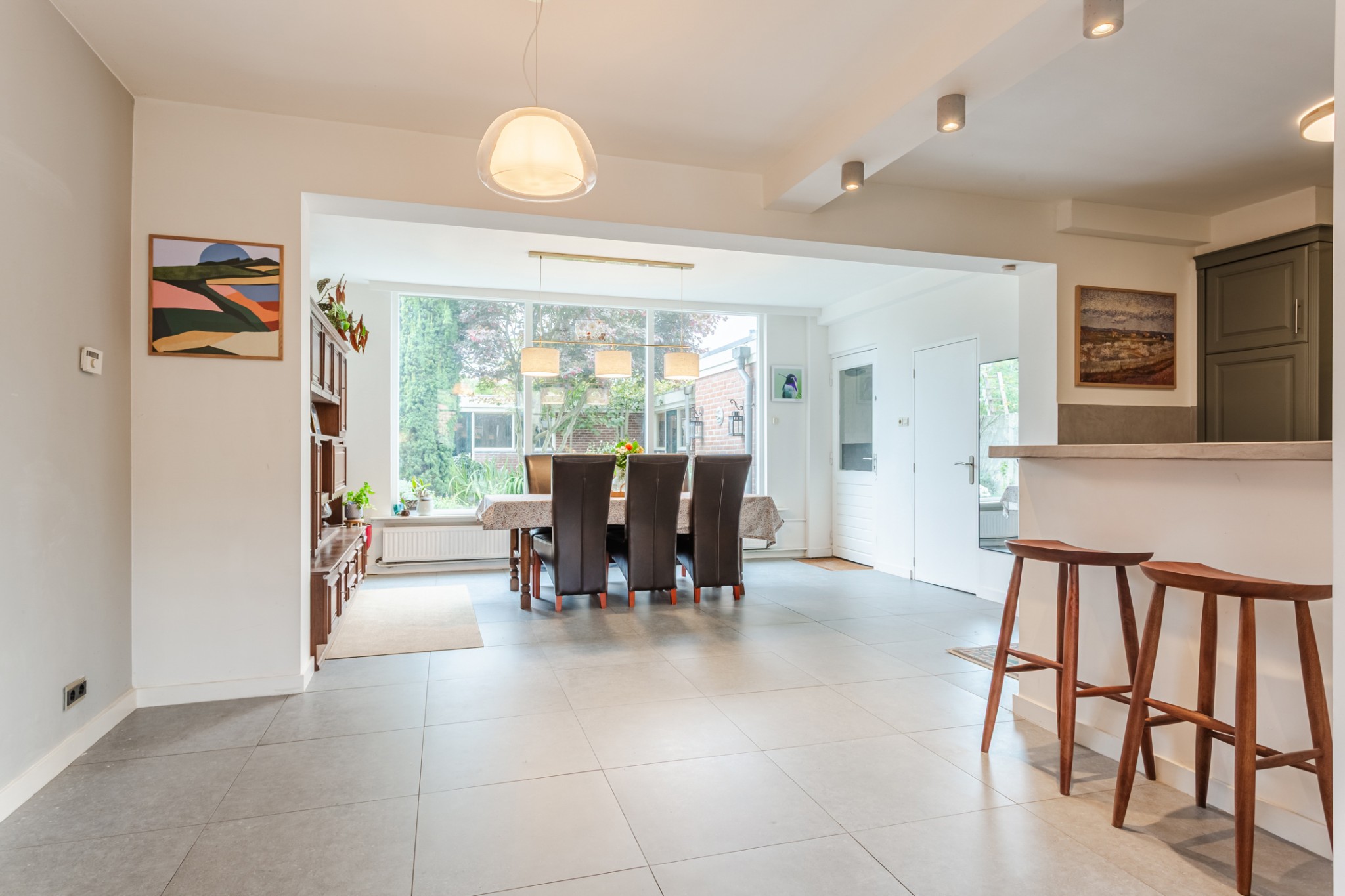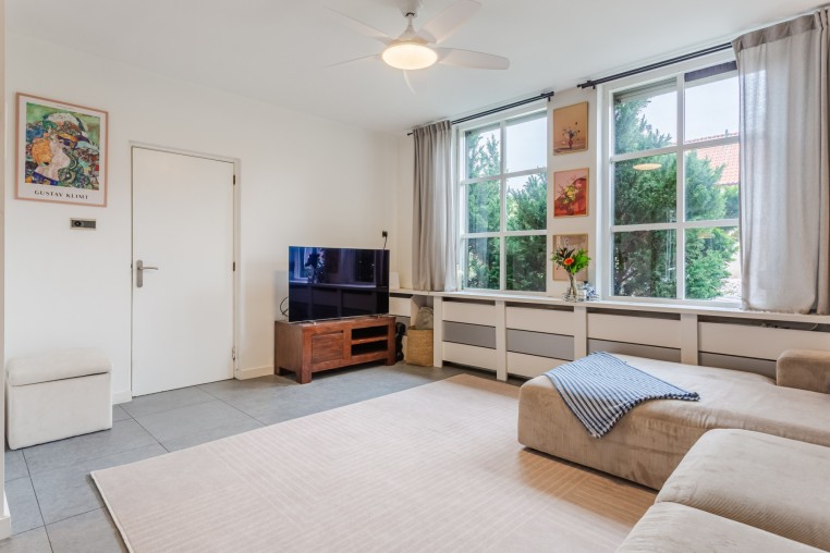 Royale, uitgebouwde living, (± 54 m² incl. keuken) voorzien van tegelvloer en strakke stucwerk wanden en -plafond. Prettig veel lichtinval door grote raampartij.