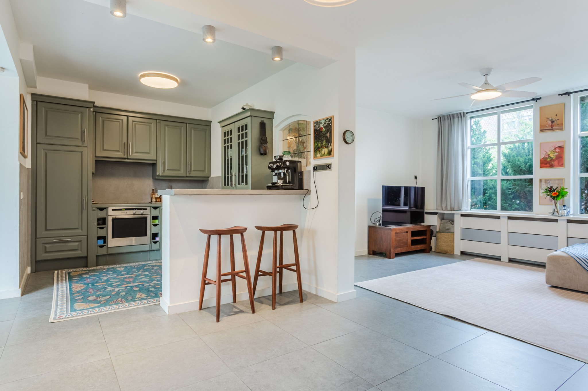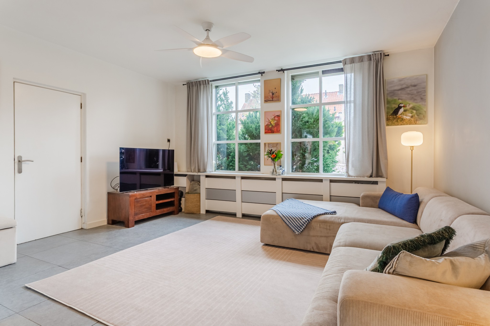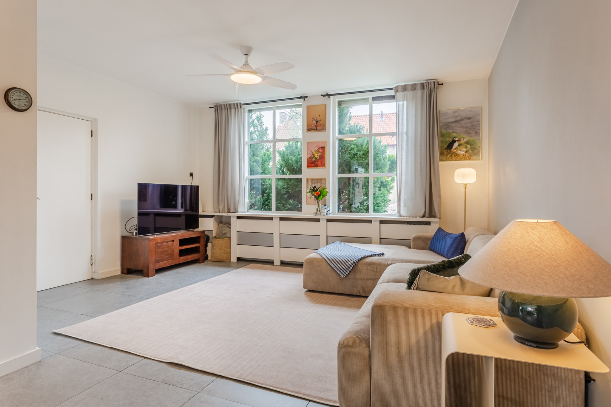 Royale, uitgebouwde living, (± 54 m² incl. keuken) voorzien van tegelvloer en strakke stucwerk wanden en -plafond. Prettig veel lichtinval door grote raampartij.
