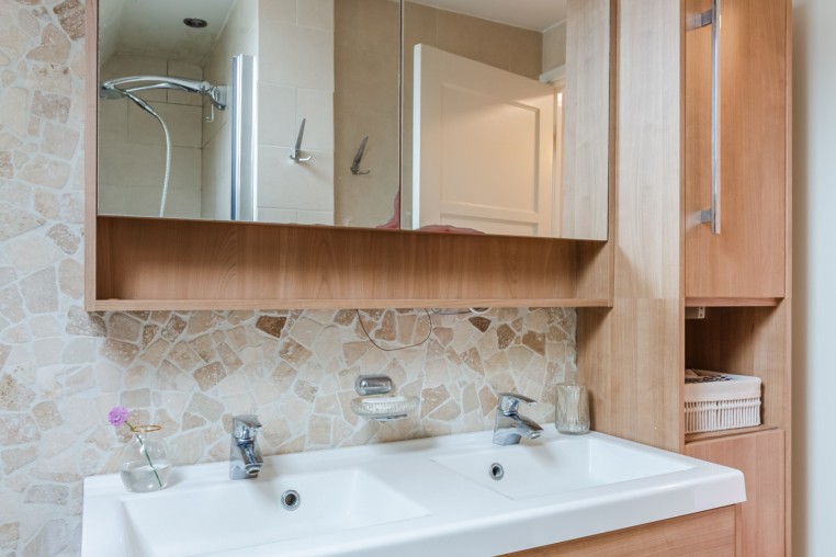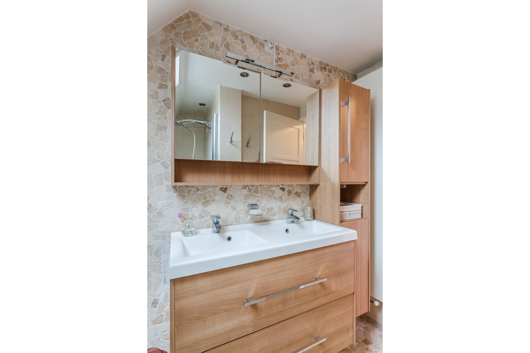 Moderne, betegelde badkamer met douche, badmeubel met 2 wastafels en 2e toilet (Sanibroyeur).