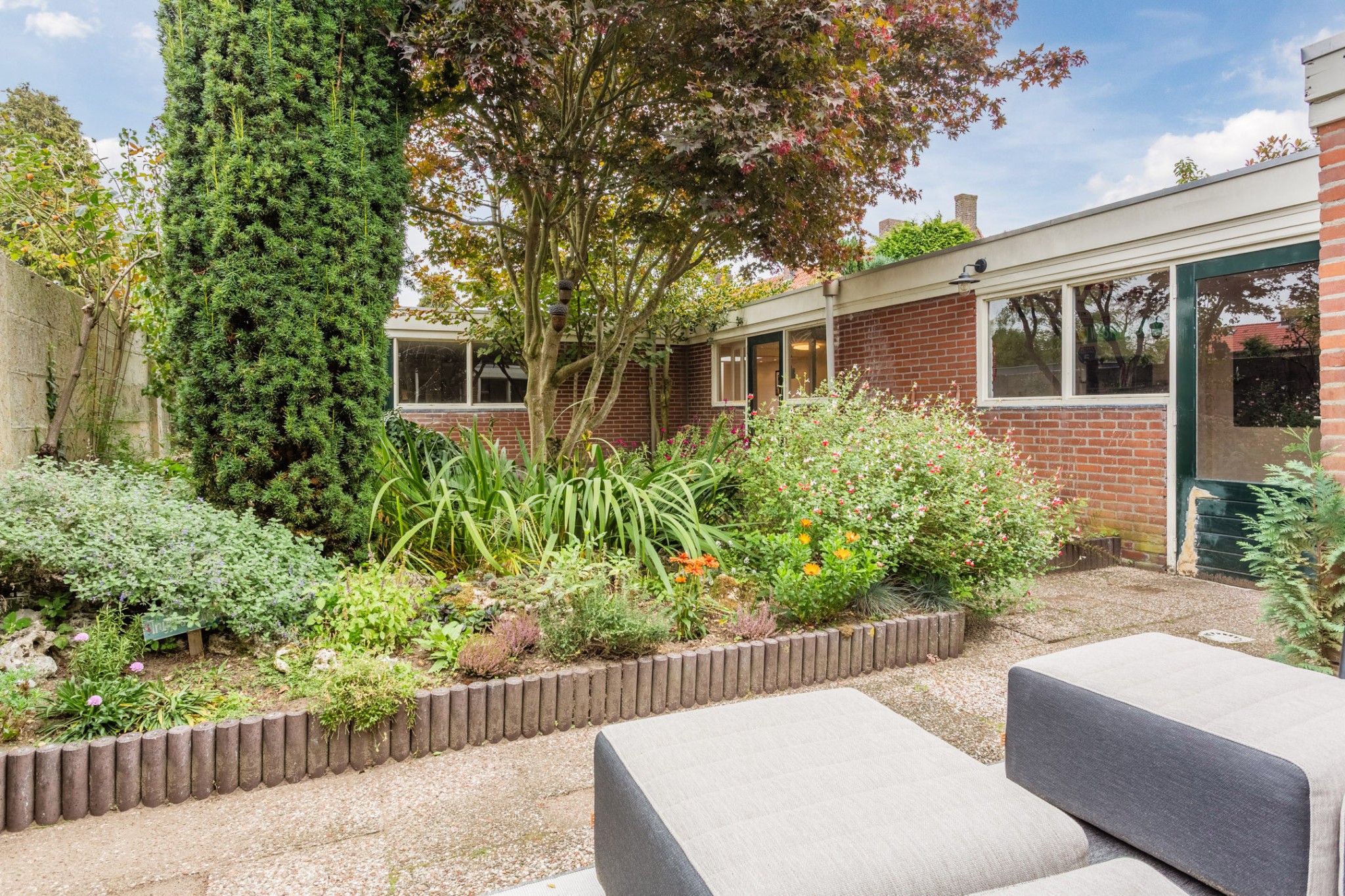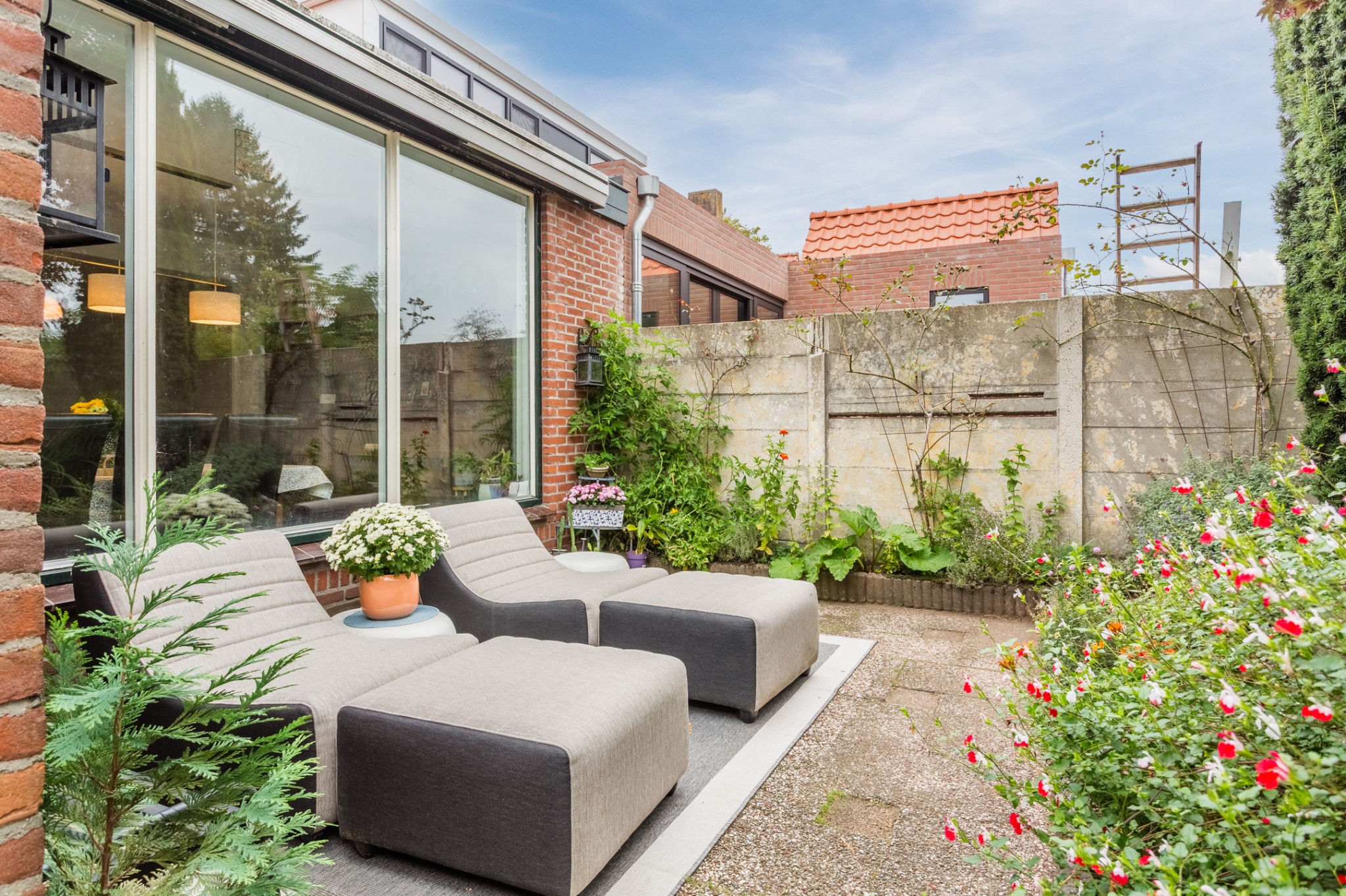 Achtertuin met terrassen en borders, diverse ruime bergingen van respectievelijk 21 m², 17 m² en 7 m².