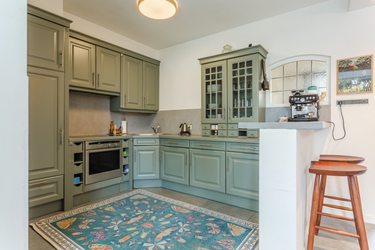 Semi-open keuken met inrichting in hoekopstelling, diverse onder- en bovenkasten en inbouwapparatuur, t.w.: inductiekookplaat, afzuigkap, oven, vaatwasser en koelkast. De keuken is tevens voorzien van een eetbar.