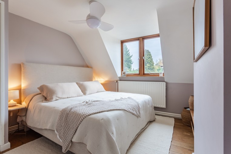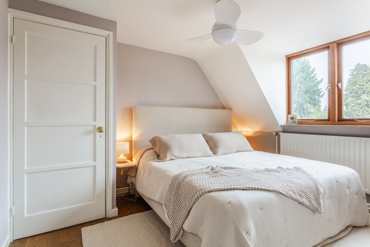 Slaapkamer, ± 11 m², met houten vloerdelen en dakkapel.