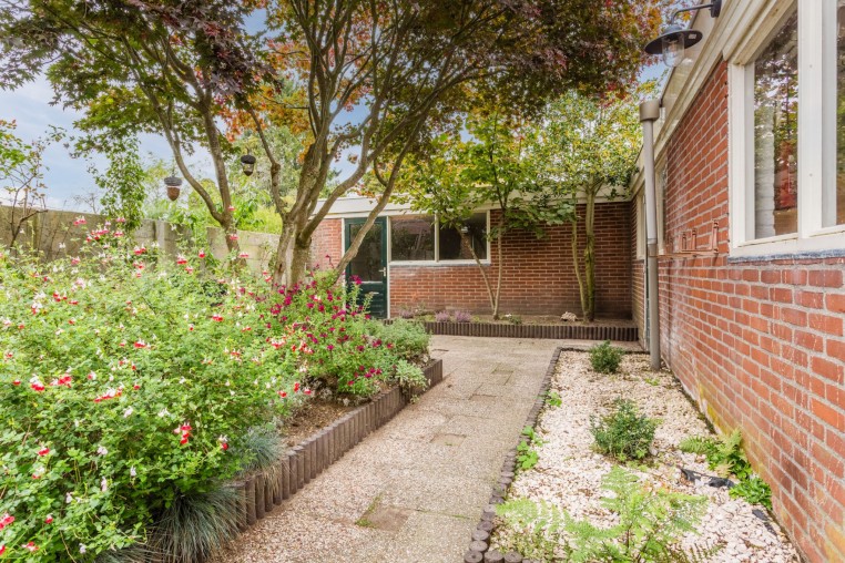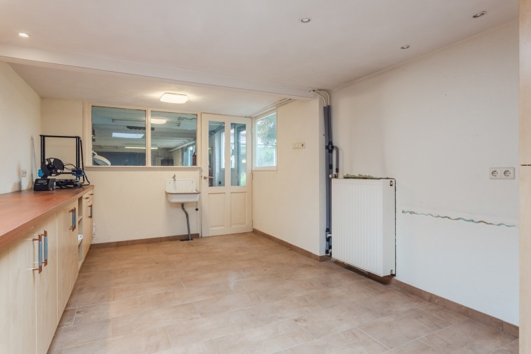 Praktische bijkeuken met opstelling combi-ketel (Nefit, ± 2014) en aansluiting wasapparatuur. Vanuit de bijkeuken bereikbaar portaal met deur naar de tuin en de oprit.