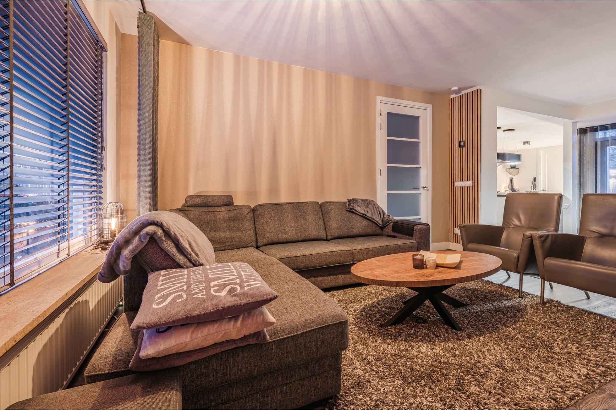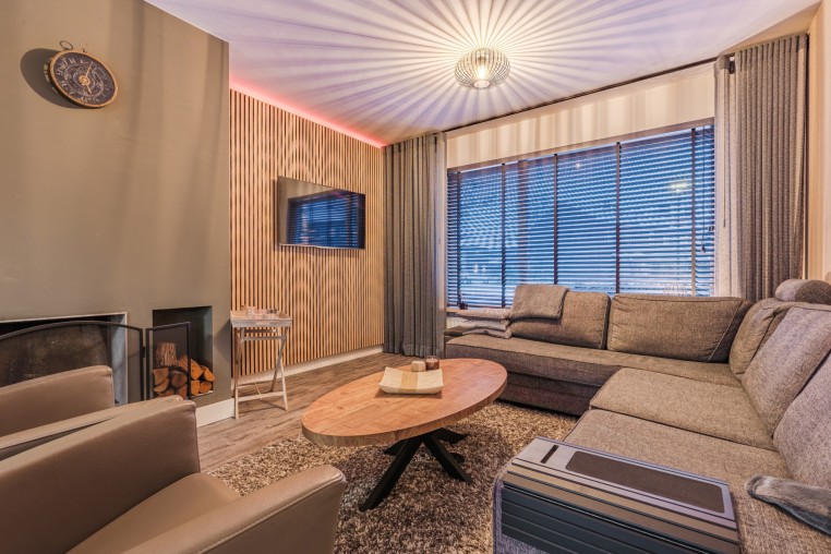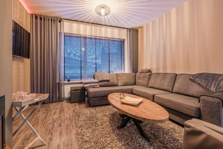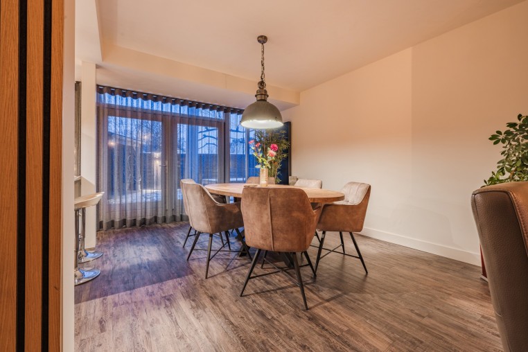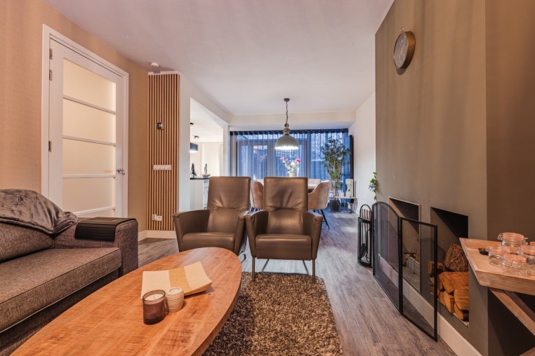 Ruime woonkamer, ± 48 m² (incl. keuken), voorzien van pvc-vloer, houthaard, strakke stucwerk wanden en -plafond met inbouwverlichting en openslaande deuren met plisse hordeur richting de fijne tuin.