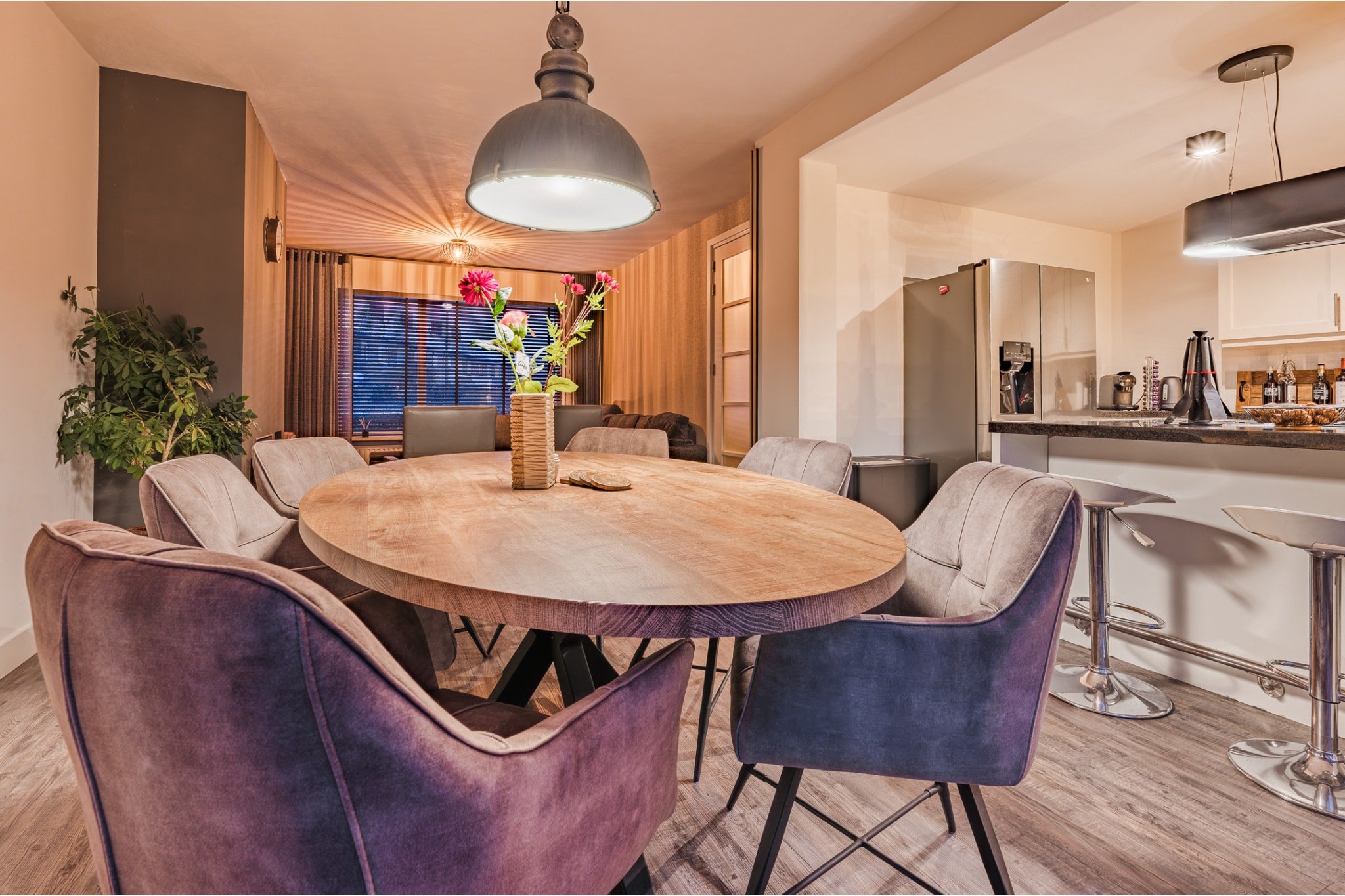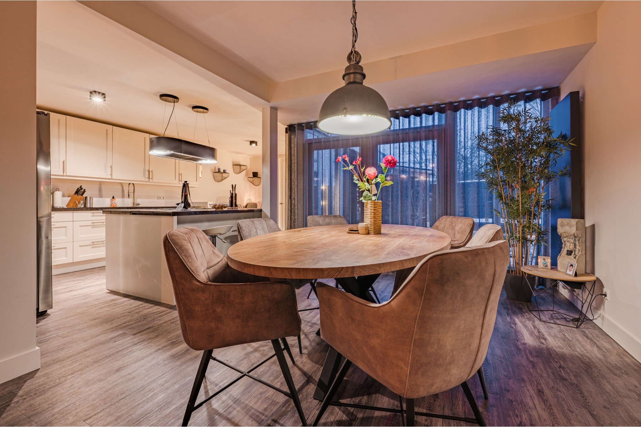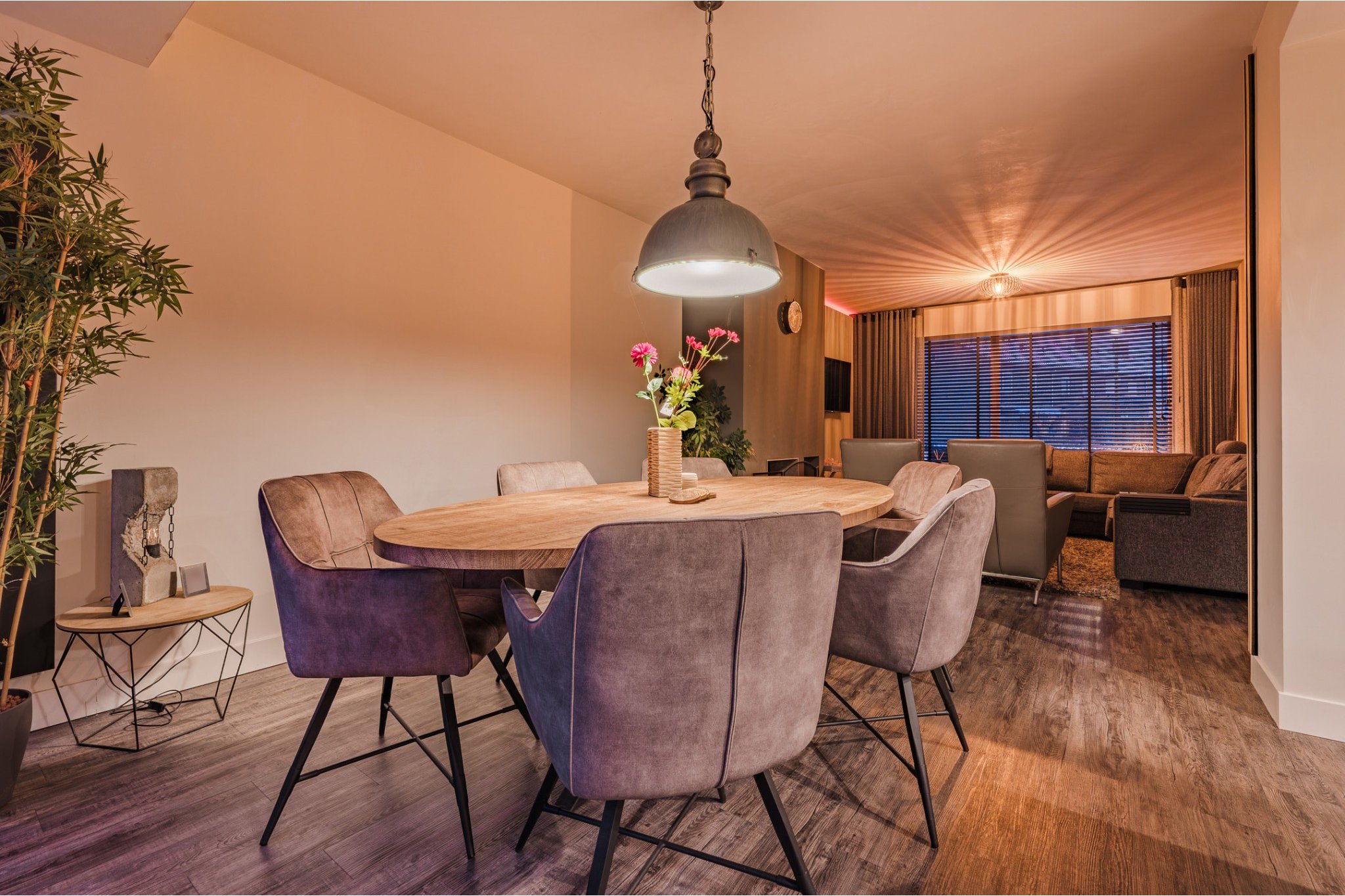 Ruime woonkamer, ± 48 m² (incl. keuken), voorzien van pvc-vloer, houthaard, strakke stucwerk wanden en -plafond met inbouwverlichting en openslaande deuren met plisse hordeur richting de fijne tuin.