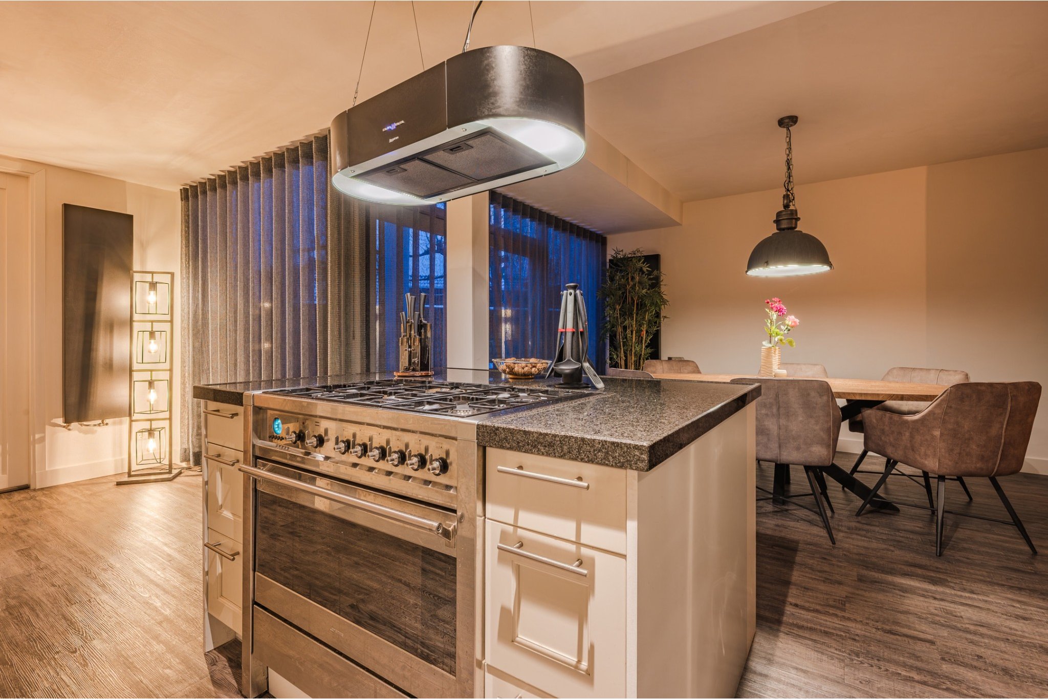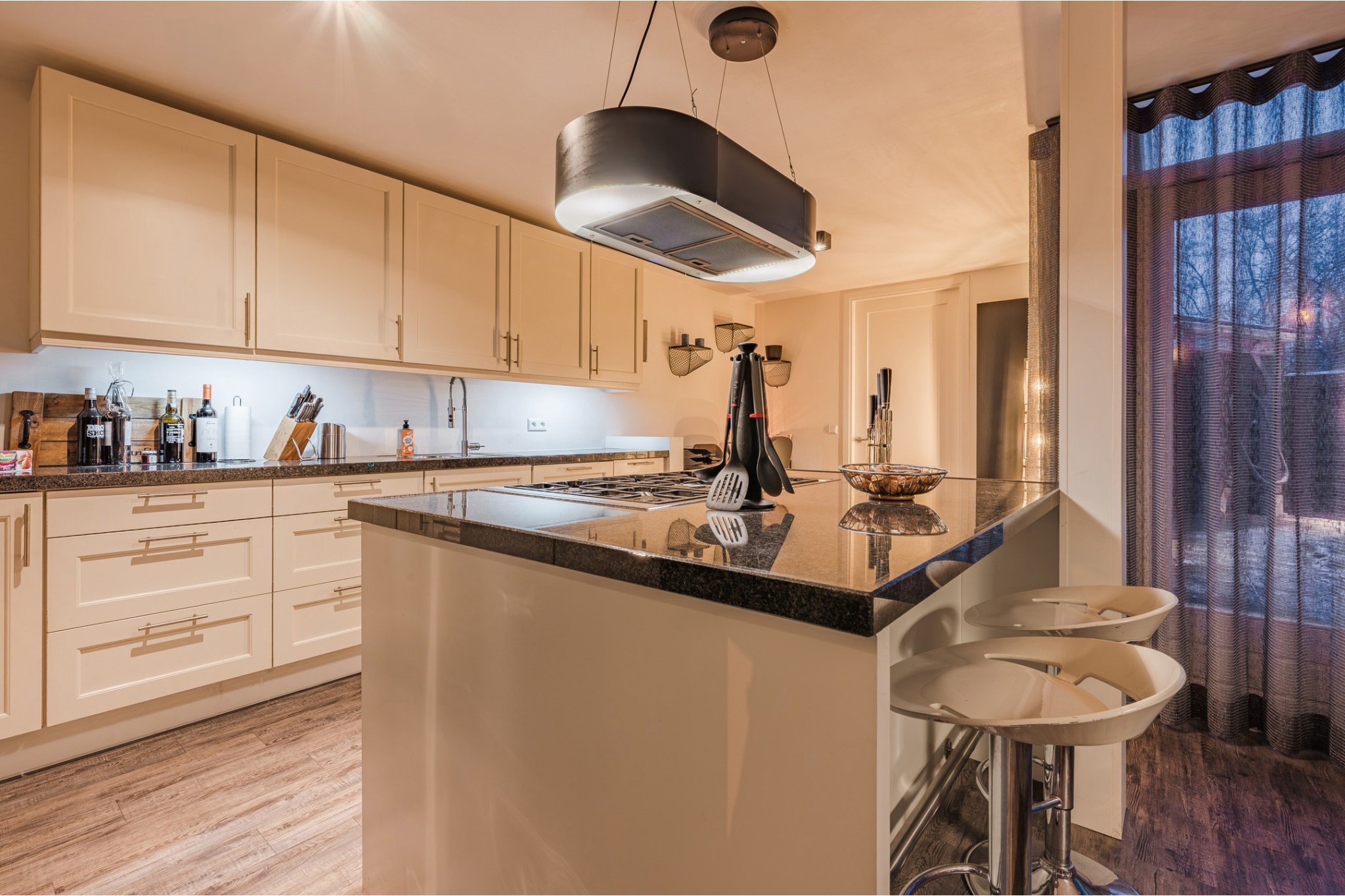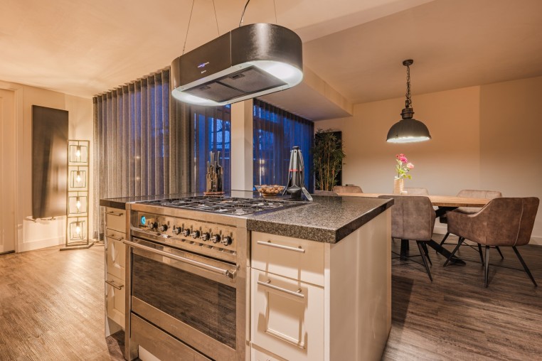 Moderne, open keuken voorzien van pvc-vloer, kookeiland met barretje, diverse onder- en bovenkasten en inbouwapparatuur, t.w.: breed 6- pits gasfornuis met oven, afzuigkap, vaatwasser en boiler.