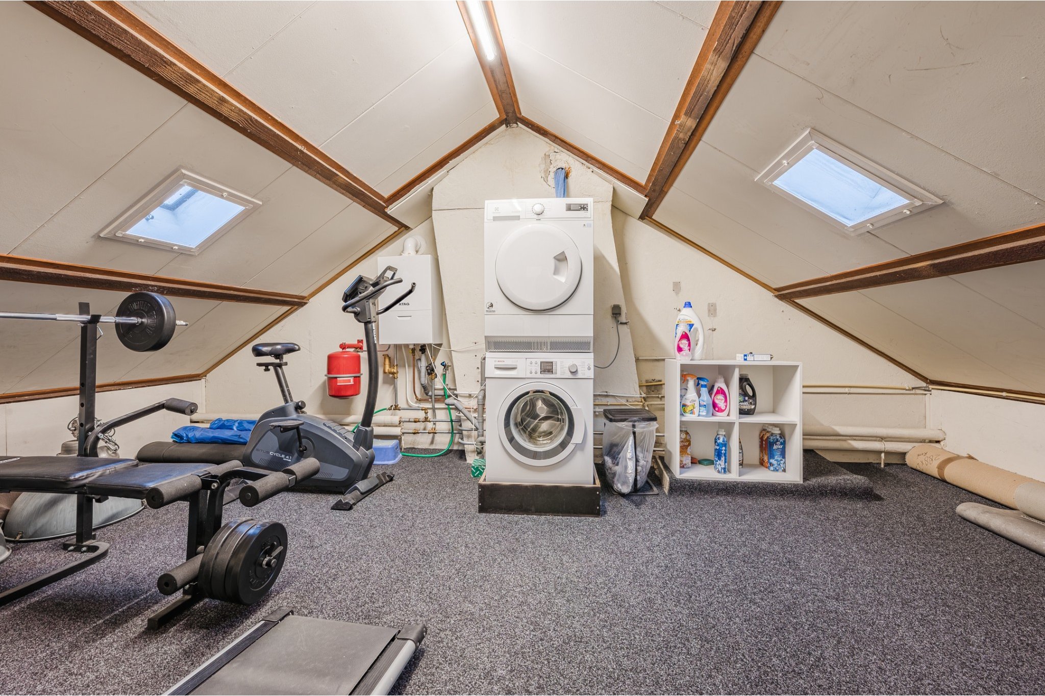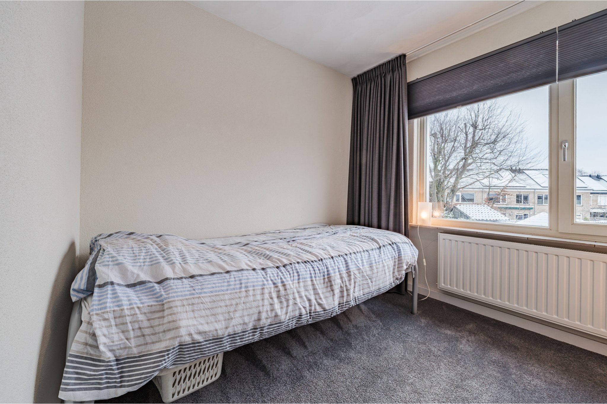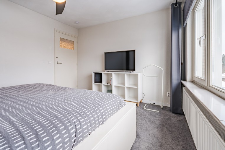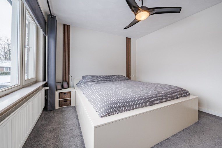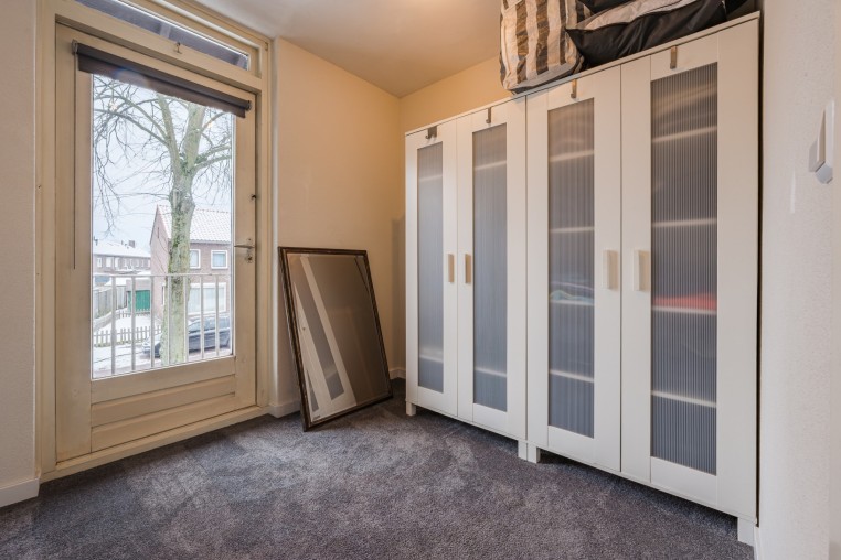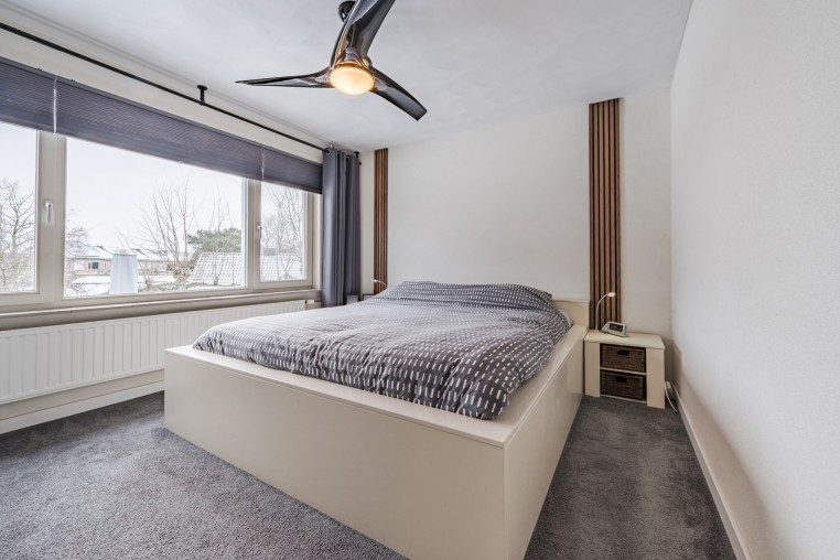 Slaapkamer, ± 12 m², met vloerbedekking, aansluiting wasapparatuur en opstelling Combi-ketel (ATAG, ± 2023).