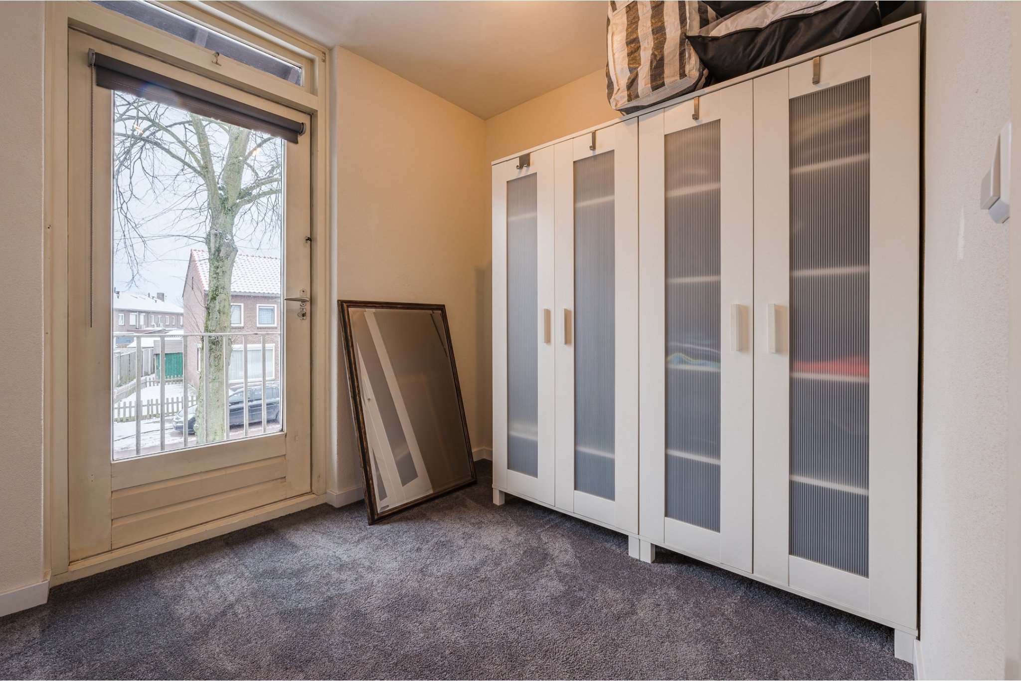 Slaapkamer, ± 6 m², met vloerbedekking en deur naar balkon.