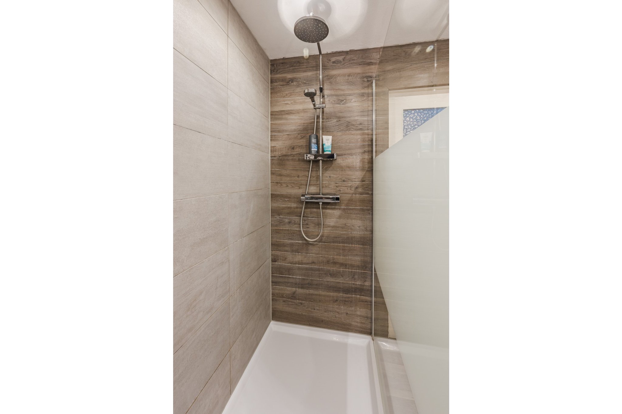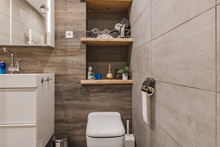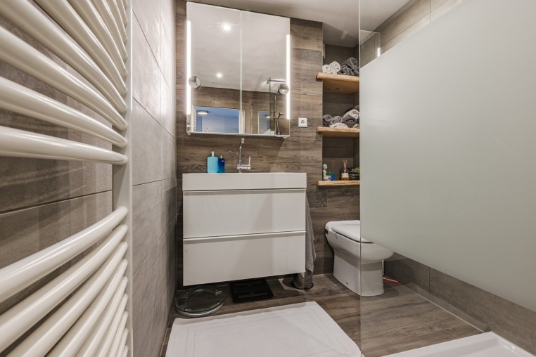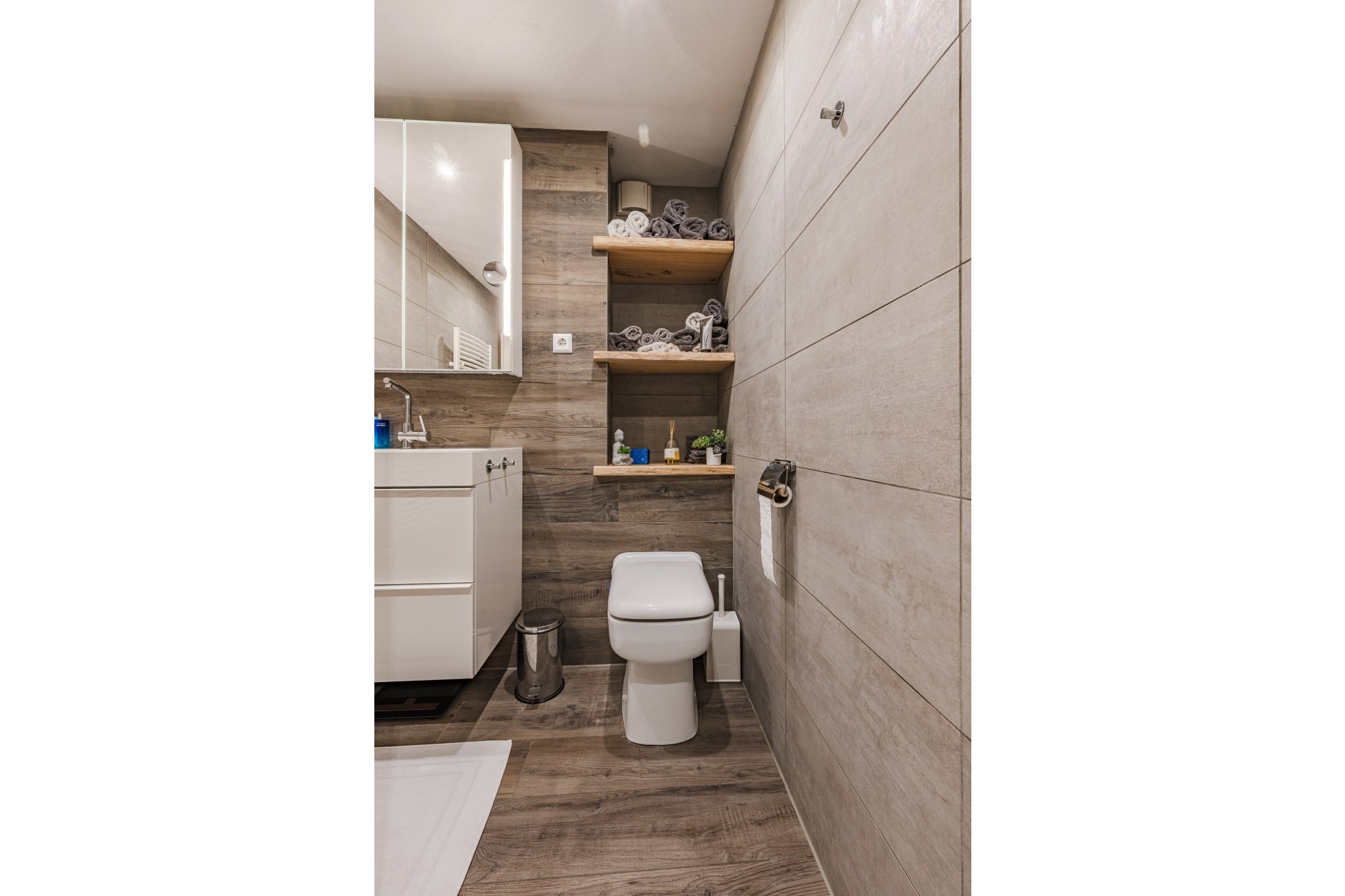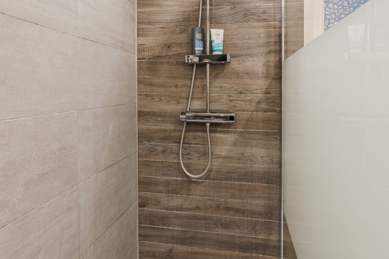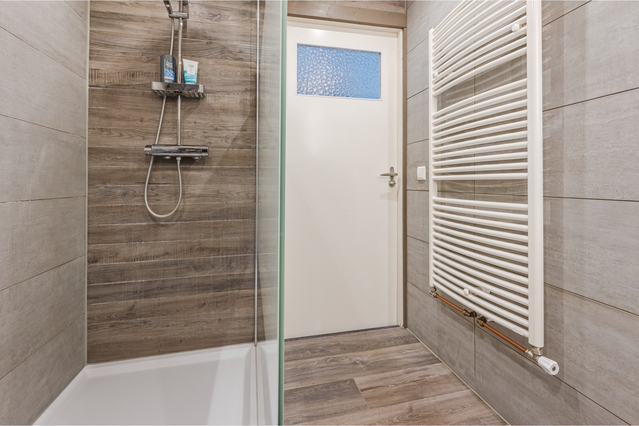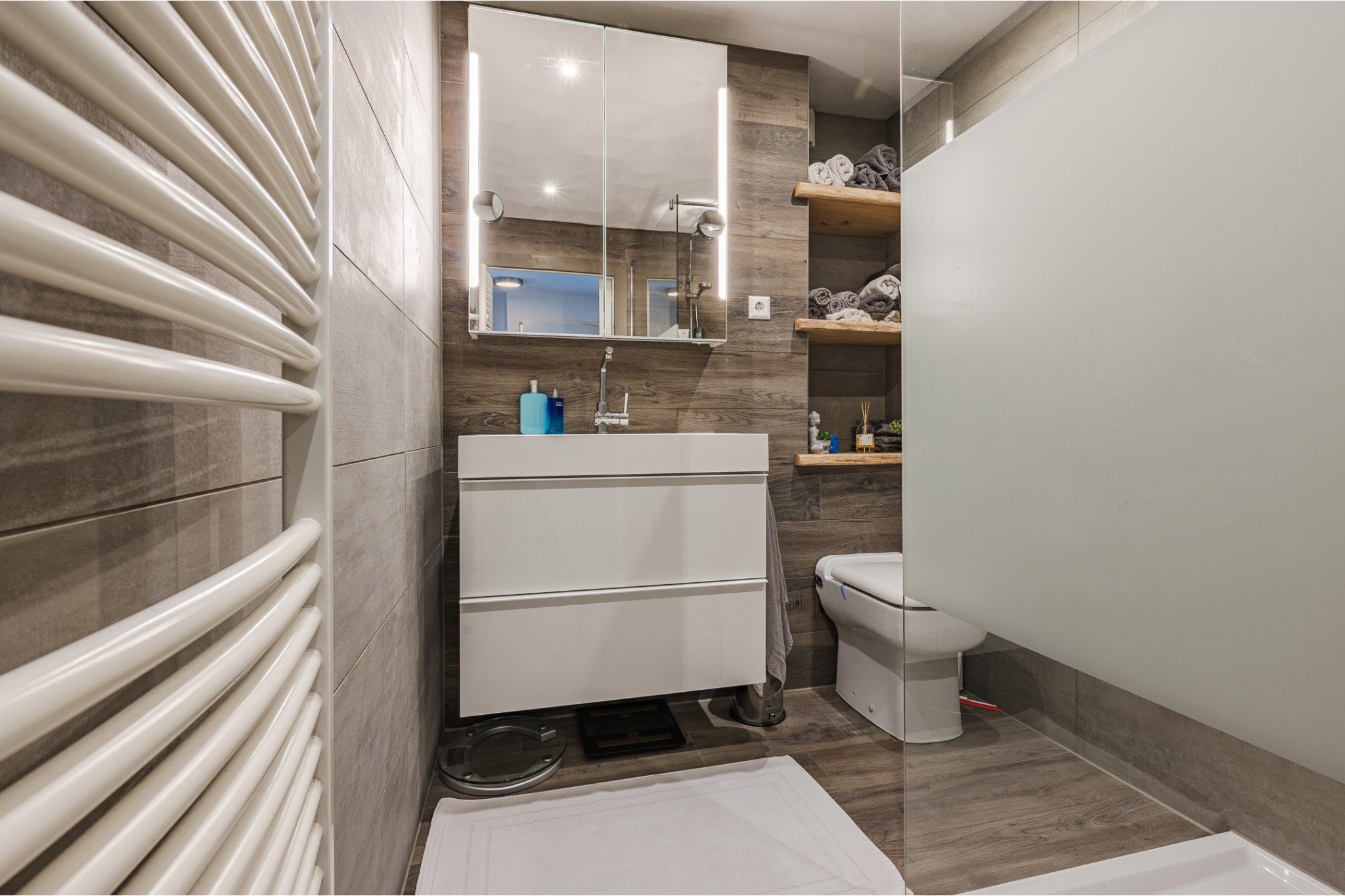 In 2021 vernieuwde, moderne, luxe tot plafond betegelde badkamer voorzien van een houtlook tegelvloer, mechanische ventilatie, inloopdouche, badmeubel met wastafel, 2e toilet (Sanibroyeur) en design radiator.