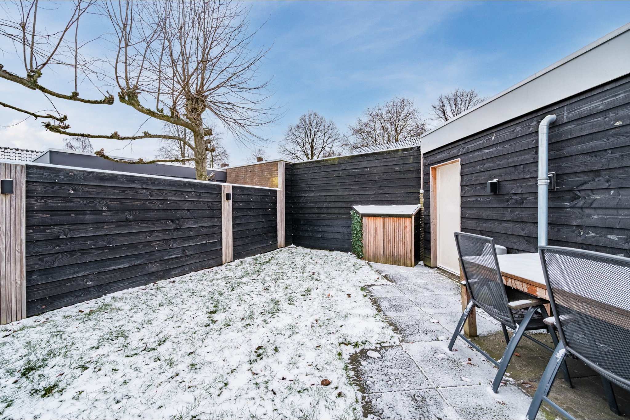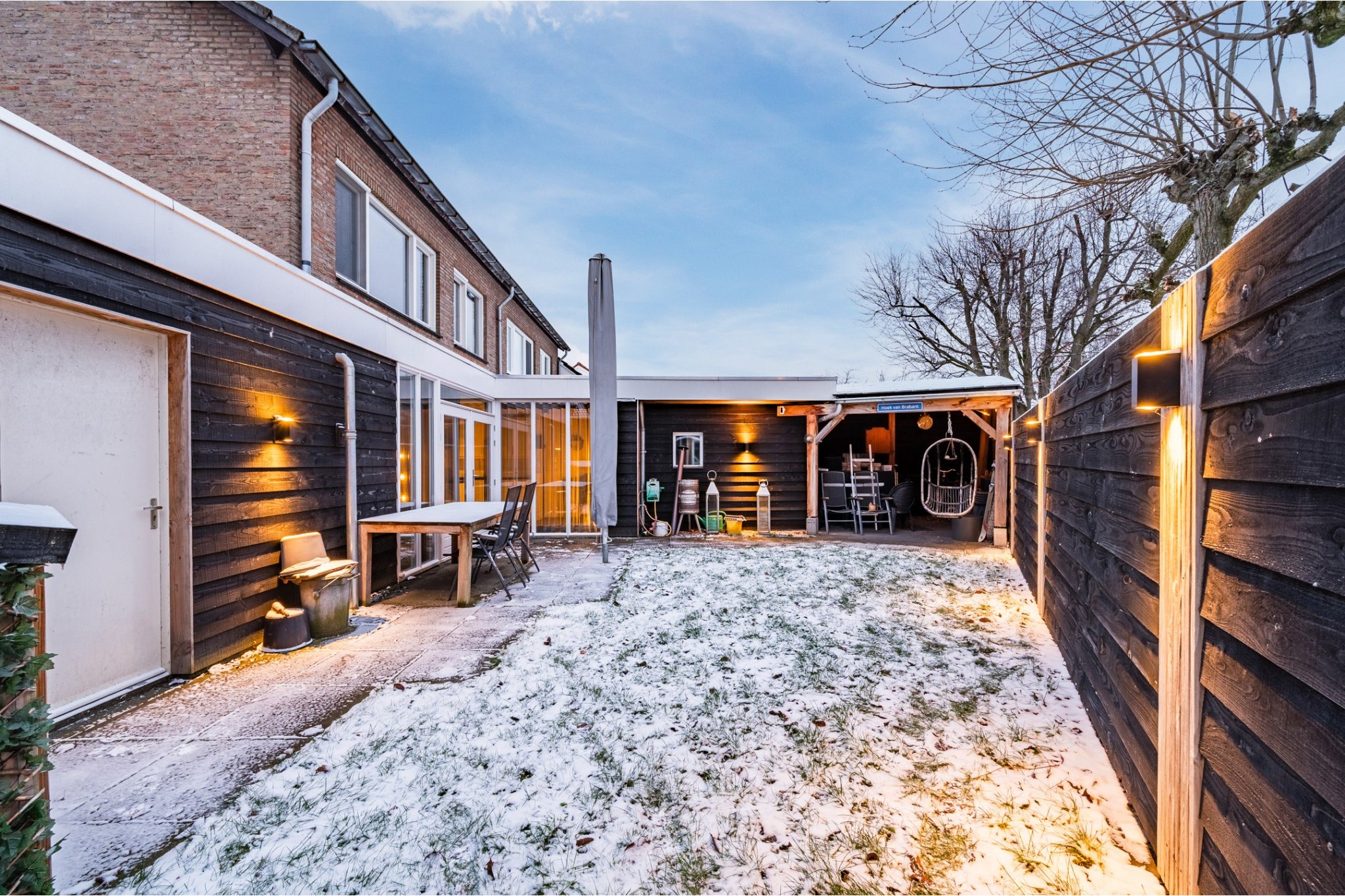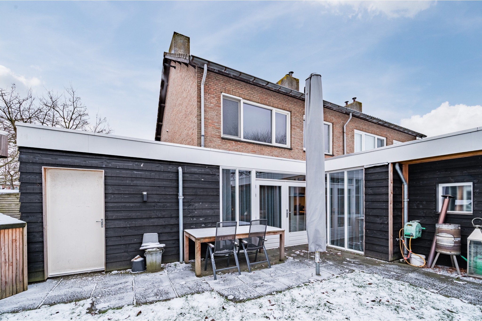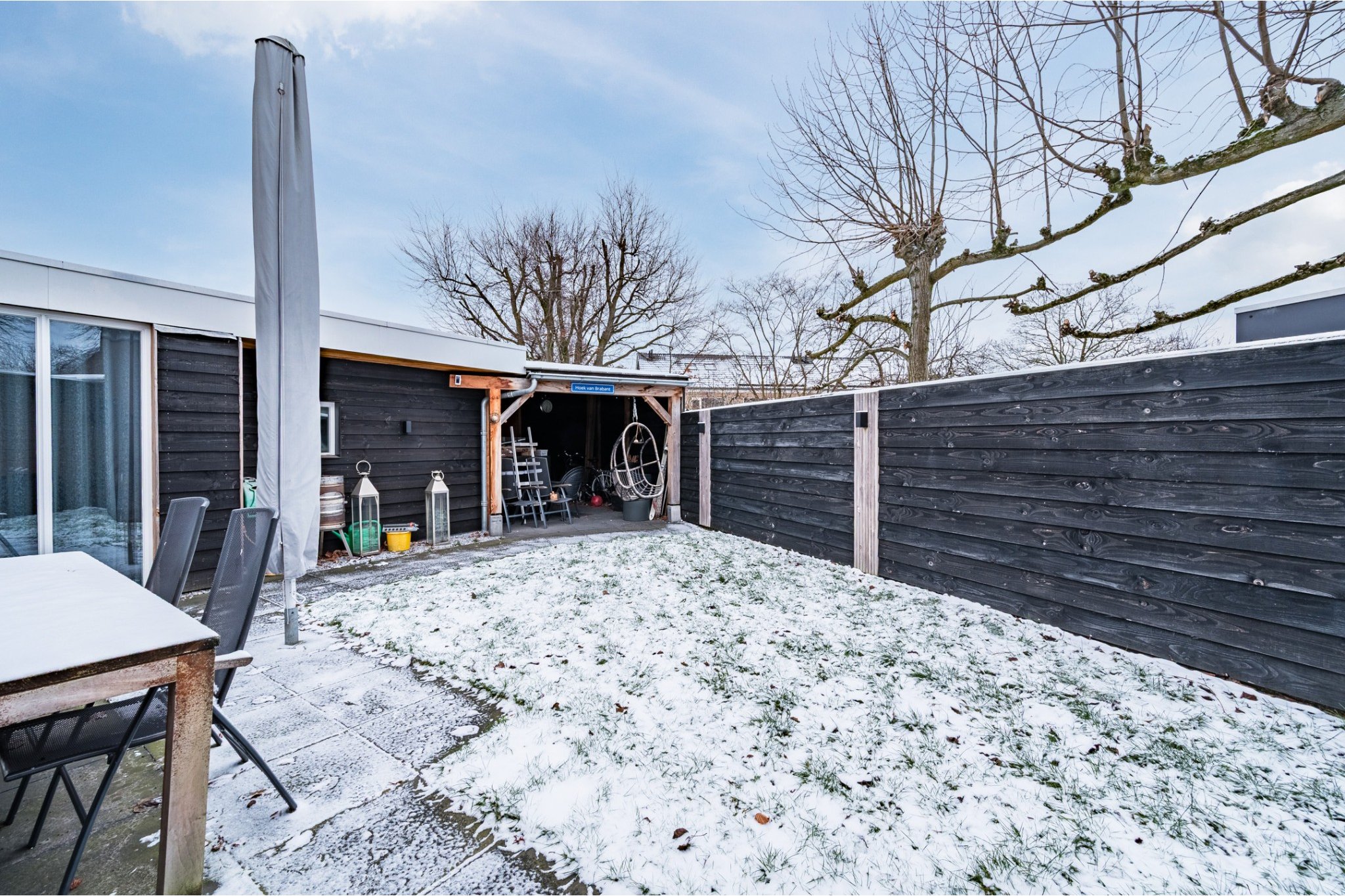 Overkapping (2022) voorzien van een bartafel met 6 barkrukken en beamerdoek.