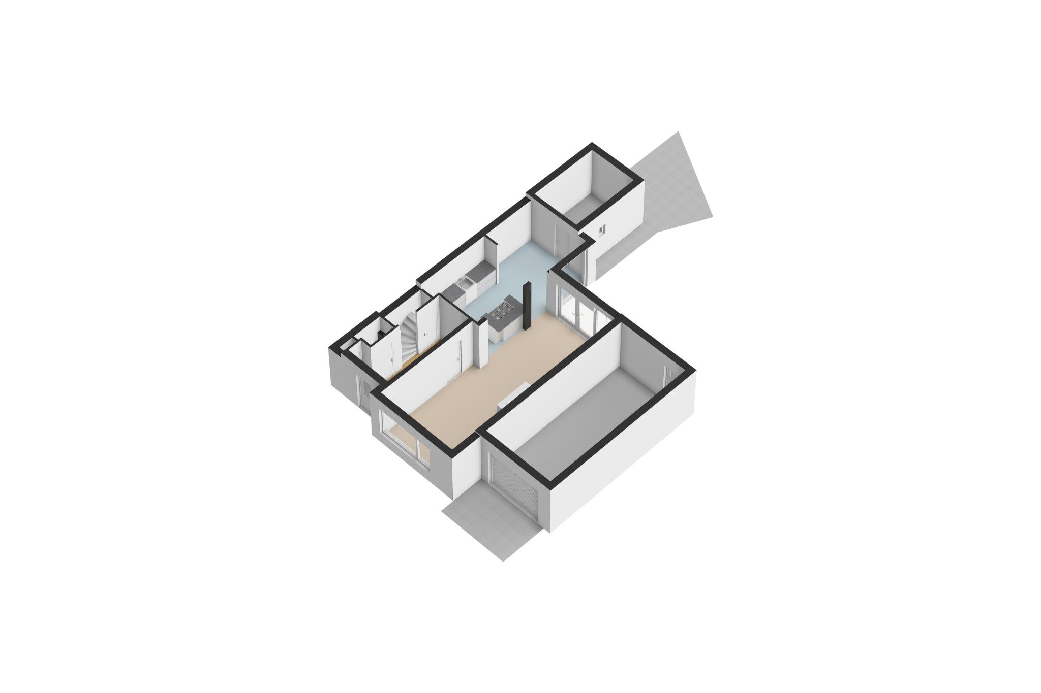 Oprit naar ruime garage, ± 23 m², met keukenblok, tegelvloer, elektrisch bedienbare roldeur en deur naar achtertuin.