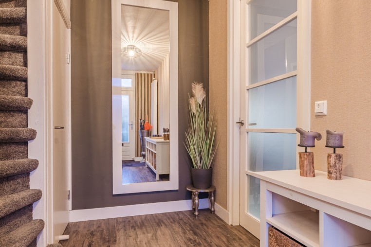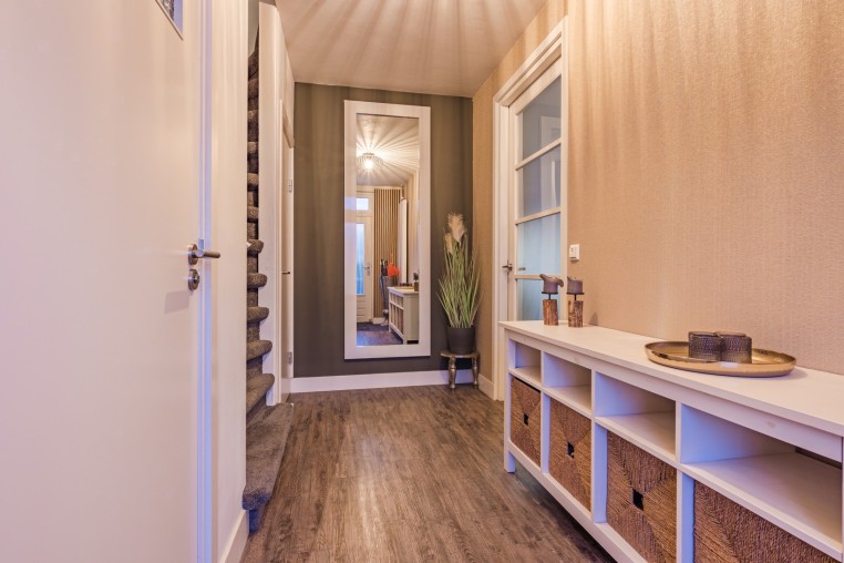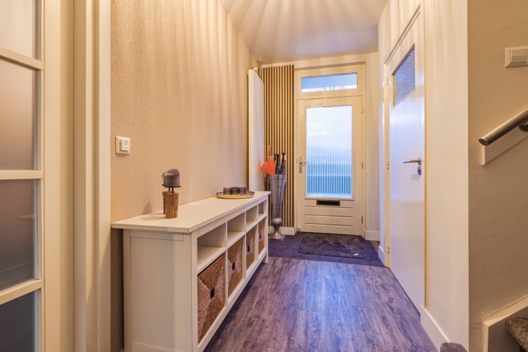 Ruime hal met pvc-vloer, praktische trapkast en meterkast.