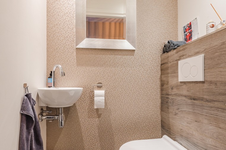 Moderne, luxe deels betegelde toiletruimte met hangend toilet, fonteintje en weggewerkt systeem voor wc-rollen.