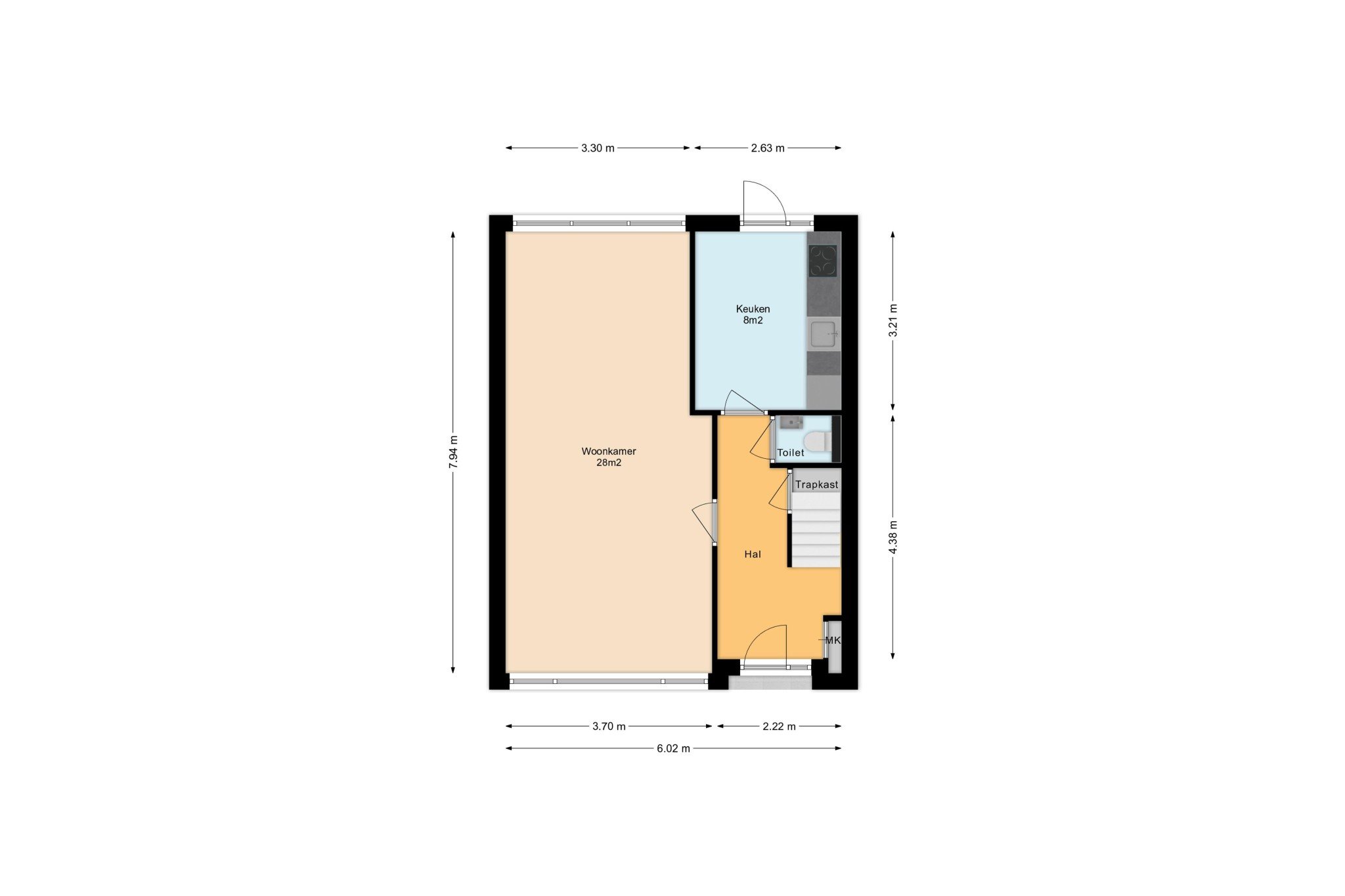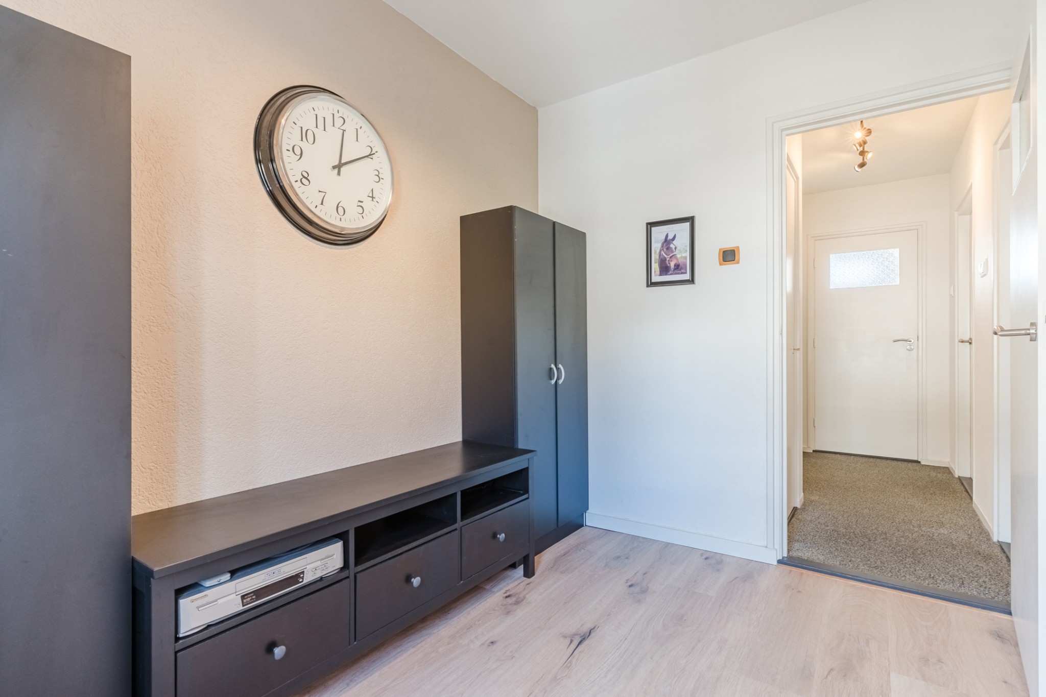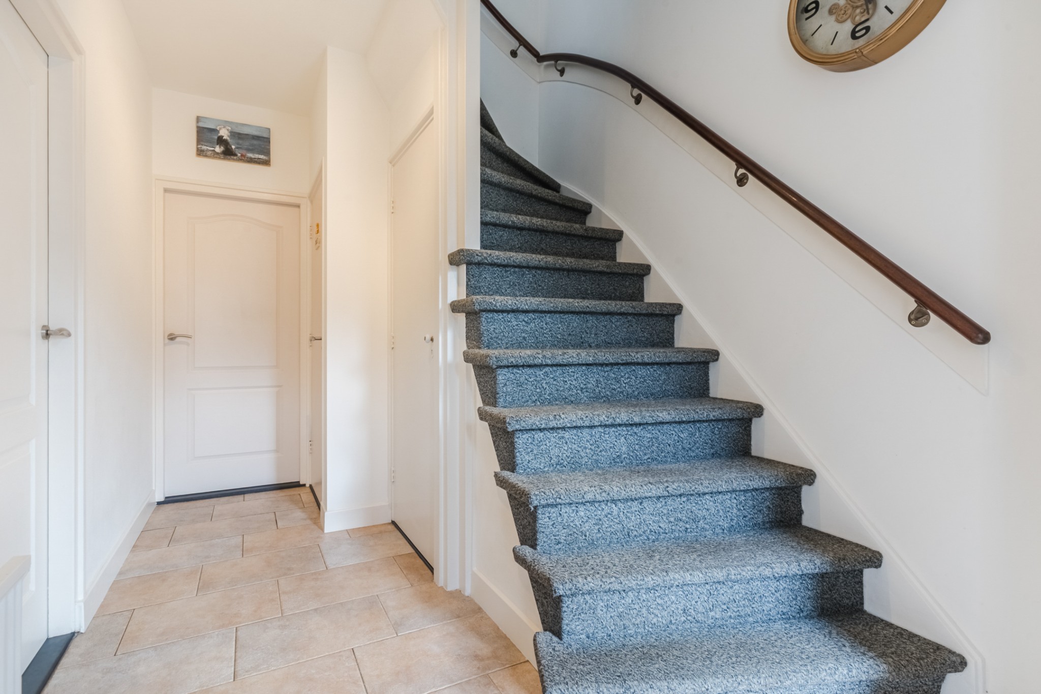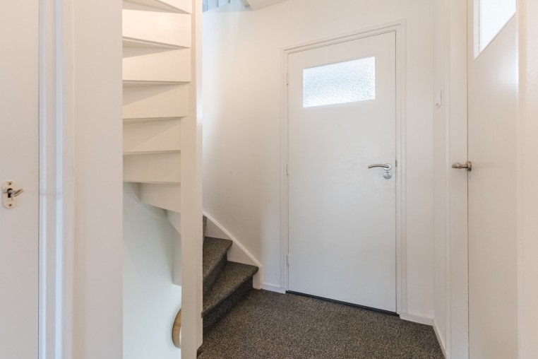 Entree, ruime hal met tegelvloer, meterkast, praktische trapkast en trapopgang naar 1e verdieping.