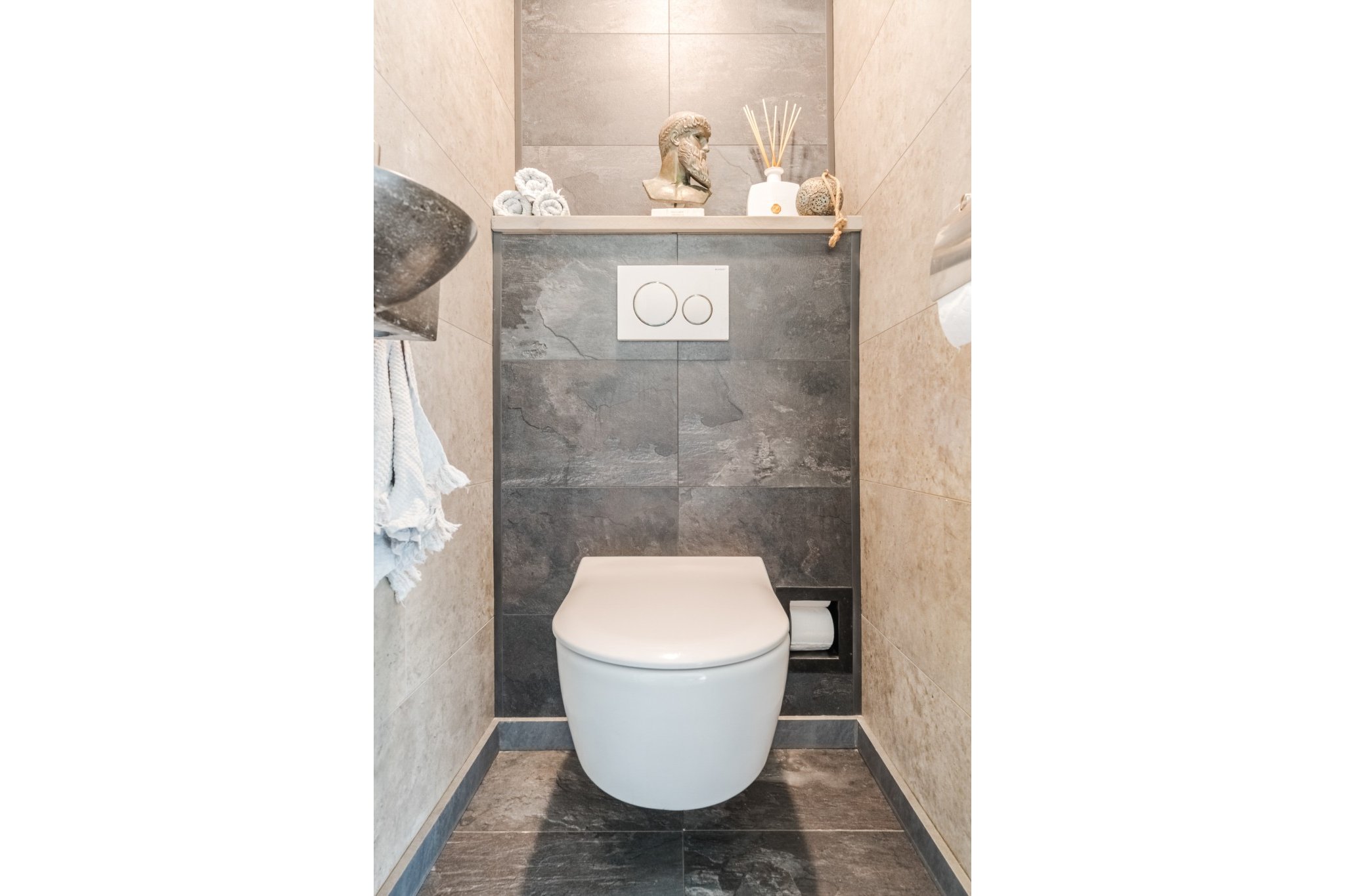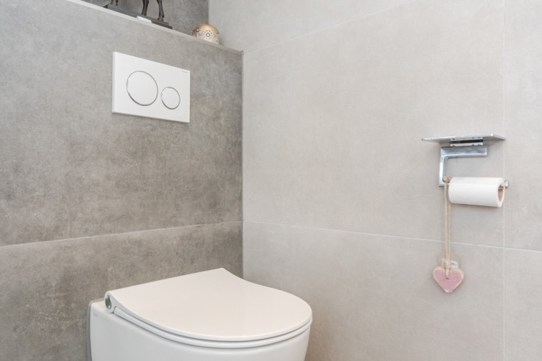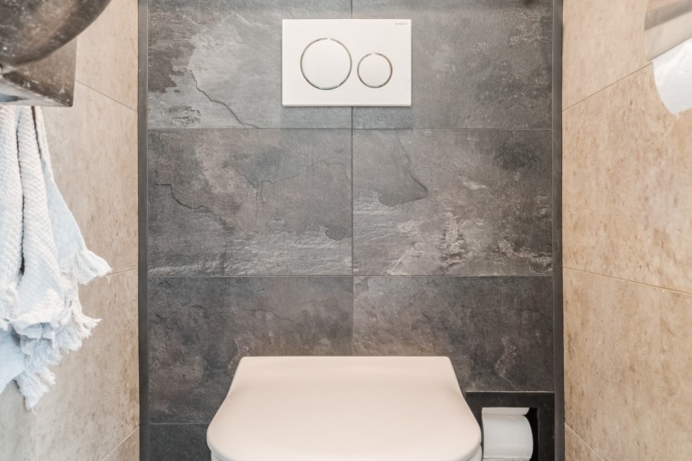 Vernieuwde moderne, geheel betegelde toiletruimte met hangend toilet en fonteintje.