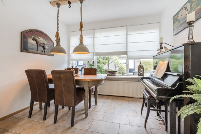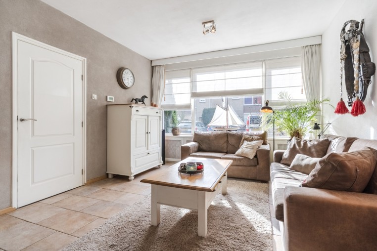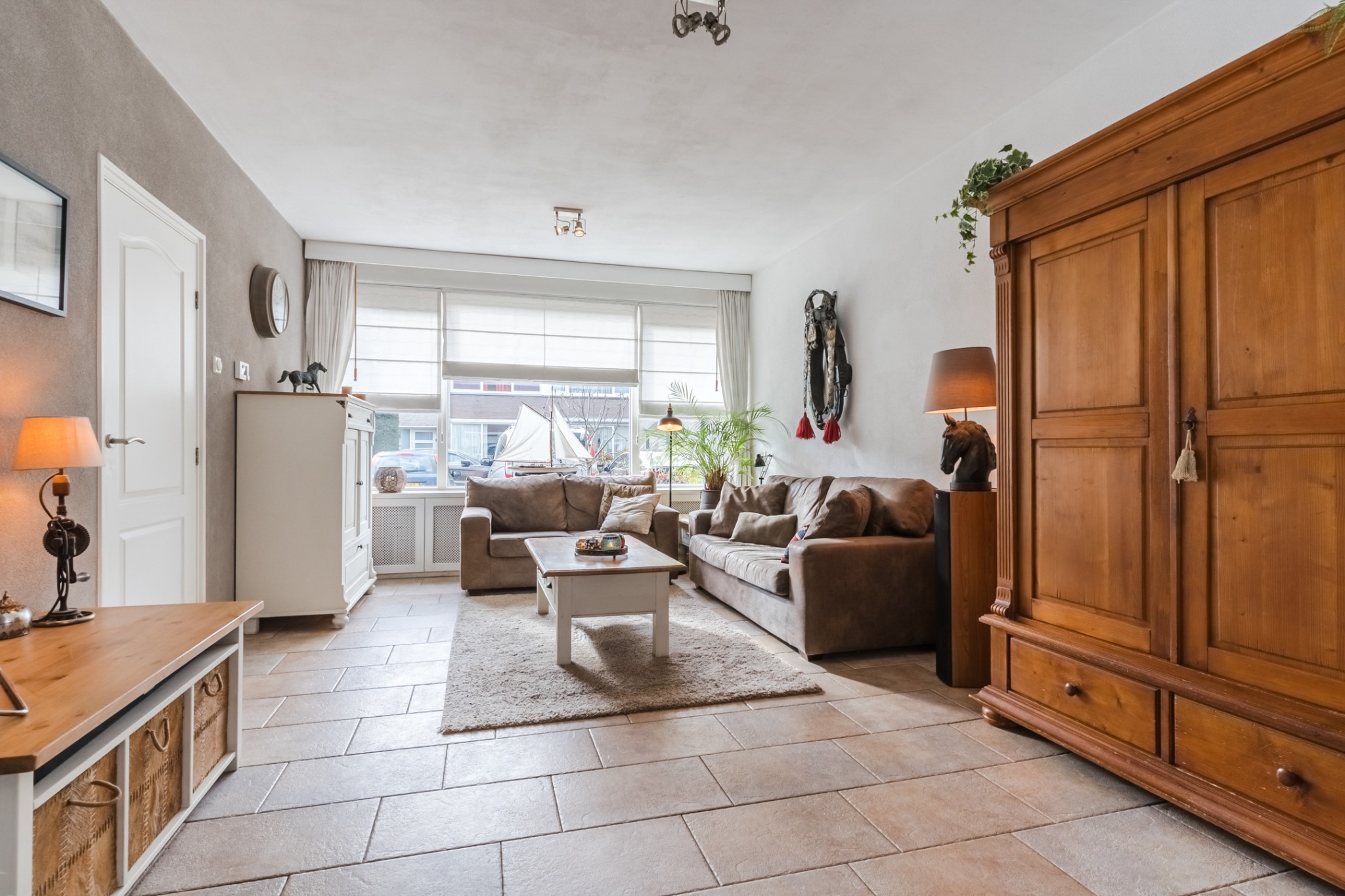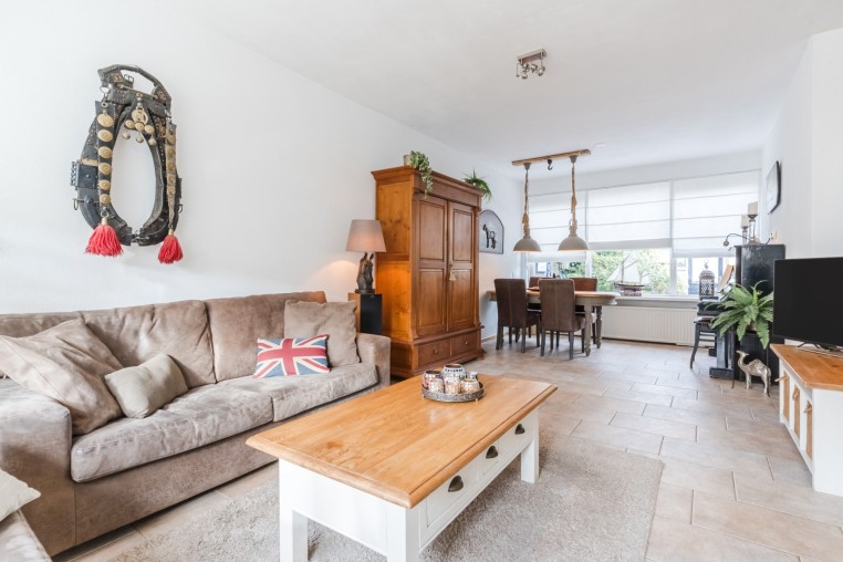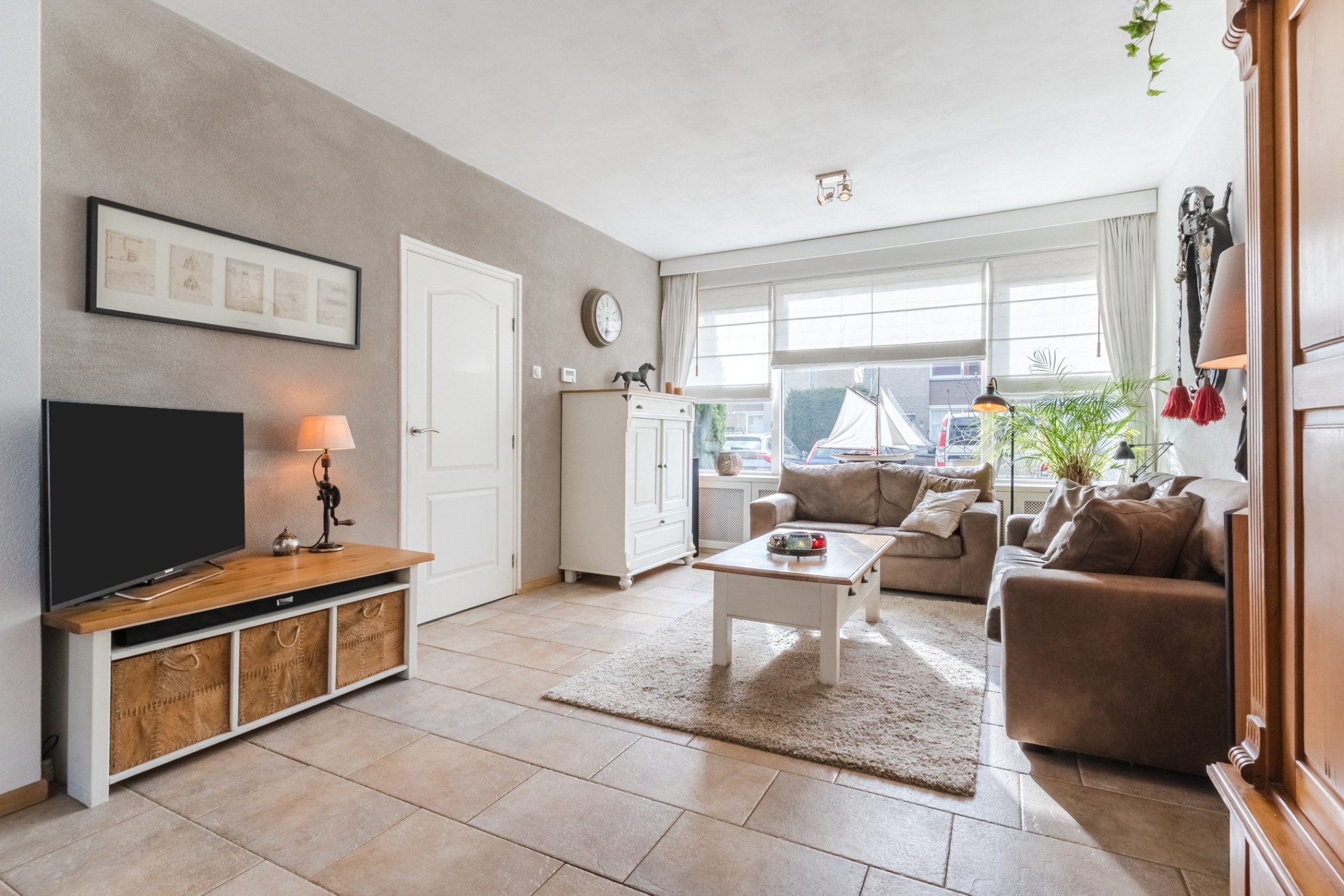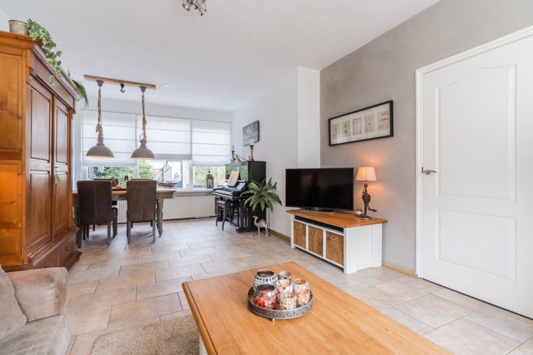 Sfeervolle woonkamer, ± 28 m², met tegelvloer. De achterzijde is voorzien van een zonneluifel en de voorzijde van een screen.