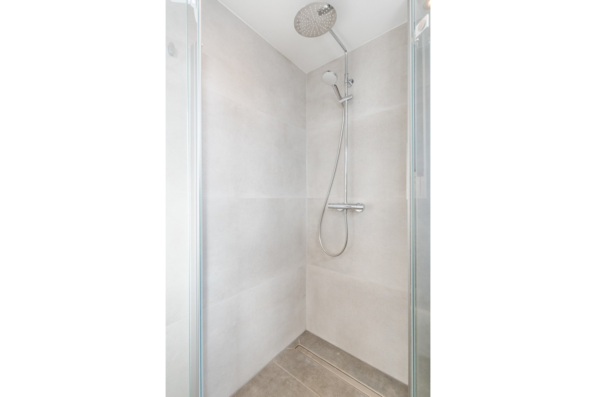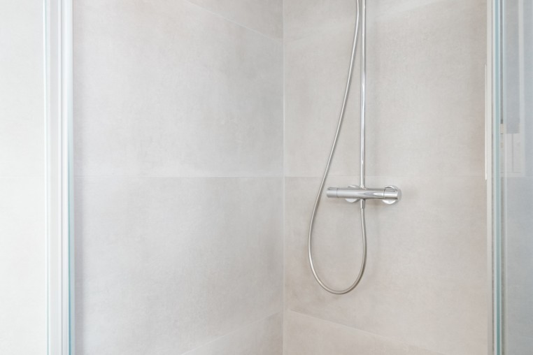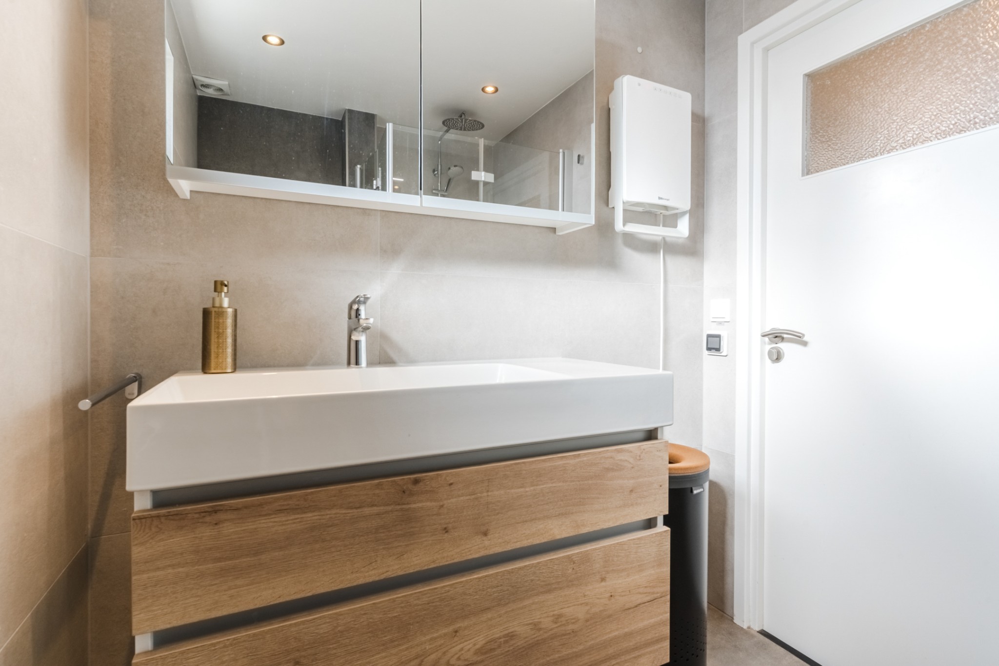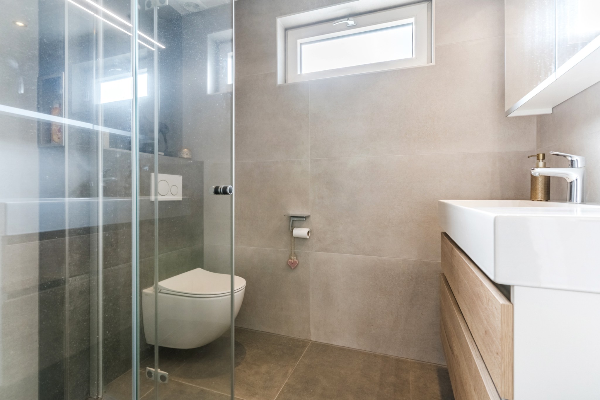 Vernieuwde, moderne, tot plafond betegelde, gerenoveerde badkamer met inloopdouche, badmeubel met wastafel en een hangend toilet.