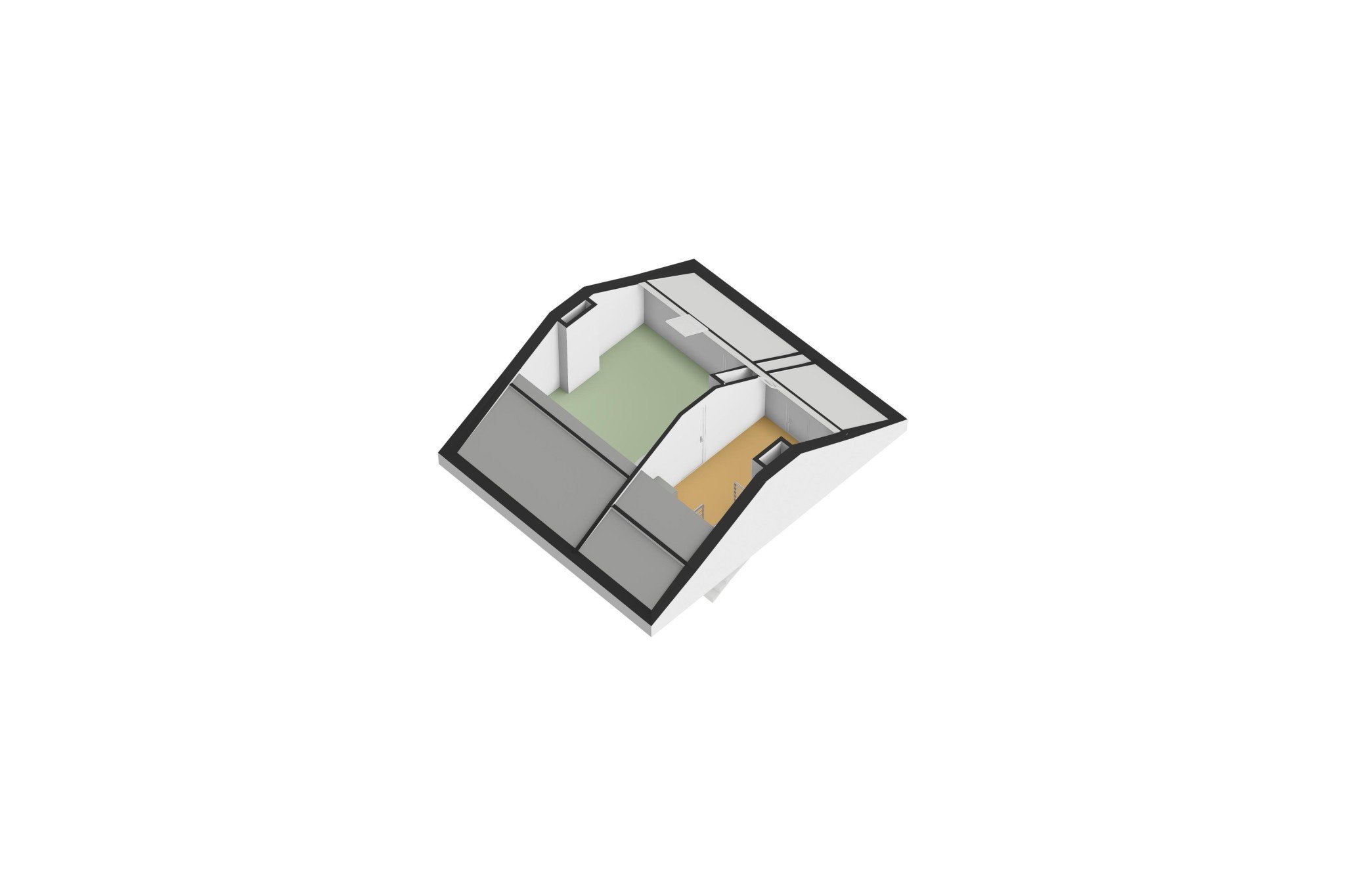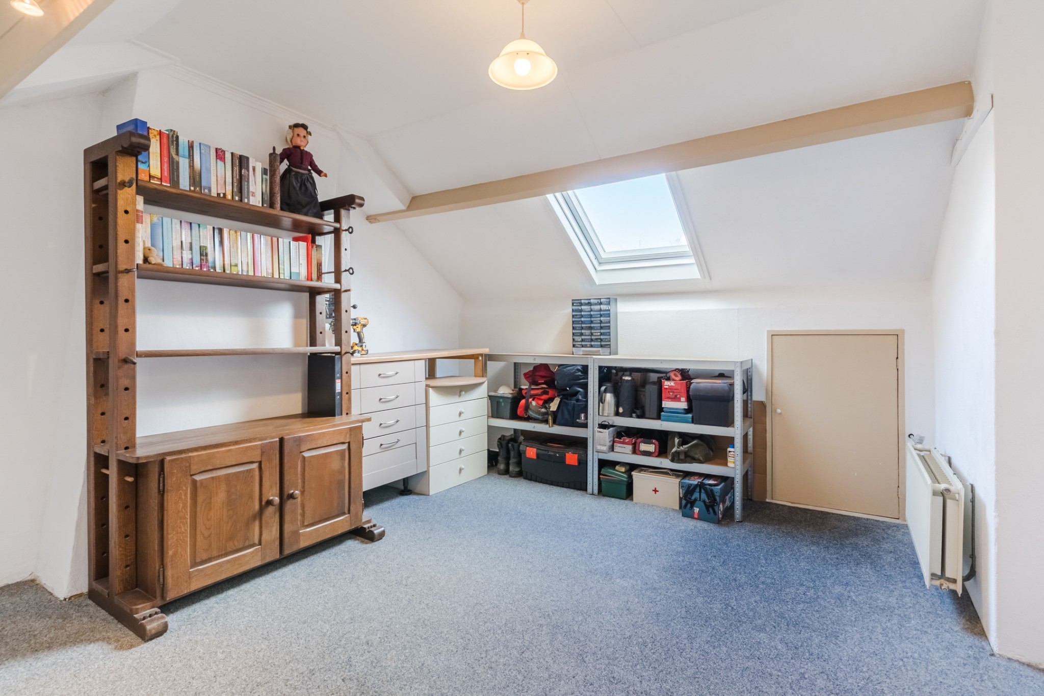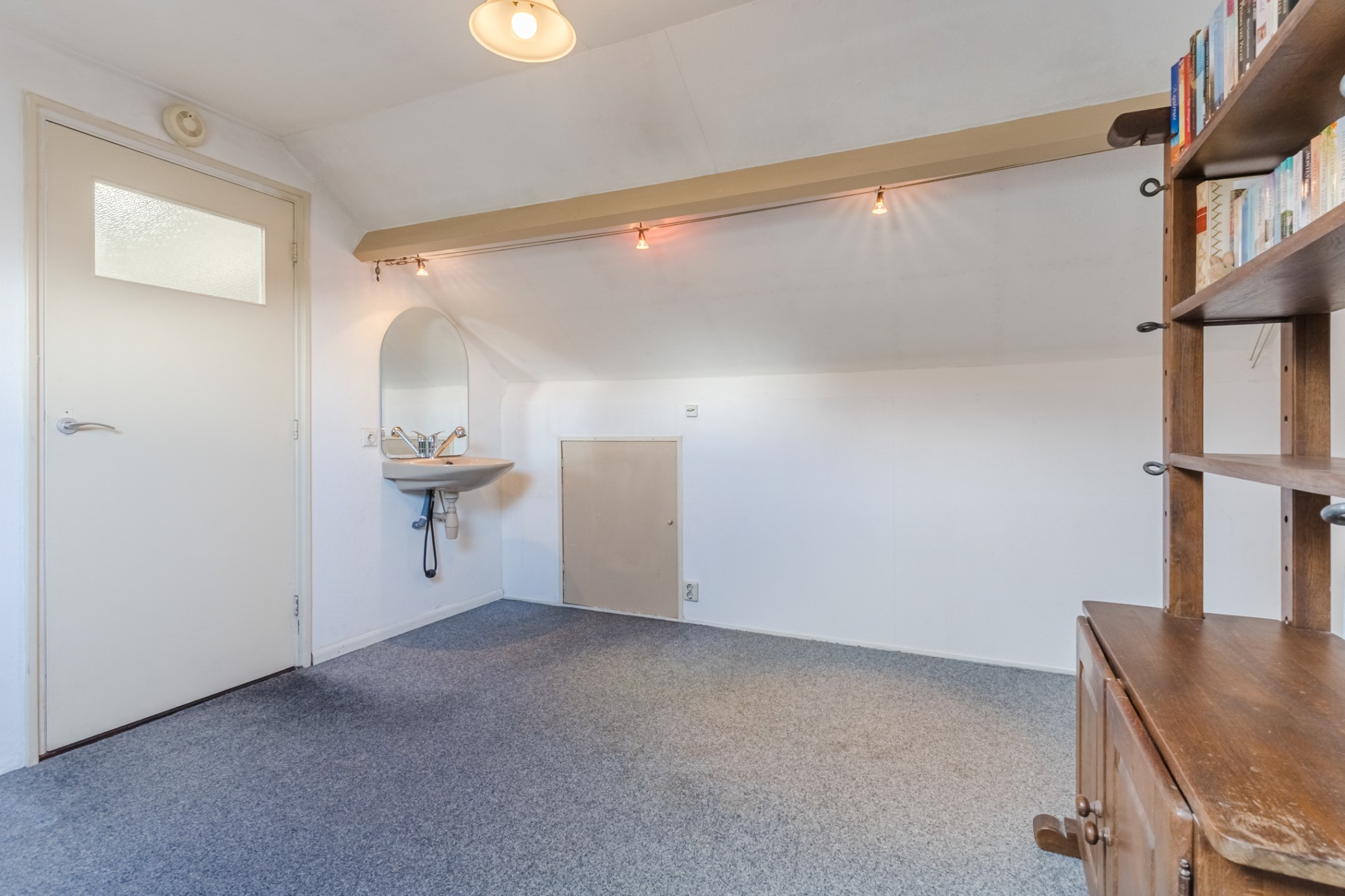 Royale 4e slaapkamer, ± 14 m², met vloerbedekking, Velux dakraam, vaste wastafel en bergruimte onder de kapschuinte.