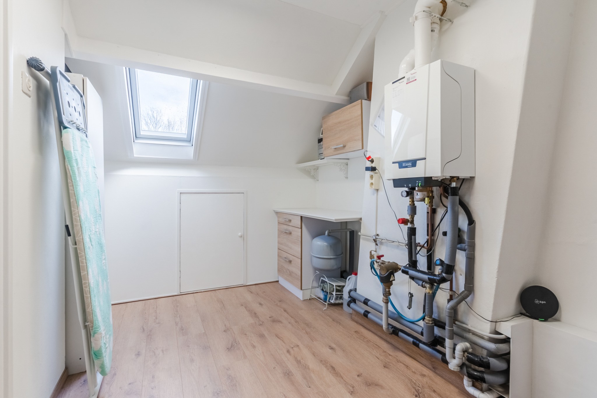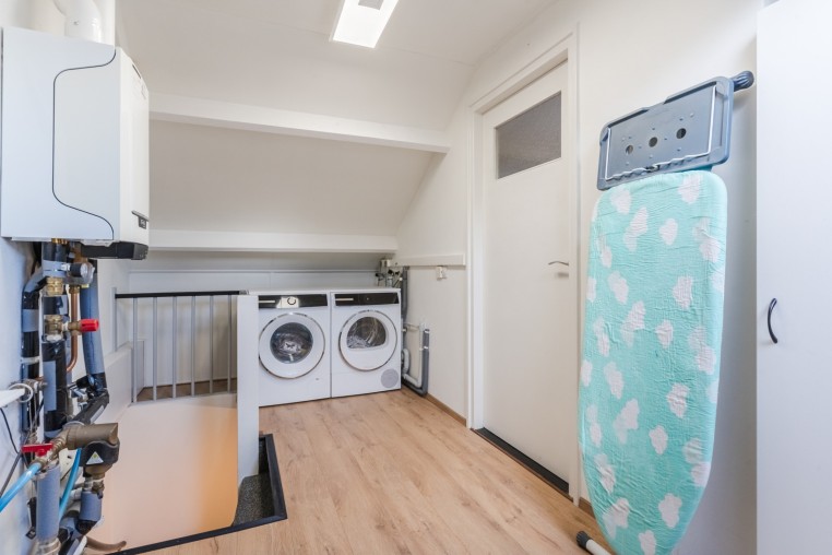 Ruime voorzolder met laminaatvloer, combi-ketel (Remeha Tzerra M 28c Plus, 2017), aansluiting wasapparatuur en bergruimte.