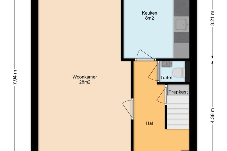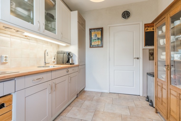 Dichte keuken, ± 8 m², met nette inrichting, diverse onder- en bovenkasten en inbouwapparatuur, t.w.: inductiekookplaat, afzuigkap en koel-/vriescombinatie. De keuken is eveneens voorzien van een tegelvloer.