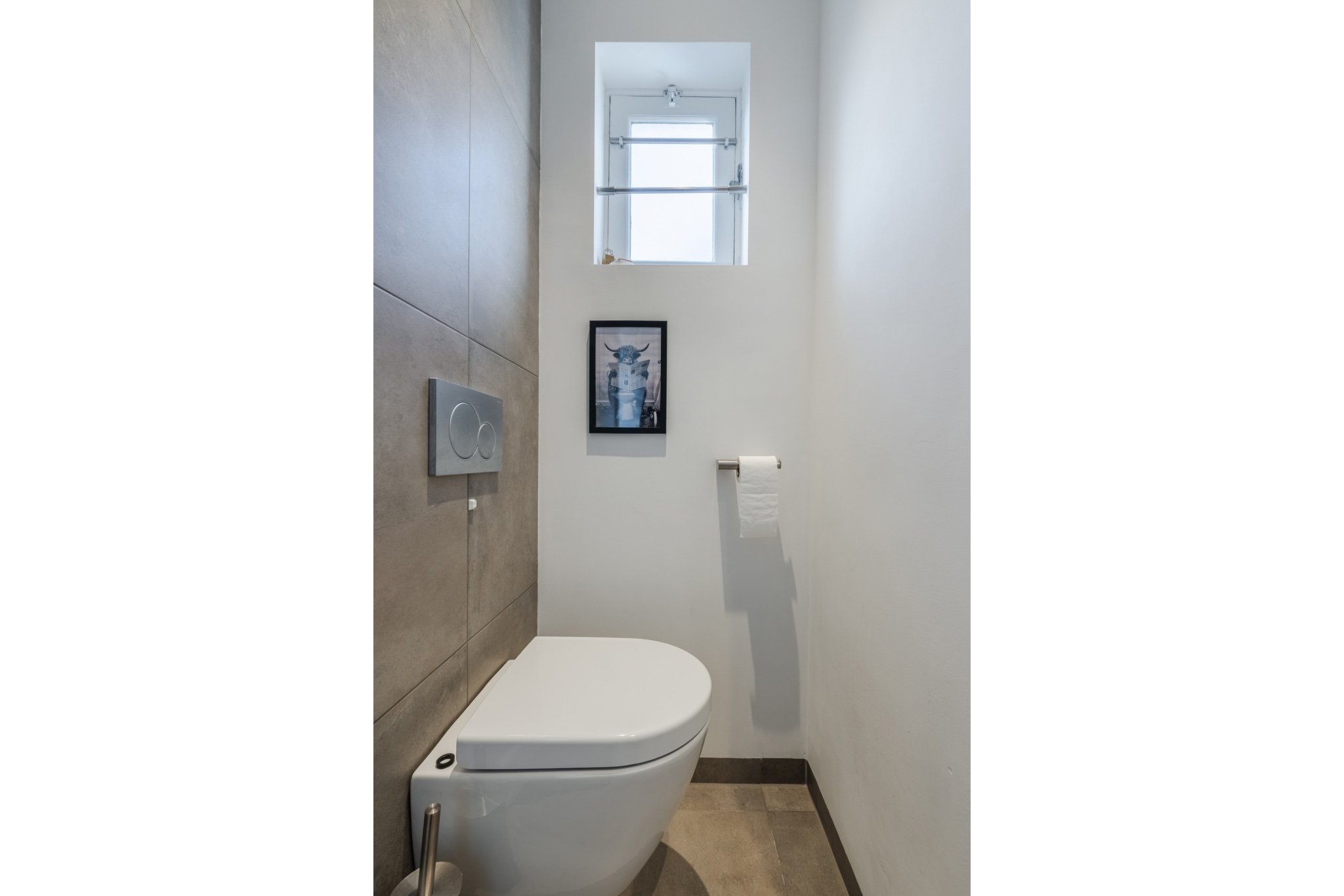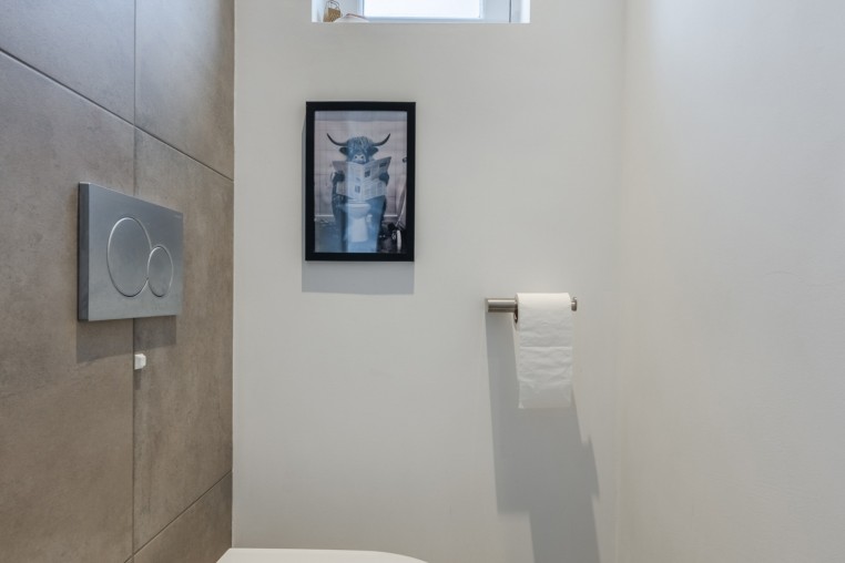 Moderne, luxe deels betegelde toiletruimte met hangend toilet.