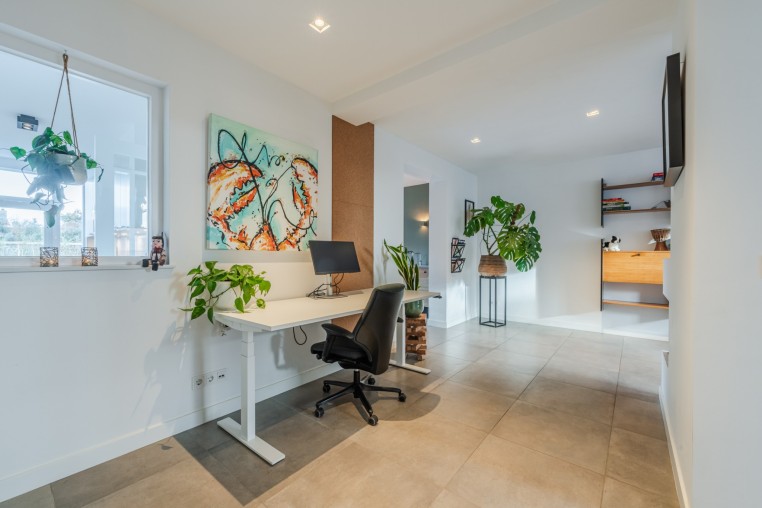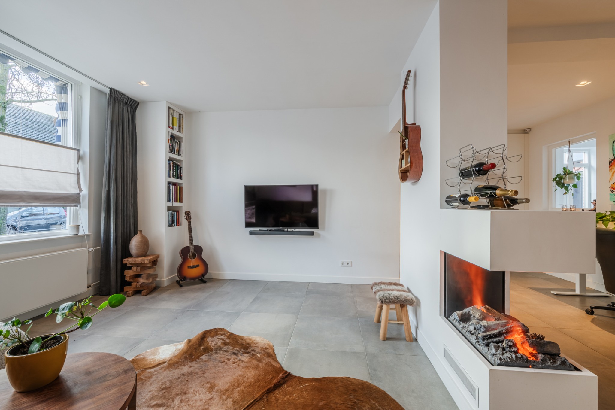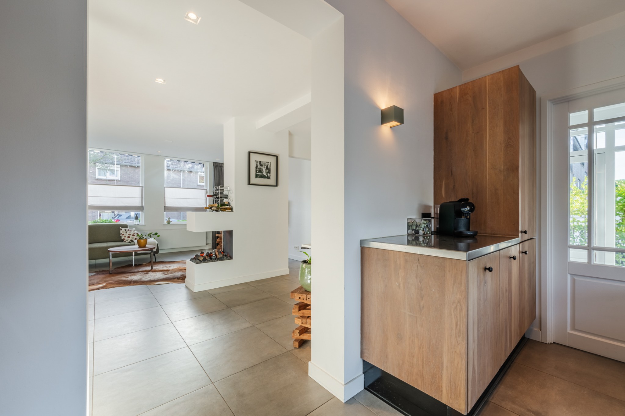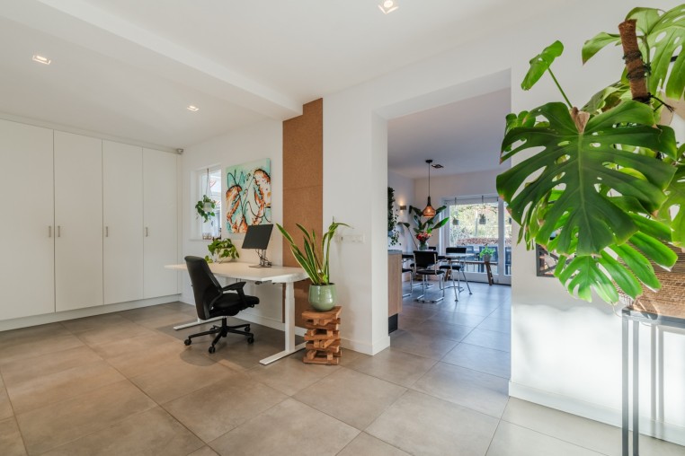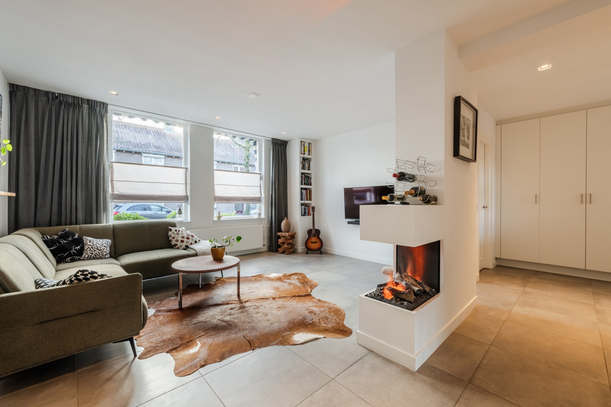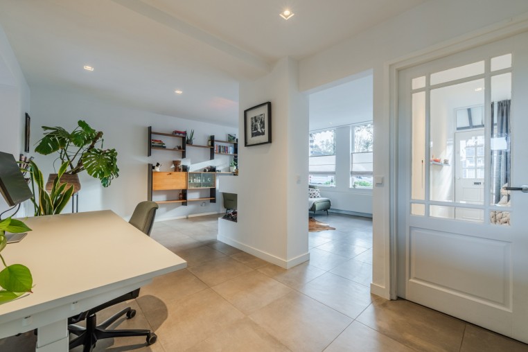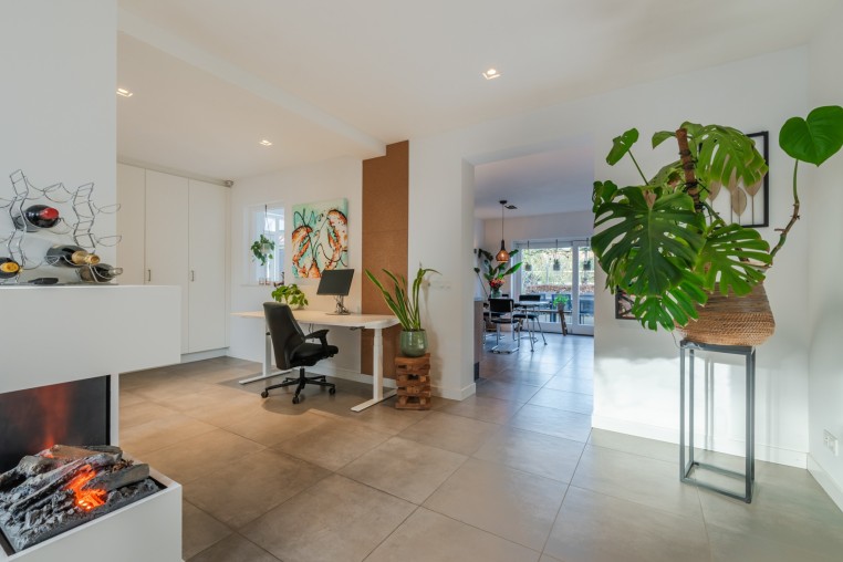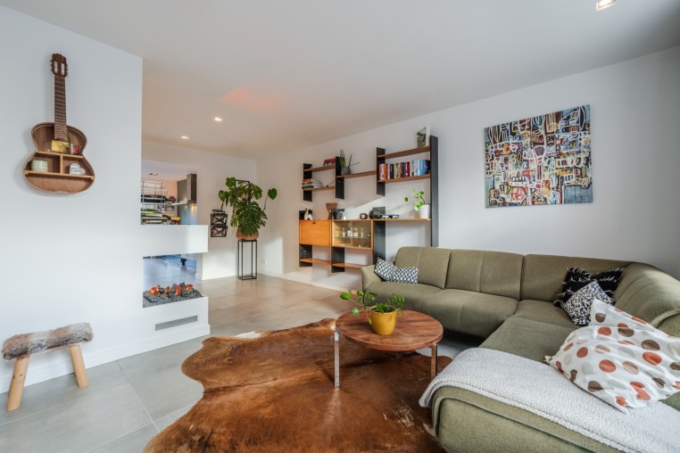 Ruime woonkamer, ± 34 m², voorzien van tegelvloer met vloerverwarming, diverse inbouwkasten, sfeerhaard en strakke stucwerk wanden en -plafond met inbouwverlichting.