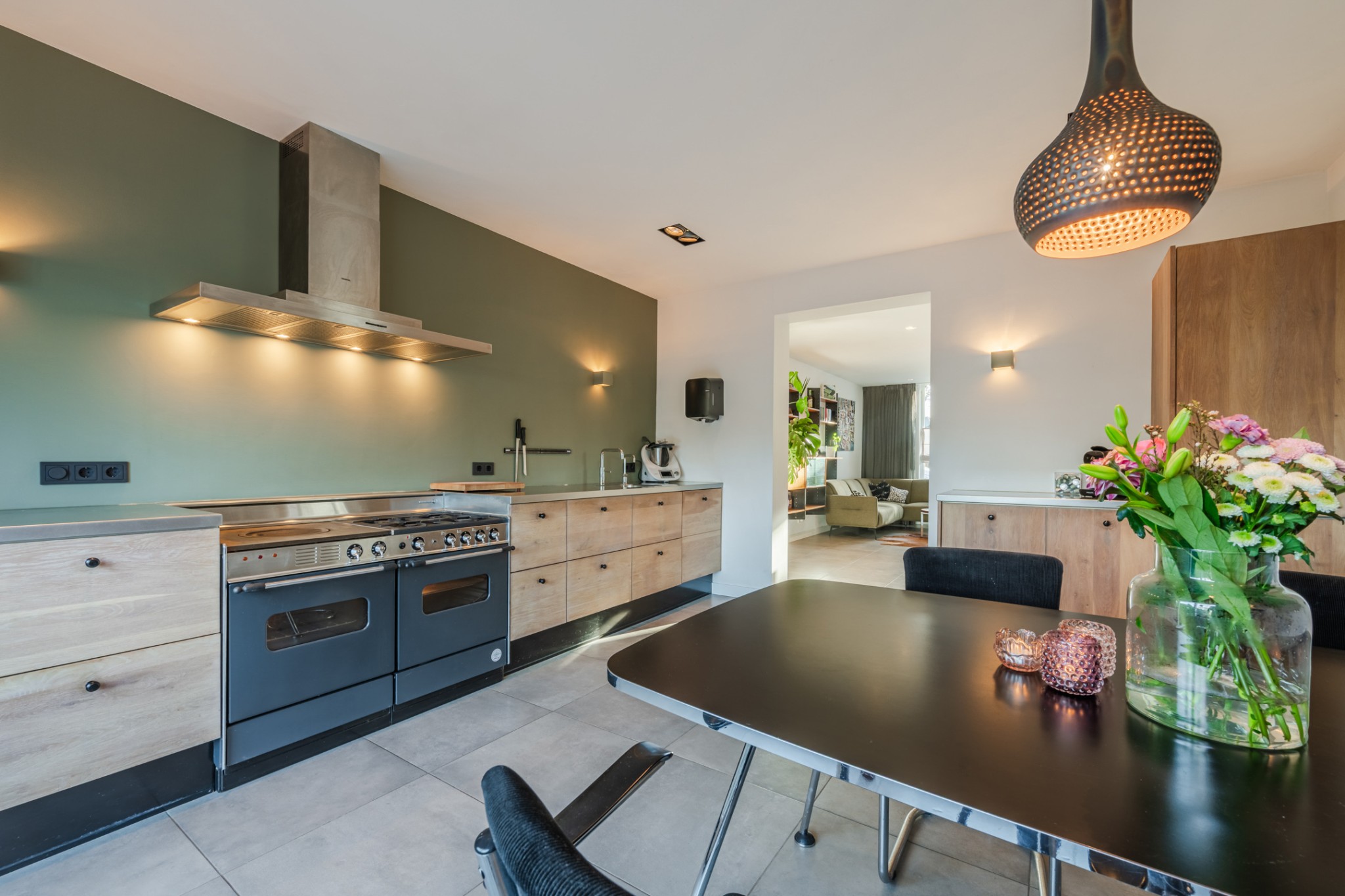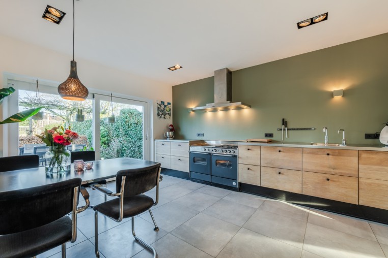 Moderne, semi-open keuken, ± 19 m², voorzien van tegelvloer met vloerverwarming, diverse onderkasten en inbouwapparatuur, t.w.: breed gasfornuis met 2 ovens (rechteroven is defect), afzuigkap, vaatwasser, koelkast, vriezer en Quooker.