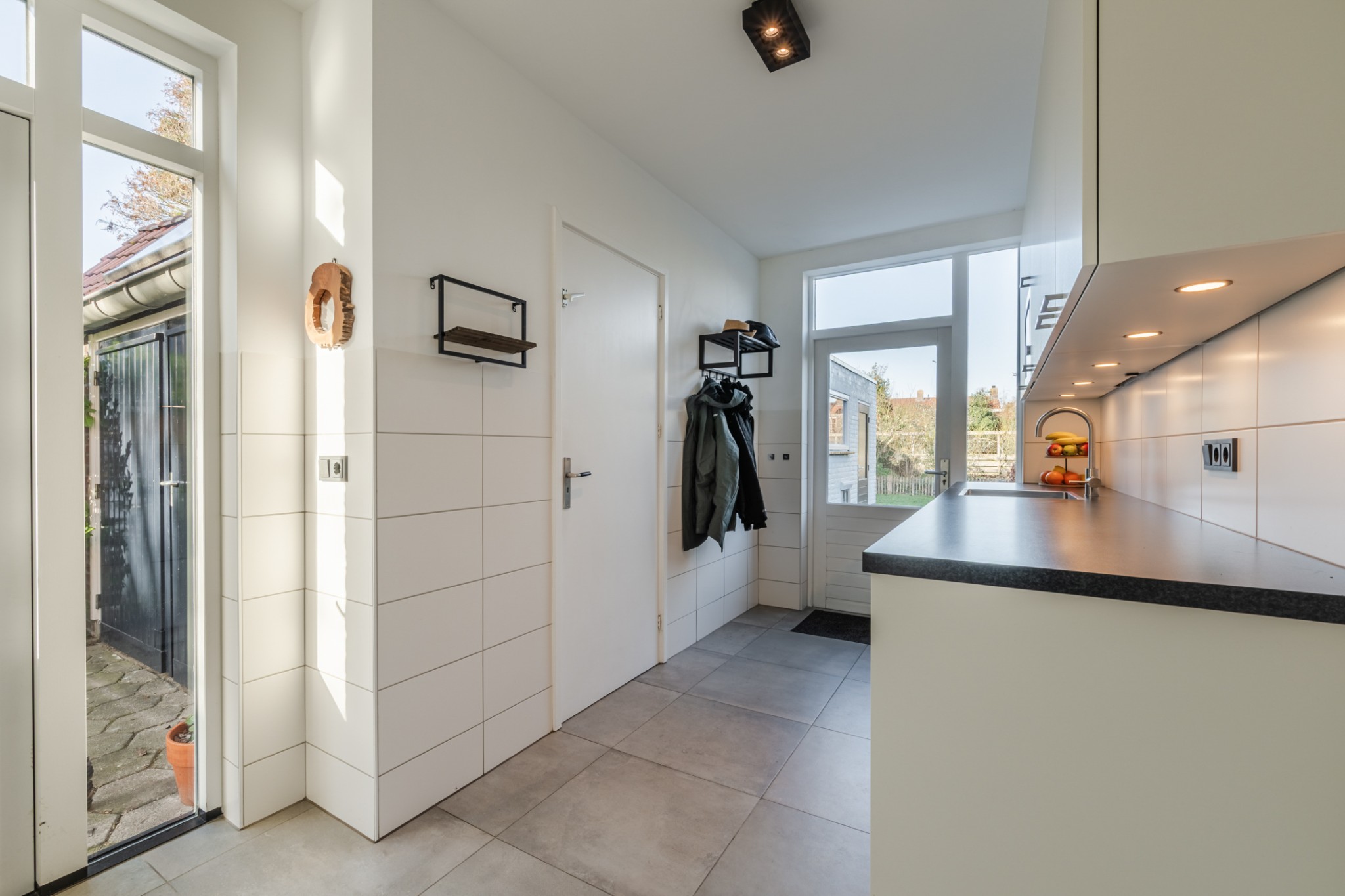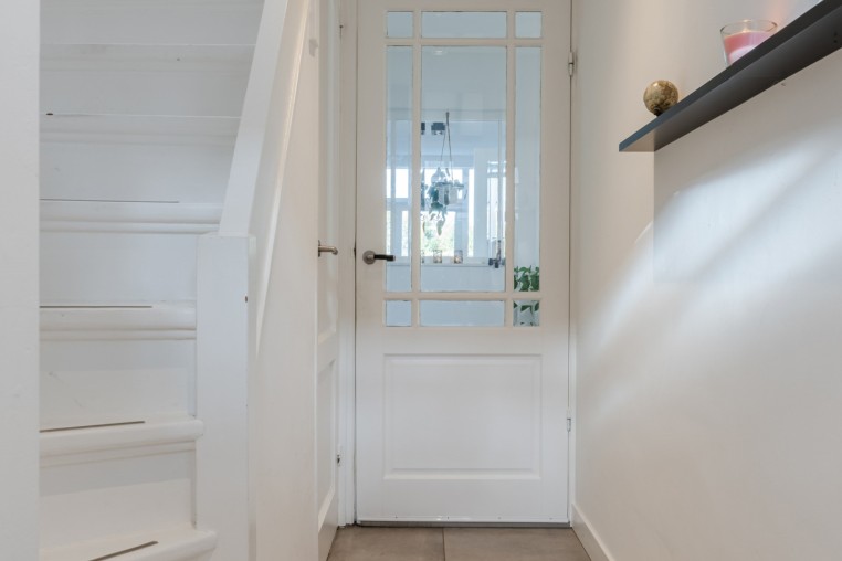 Hal met tegelvoer, praktische kelderkast en meterkast.