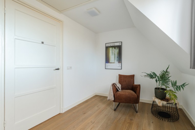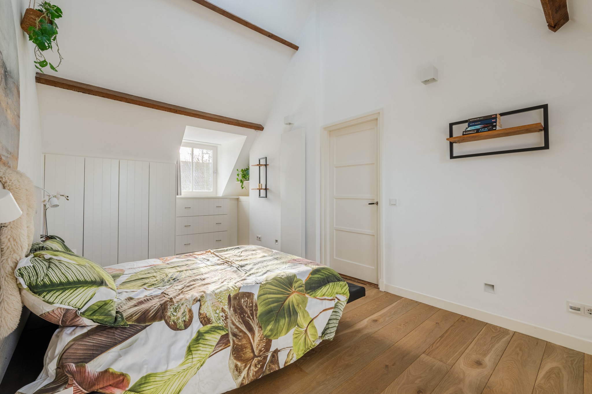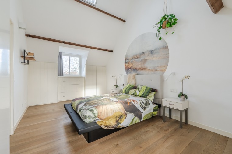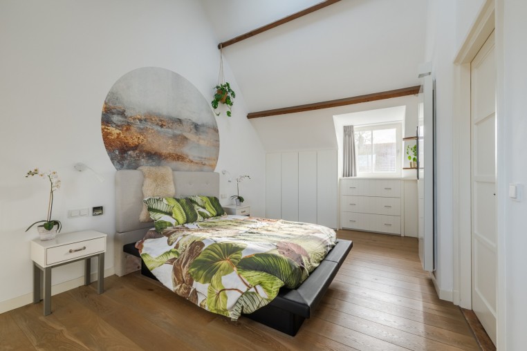 Riante slaapkamer, ± 19 m², met houten vloerdelen, dakkapel, dakraam met elektrisch bedienbaar rolgordijn en diverse inbouwkasten.